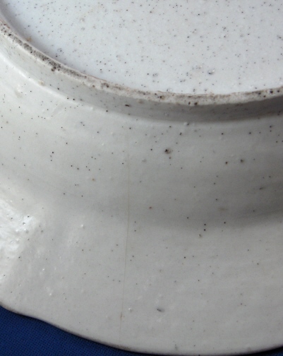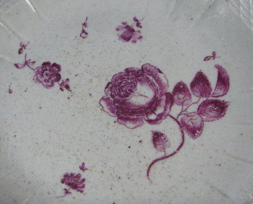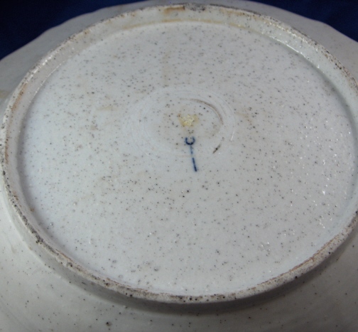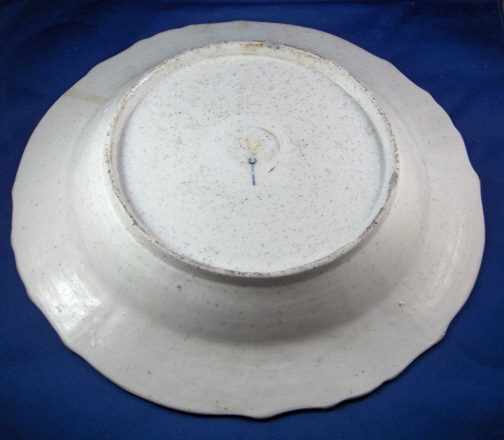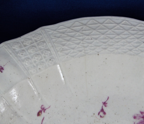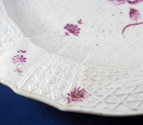 This is a very large plate or serving bowl made by Volkstedt around 1762. This dates right to the early days of this maker since it still shows the issues they had during that time with making porcelain. This is an interesting maker since most people don't know that the owner actually came up with his own formula for hard paste porcelain with no help of any Meissen connection in a direct or roundabout way! This is its own separate thing entirely which is amazing considering the fuss they make about Boettger :) The plate is handpainted with some really nice flowers in puce mostly in the center with a few small ones on the rim. The rim design was copied from the Meissen factory and has relief decorations of flowers and triangles on it. A very typical design which was used by Volkstedt for a famous service during this time. The plate is in great condition with two chips to the footring and lots of small black spots all around as well as a hairline from the edge into the bowl which is very tight. Also a bit of wear to the design mostly on the high points of the black spots. It is marked underneath with the hayfork in blue. The plate is almost 12 inches in diameter which is huge for this time period. Please email me for more information or photos.