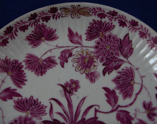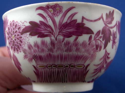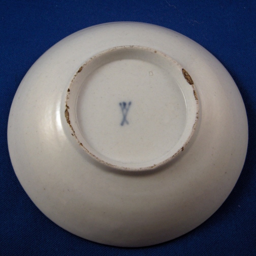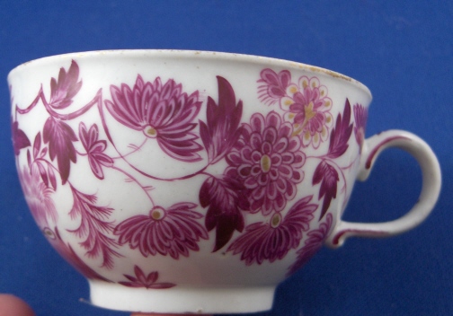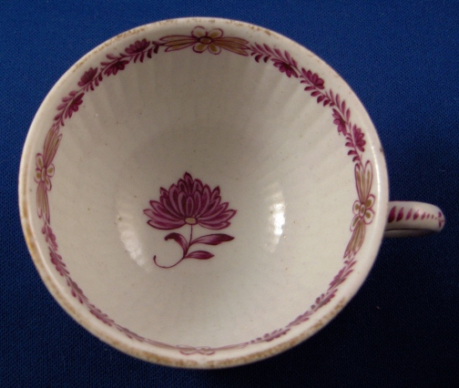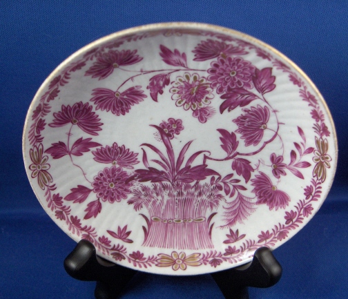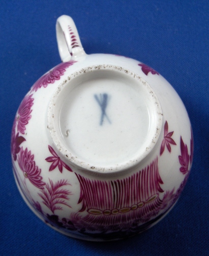 This is a cup and saucer made by Volkstedt around 1760. They are handpainted with the puce Indian flowers motif that was very popular back then. Both have the ribbed design to the paste very common in the Thuringia area makers. The cup is also painted on the inside. The set is in super condition with some light wear and an almost chip to the cup rim where the chip never actually came off. It is pretty small being less than 0.25 inches wide. Gold rim is mostly gone. Both pieces are marked underneath with the crossed hayforks in underglaze blue. The saucer also has an impressed letter G and the cup an impressed S. The cup is 1.75 inches tall and 2.875 inches in diameter. The saucer is 1 inch tall and 4.75 inches in diameter. Please email me for more information or photos.
