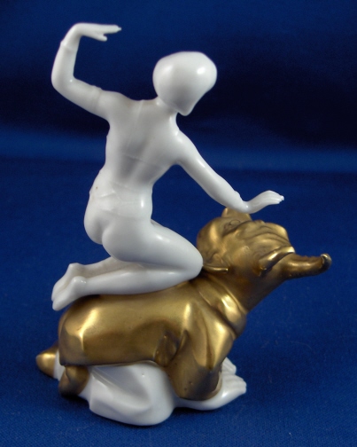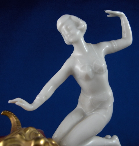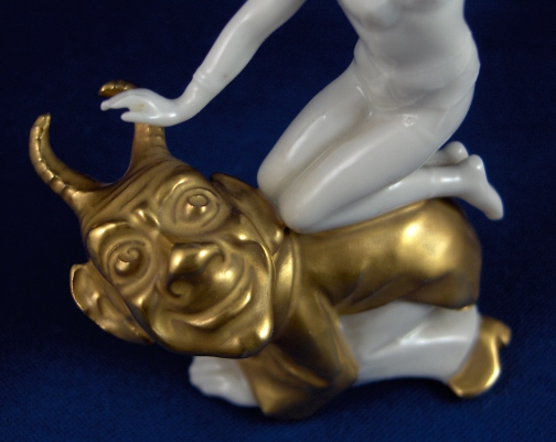 This is a figurine made by Volkstedt around 1925. Volkstedt was founded in 1762 and is one of the few makers of the Thuringia region that are still around today. This figurine is of a lady in a belly dancer type outfit riding a gilded devil. Very much in the Art Deco taste and unlike anything else I have ever seen. I usually prefer the 18th century stuff but this one was a must have :) Surprising amount of detail for such a small figurine. This figurine is in good condition with a small flat chip to the edge which was gilded over and is not distracting at all. The piece is marked with the underglaze mark used from 1915 to about 1936. The piece is 3.75 inches tall, 2.75 inches wide and 1.5 inches deep. Please e-mail me for more information or photos.