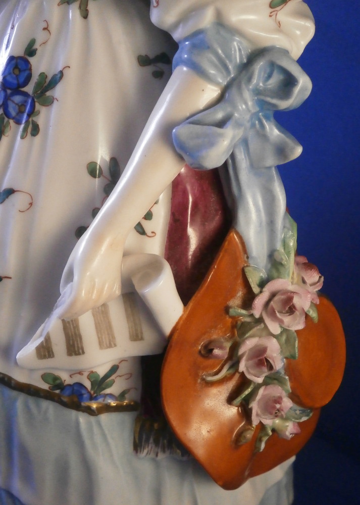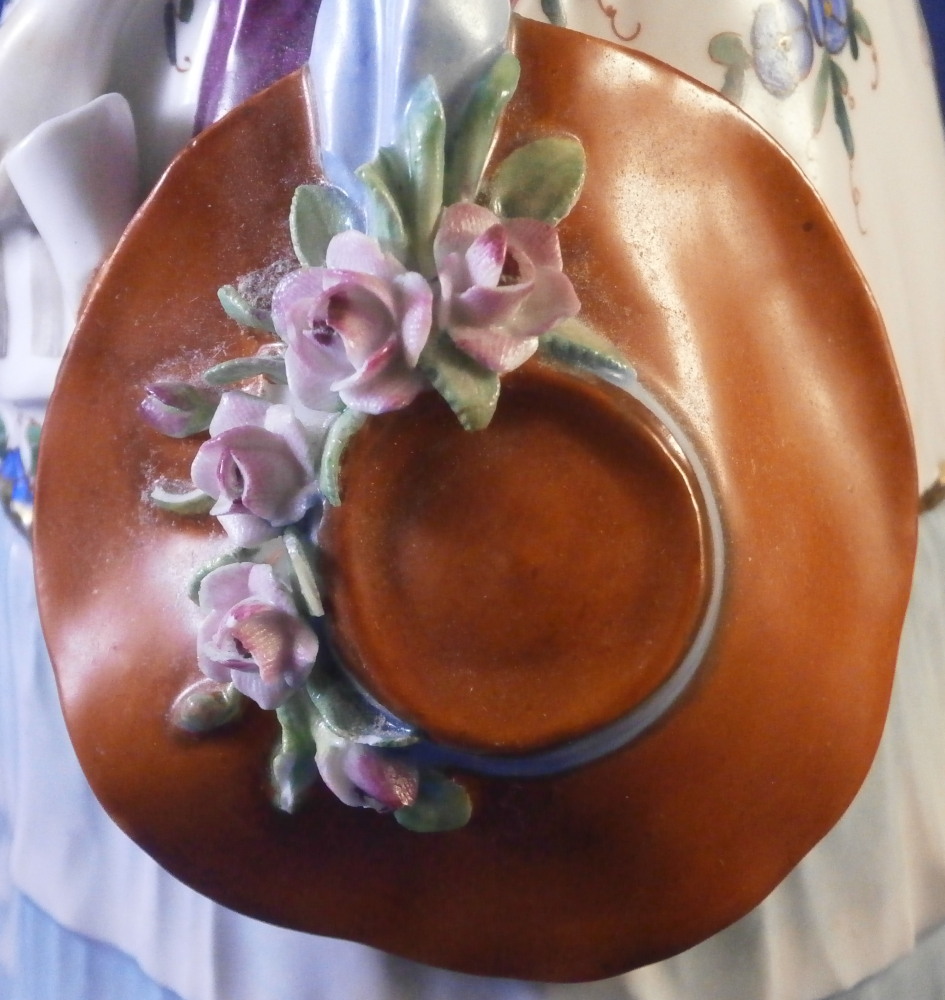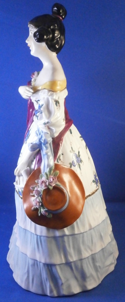 This is a large figurine of a lady made in Germany in the late 19th or early 20th century. I do believe she was made by Volkstedt but the crown over N mark was used by quite a few makers during this period so it could have been another maker. Either way it is a nicely modeled figurine that is hand painted quite nicely. The lady is wearing a very fancy outfit with a rose near her neckline and a hat by her side with a floral garland to it. The figurine is in good condition but does have a diagonal chip to the ltter in her hand and two or three leaves are chipped of the flower garland on her hat. Touch of wear to the gold trim. Neither is super obvious and she displays nicely and looks great! The piece is marked underneath with a hard to make out crown over N I believe. She is 11 inches tall, 5.125 inches deep and 6 inches wide. Please email me for more information or photos.