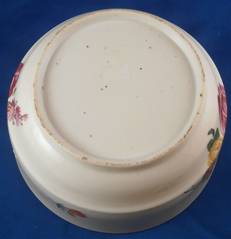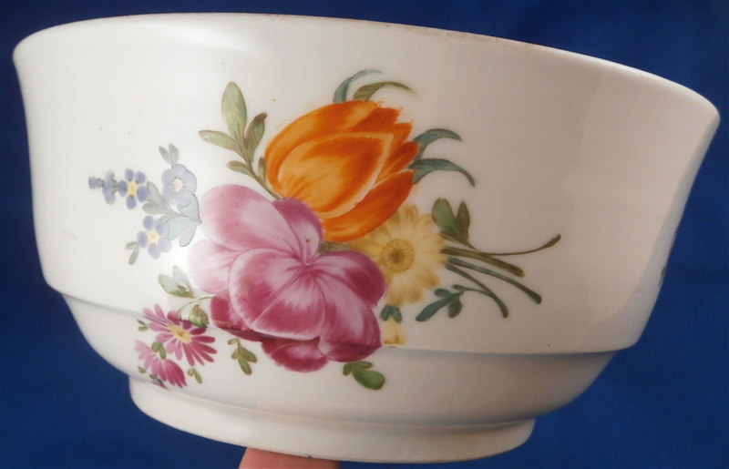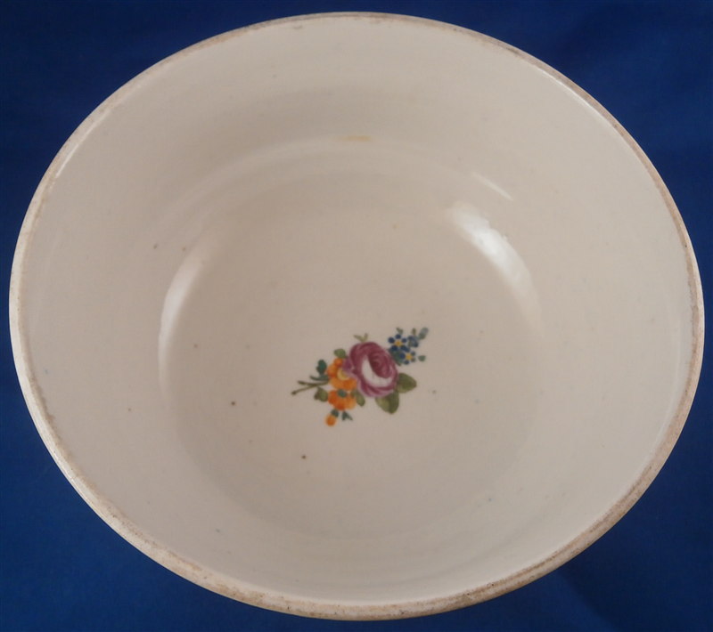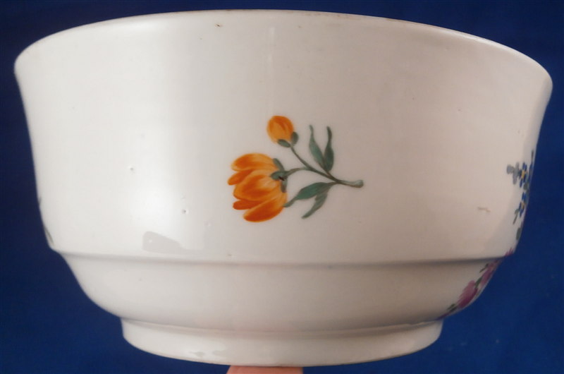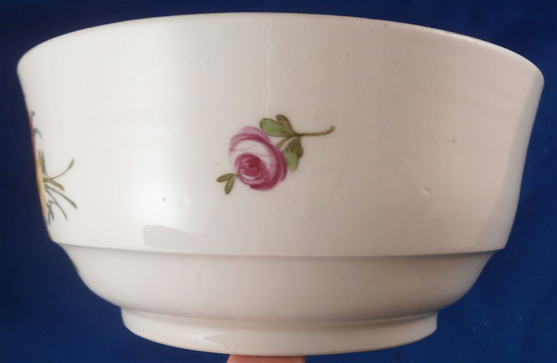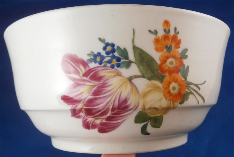 This is a nice slop or waste bowl made in the Thuringia region most likely by Wallendorf or Volkstedt and definitely in the 18th century. It has a ncie shape to it and is handpainted with two nice polychrome floral arrangements on the outside as well as two smaller flowers and a small arrangement on the inside bottom of the bowl. The bowl is in perfect condition with some firing marks normal to these pieces. It is 2.875 inches tall and 6.375 inches in diameter. Unmarked underneath but between the painting style, the colors and the paste it has to be either one of these two makers! Please email me for more information or photos.
