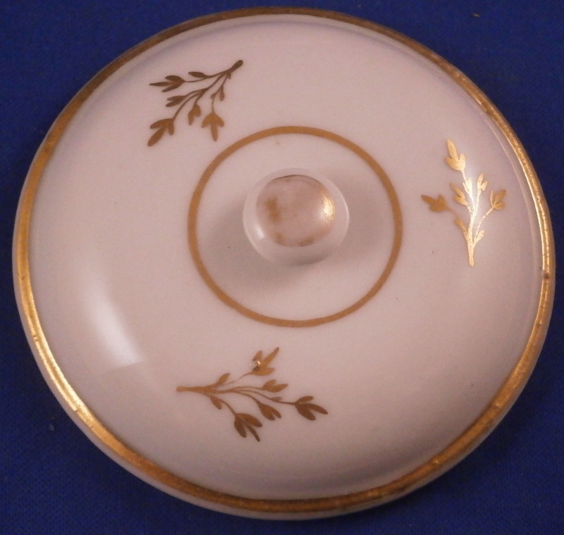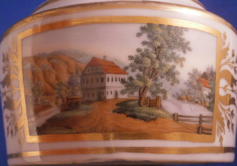 This is a really nice lidded sugar pot or trinket dish made most likely by Volkstedt or possibly Wallendorf or one of the other Thuringia makers in the 18th century. The main body is nicely hand painted with a polychrome landscape scene to the front with some gilding to either side and a gold branch to the back as well as three more to the lid and a bit of gild trim. The scene includes buildings, trees, a river and lots more detail. The piece is in great condition with some minor wear to the gilding and a hard to spot star glaze crack that does not go through to the other side. The piece is not marked underneath which makes identification a little touch but it is definitely from this region and period. The pot and lid are 3.125 inches tall and 4 inches in diameter. Please email me for more information or photos.
