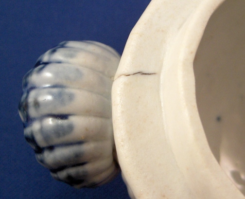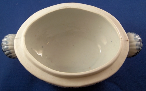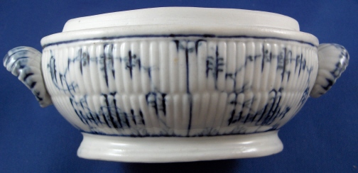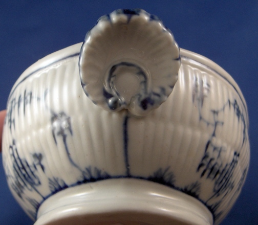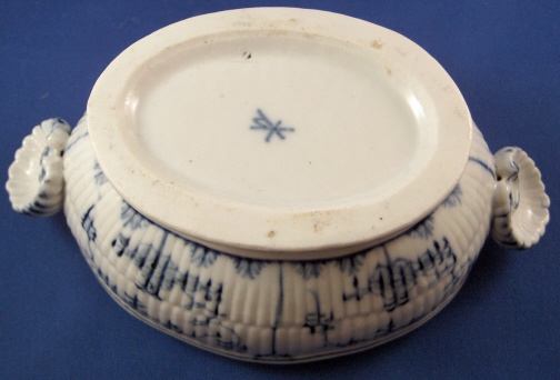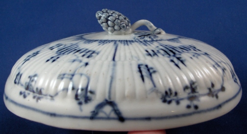This is a sugar dish made by Volkstedt around 1770. It is handpainted with an underglaze blue strawflower design and has the typical ribbed design to the paste. I have not seen this shape before and it is nice to have one with the lid and both being in superb condition! It is marked underneath with the underglaze blue crossed pitchforks with the line across mark. The sugar bowl is in superb condition with some firing flaws to the paste the most noticable ones being two firing crack - one on either side above the handle but both are hidden by the lid and just a sign of age on these pieces as they are common on early Volkstedt. The finial in the shape of a grape is very nice and the shell handles are a bit odd but nice as well. The lid is a bit loose. The piece is 3.75 inches tall, 6.75 inches wide and 3.75 inches deep. Please email me for more information or photos.