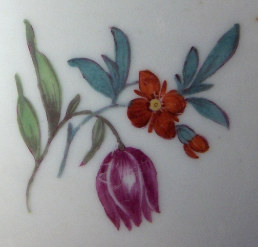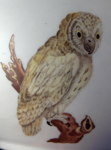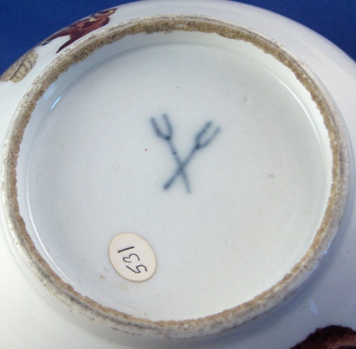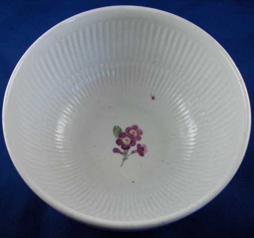 This is a top notch (actually the nicest piece of Volkstedt I have ever seen) slop or waste bowl made by Volkstedt around 1760. It is handpainted on one side with an owl on a tree stump, the other side with a magpie on a tree stump, in between there are two floral arrangements and on the inside is another flower. Typical ribbed design to the paste on the inside of the bowl. It is marked underneath with the underglaze blue crossed pitchforks. The bowl is in perfect condition with no chips, hairlines, etc. but the inside flower has a tiny bit of wear to it. The bowl is 3.125 inches tall and 6.25 inches in diameter. Please email me for more information or photos.