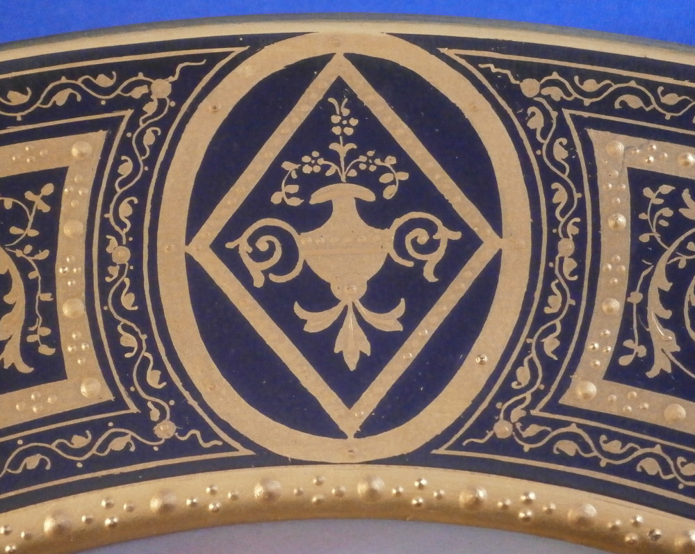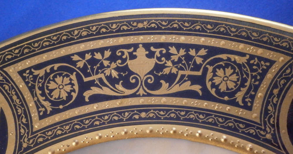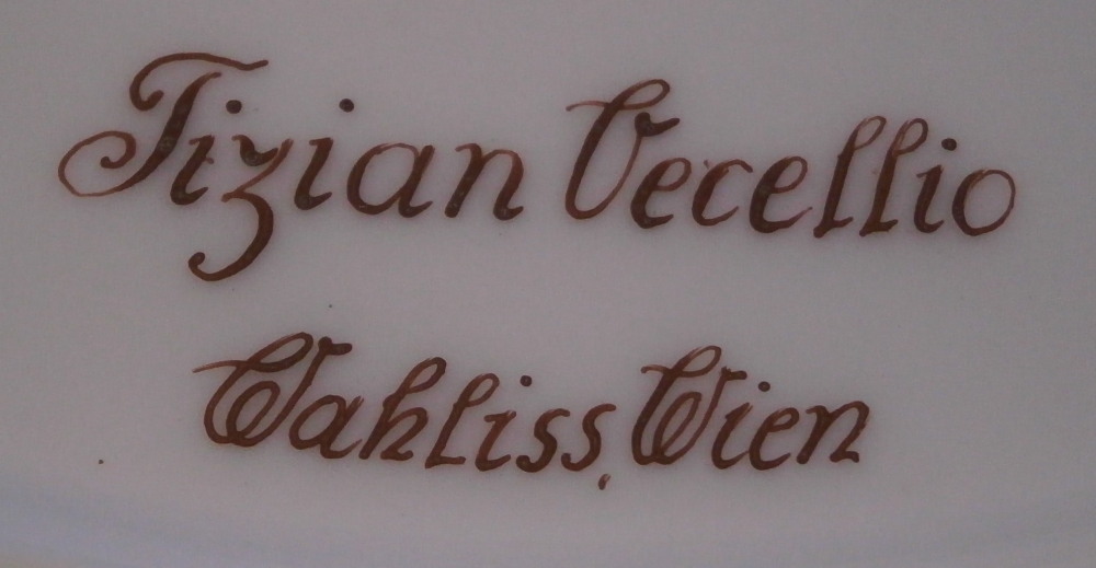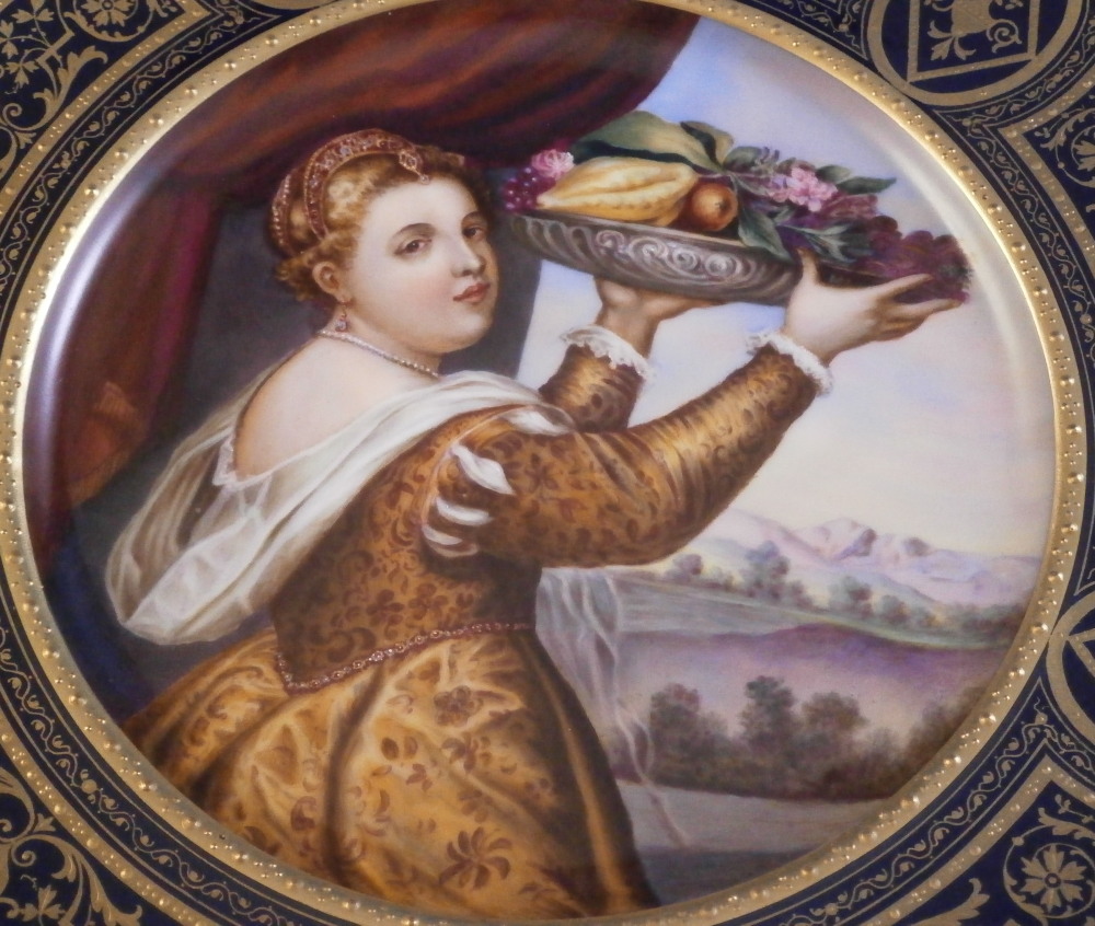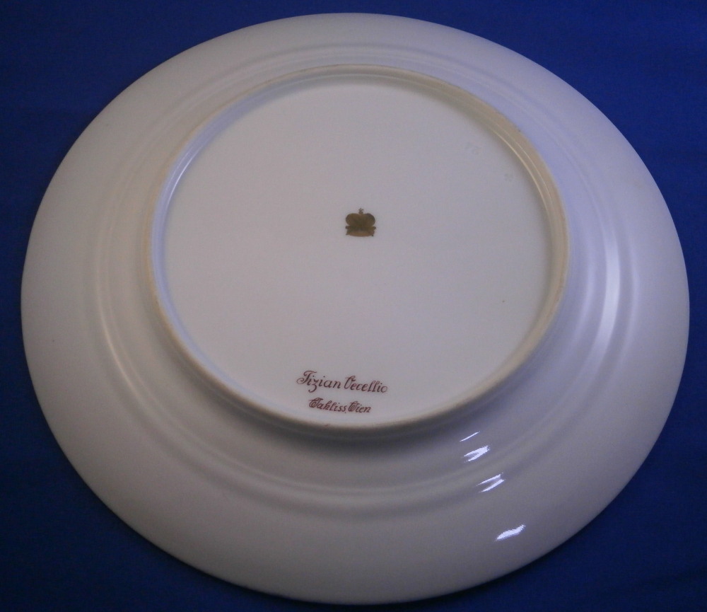 This is a superb plate made by Wahliss of Vienna , Austria in the later 19th century. Ernst Wahliss was an Austrian ceramicist who created ornate porcelain and earthenware vessels for European elites. This plate here is a nice example of his work though he is better known for his figurines. The plate is very much in the so called Royal Vienna style with a large scene in the center of copy of Titian ( Tiziano Vecellio ) painting of the Girl with a fruit bowl. The entire center is hand painted with teh scene incuding a young lady / girl holding up the fancy bowl full of different fruits with drapes to her side and a landscape scene in the background. I have never seen this scene on a plate before but once or twice on a porcelain plaque. It's a really nice scene! One cannot say enough about the quality of this painting! All hand painted off course. The cobalt blue ground rim with the superb gold trim which is partially raised make this a very stunning plate. A nice gold band with a raised design to the edge of the well. These types of plates are very elegant and decorative which is why they are so popular. The plate is in perfect condition as shown except for one spot on the edge where the gilding is worn but it doesn't show when on display and is very minor. The piece is 9.625 inches in diameter and just under 1.25 inches tall so a very nice size. It is marked underneath with Wahliss , Wien in red as well as the name of the artist of the original painting in red as shown - Tizian Vecellio . Gilded over factory mark for the maker of the blank which looks to have been Pirkenhammer. Please email me for more information or photos.
