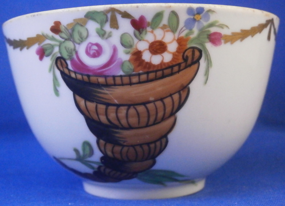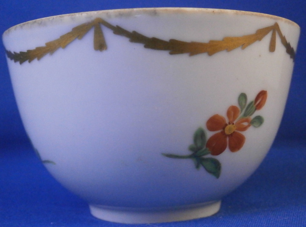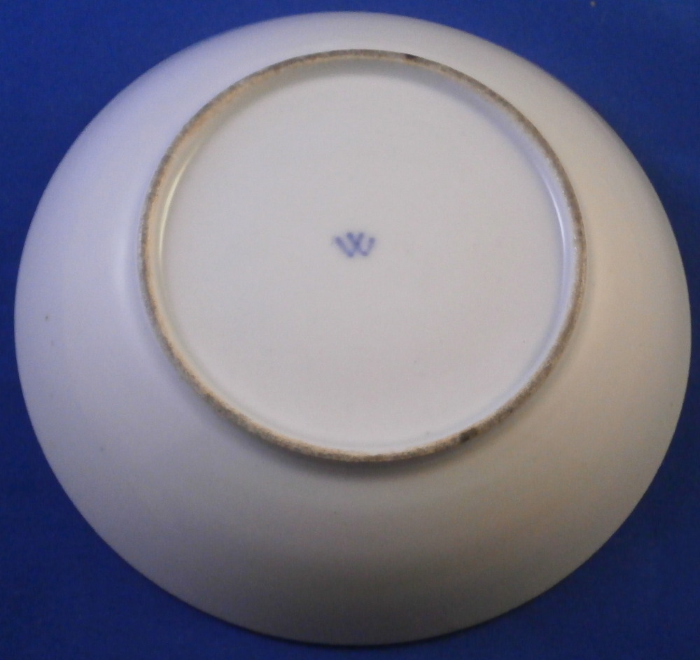 This is a really fun cup and saucer set made by Wallendorf in the 18th century. Both pieces are hand painted with a nice design of a cornucopia / horn of plenty filled with flowers, a golden garland around the top edge all around as well as two single flowers filling in the rest of the space. Another single flower to the bottom inside of the cup. Nice ribbed design to the paste itself on inside of both pieces which is quite typical of this maker! No handle so this is a Koeppchen / teabowl style cup. The set is in superb condition with just a few minor firings flaws in the form of tiny black spots common to their early wares and a few small scratches from use and a really tiny chip (and I mean nibble size) to the saucers very edge but it is still a very nice example! The cup is 1.875 inches tall and 3 inches in diameter. The saucer is 1.125 inches tall with a diameter of 5.25 inches. Both are marked underneath with their under glaze blue W mark as shown as well as an impressed letter L. Please email me for more information or photos.