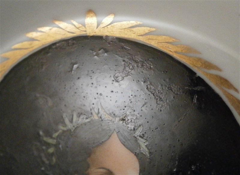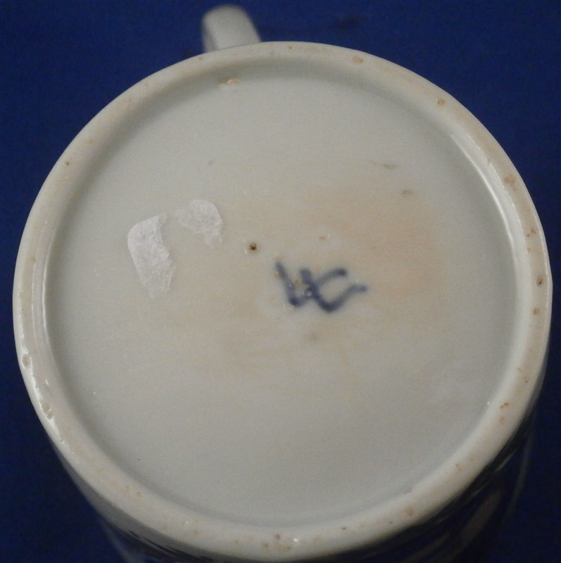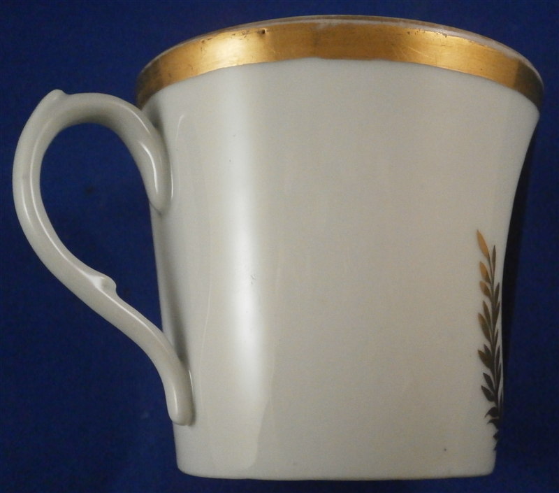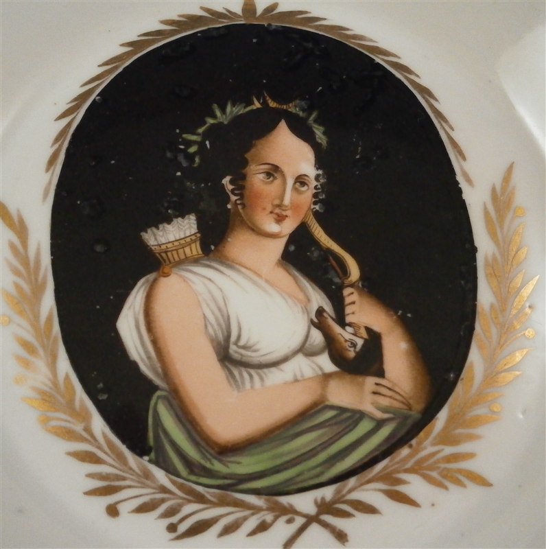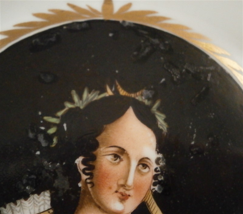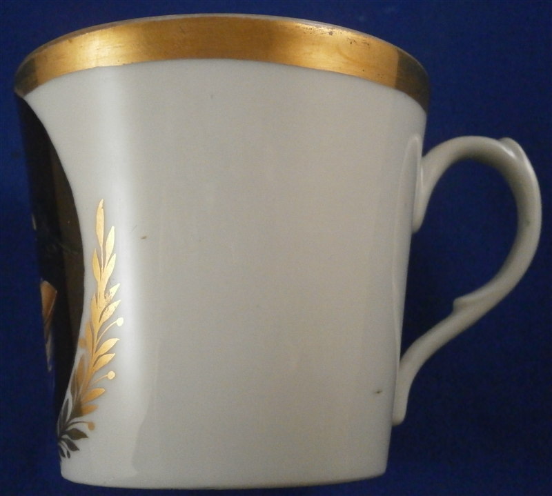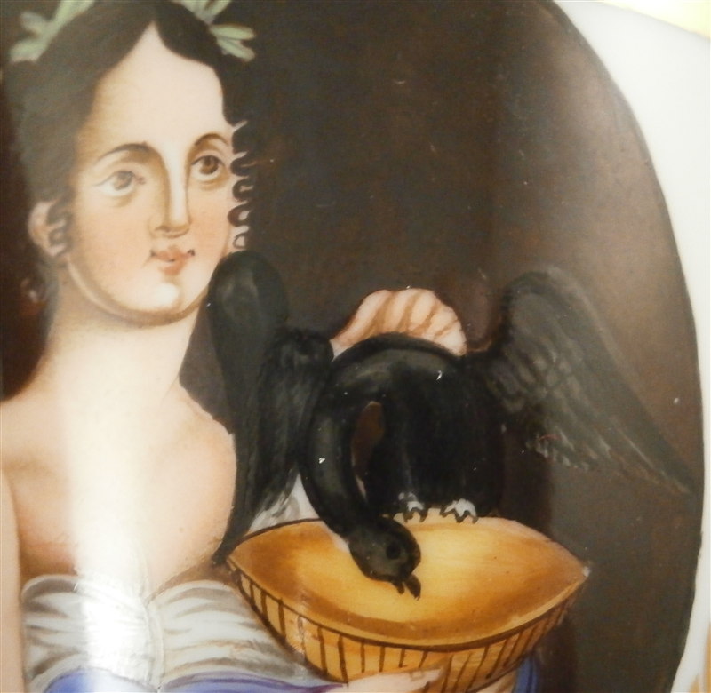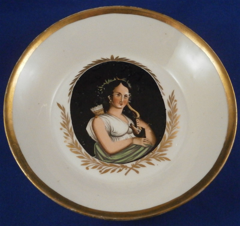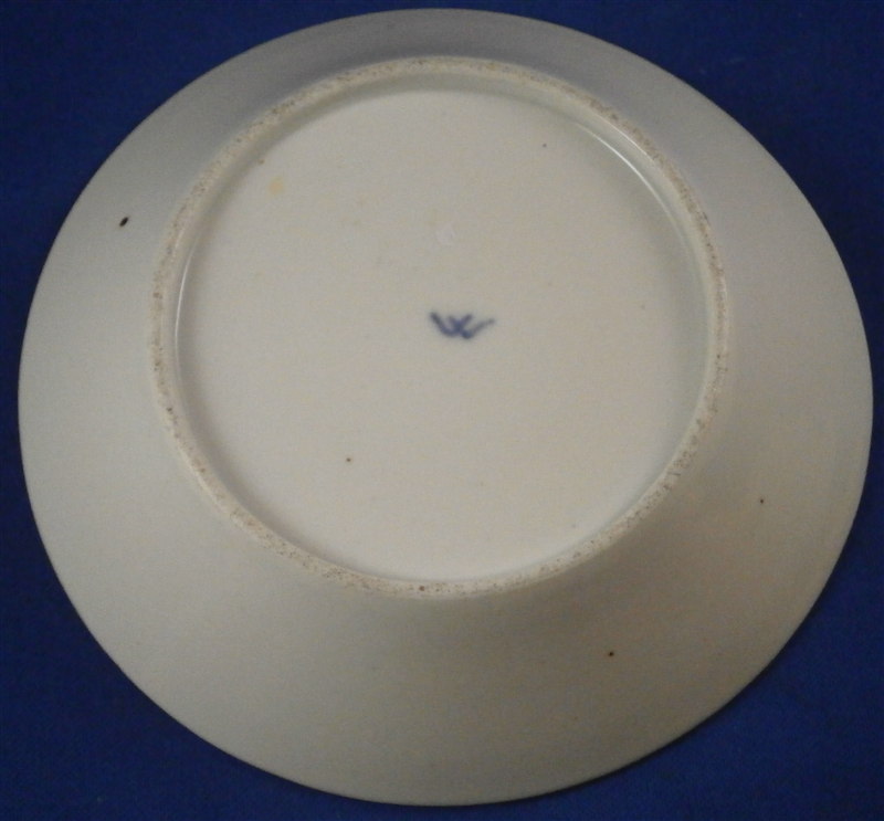 This is a really nice cup and saucer made by Wallendorf in the 18th century. Both the cup and the saucer are hand painted with a nice scene of Diana the Huntress on a black ground surrounded by some gilding with more gold trim along the top edges. On the saucer you ahve a typical image of Diana with her bow and arrows and a fox type animal while the cup has her with a raven eating from a bowl - not sure how that fits into her story but I am sure it does somehow. Maybe someone knows and could fill me in! The set is in great condition with a a tiny bit of wear to the gilding and the black ground color of the saucer has flaked and was colored in a bit to hide it a little as shown. No other issues! The saucer is 1.125 inches tall and 5.25 inches in diameter. The cup is 2.375 inches tall and 2.625 inches in diameter. Both the cup & the saucer are marked with the underglaze blue W mark as shown. Please email me for more information or photos.