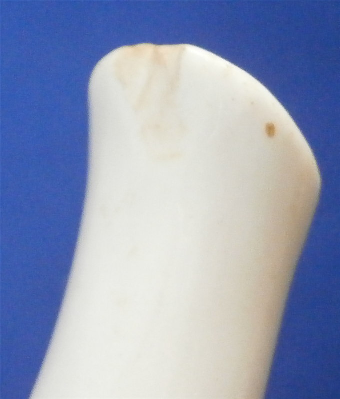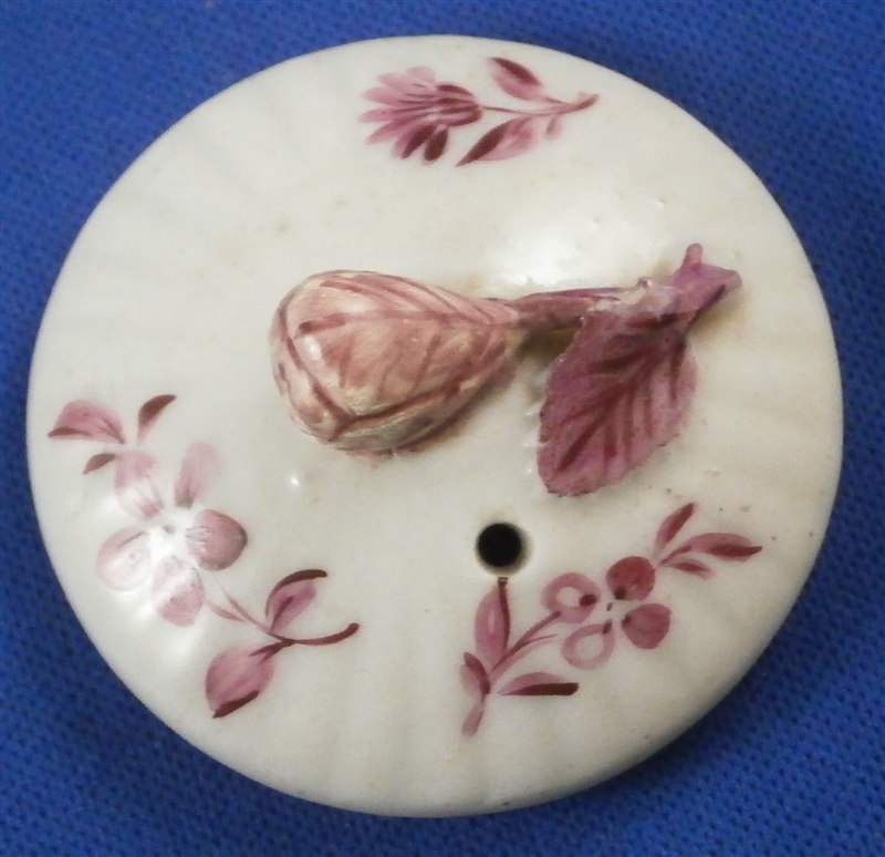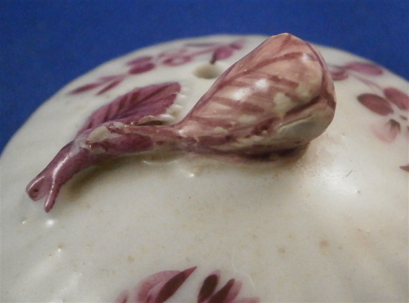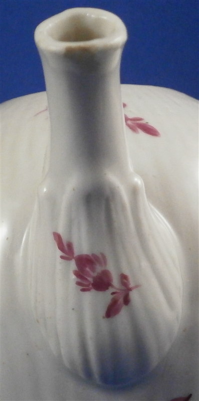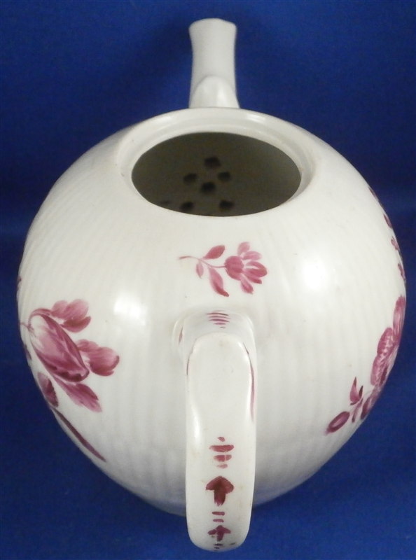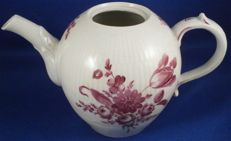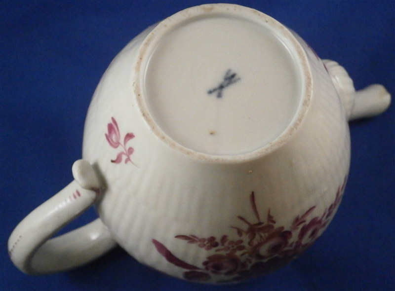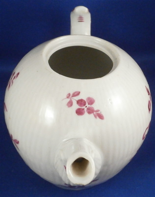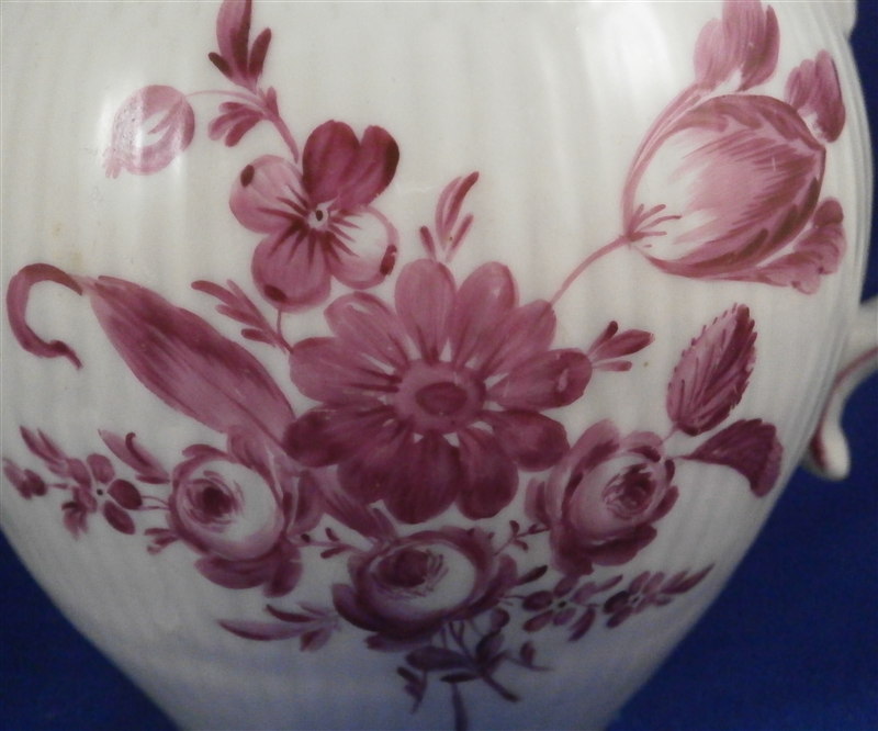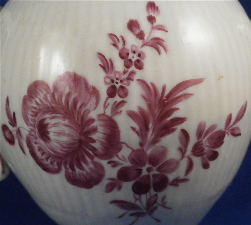 This is a fun teapot and lid made by Volkstedt in the 18th century around 1760. The pot has two hand painted floral arrangements as well as a few smaller single flowers with some puce trim on the nicely shaped handle. The spout has a nice shape to it as well. The lid has three small flowers on it and a flower bud finial. The pot and lid have the typical ribbed design to it which one finds on many of the Thuringia area wares. The pot displays superbly but has a chip to the underside spout which can't be seen unless you turn it over and the finial of the lid has been replaced. The tea pot and lid are 4.25 inches tall, it is about 7.25 inches from handle to spout and 4 inches in diameter. Marked underneath with the crossed hayfork mark meant to imitate the Meissen crosswed swords. Please email me for more information or photos.