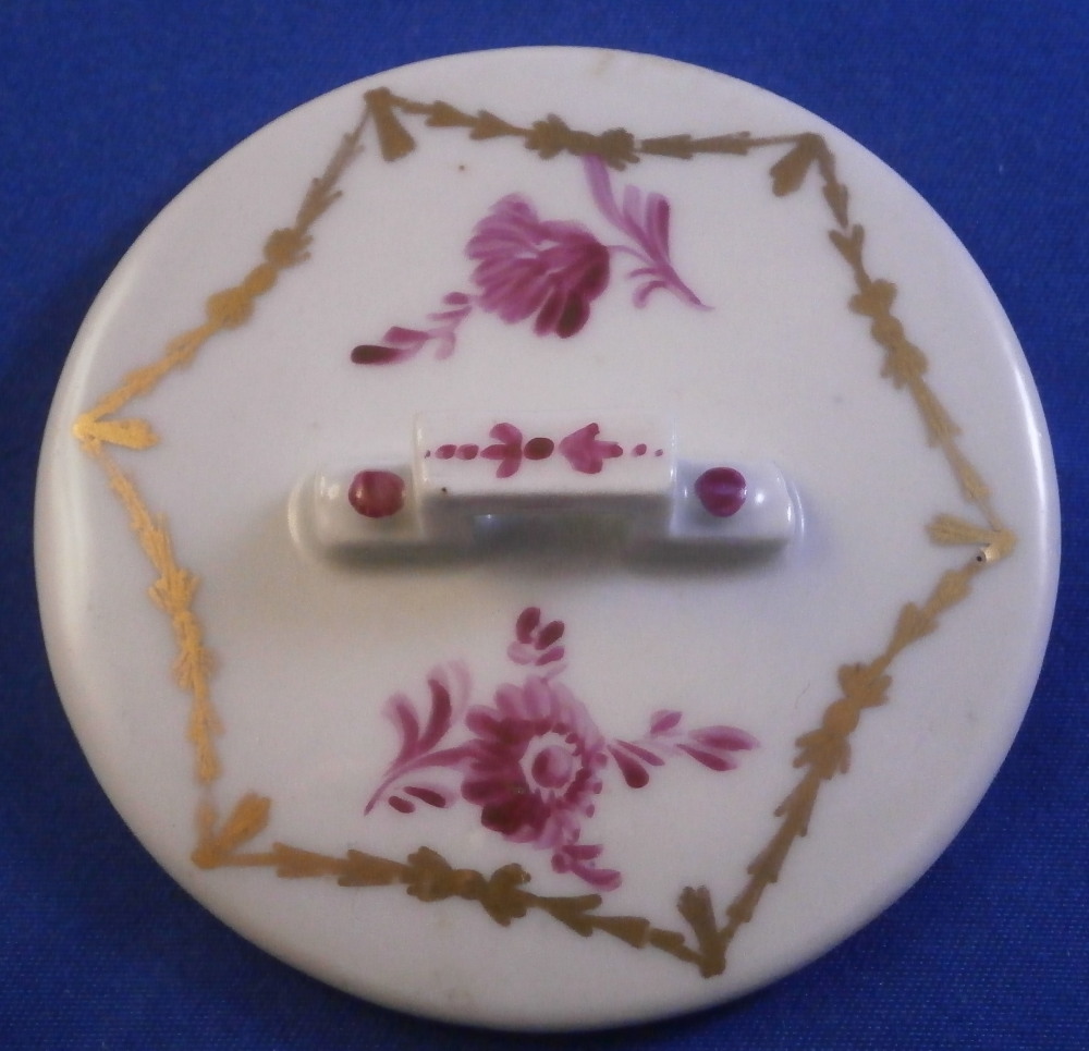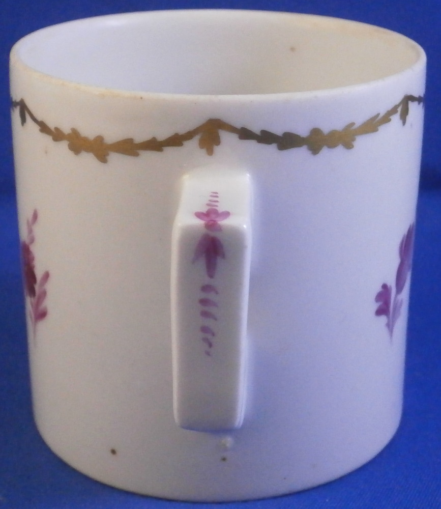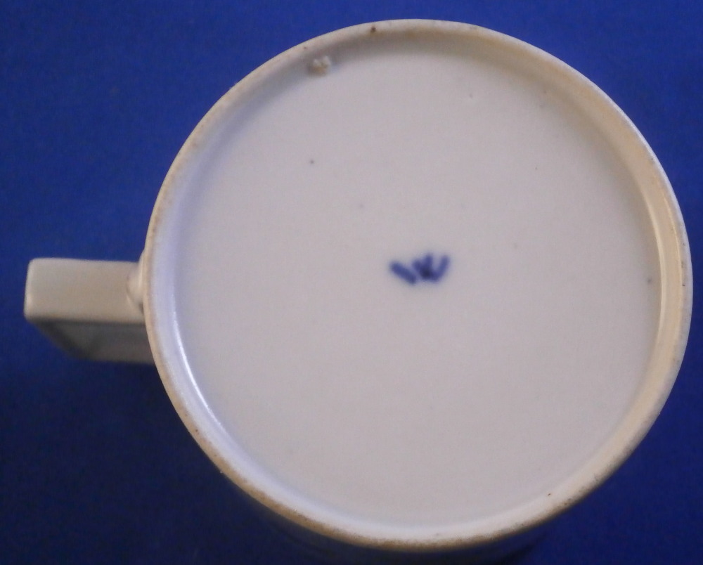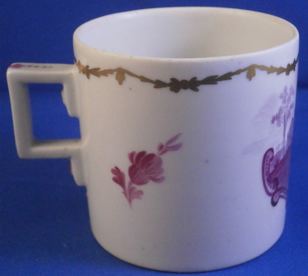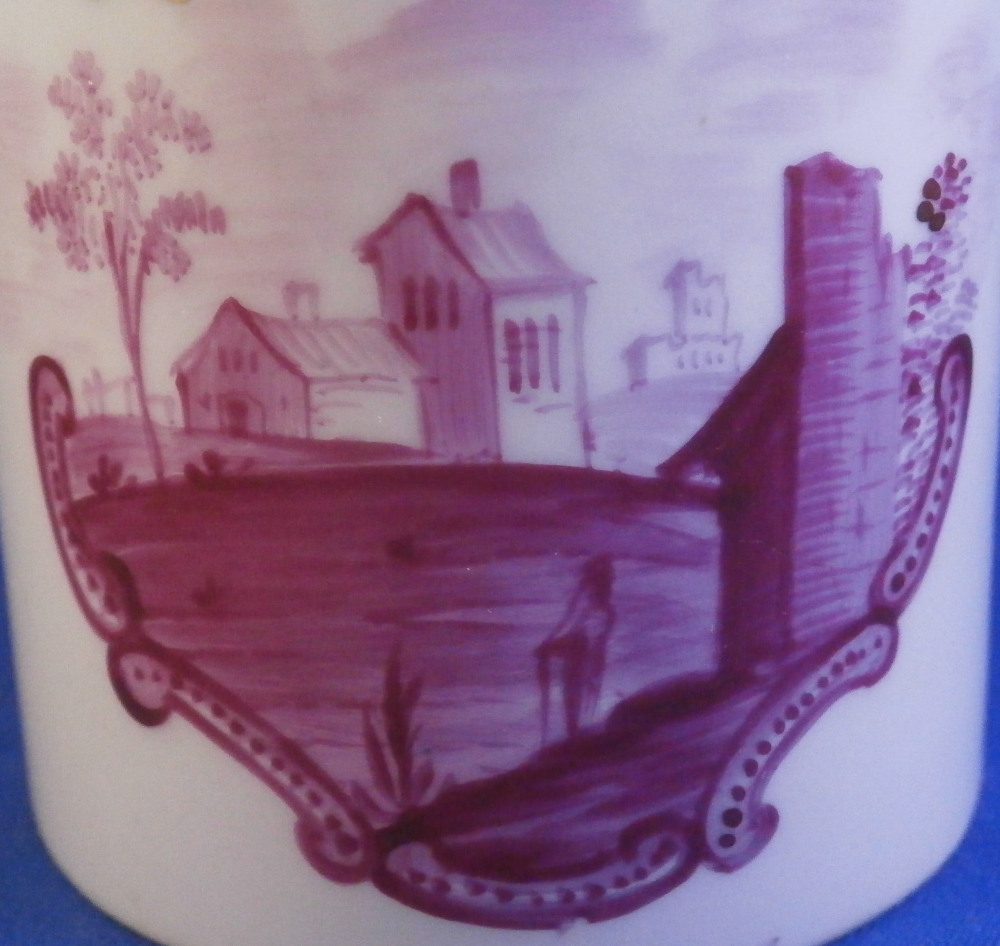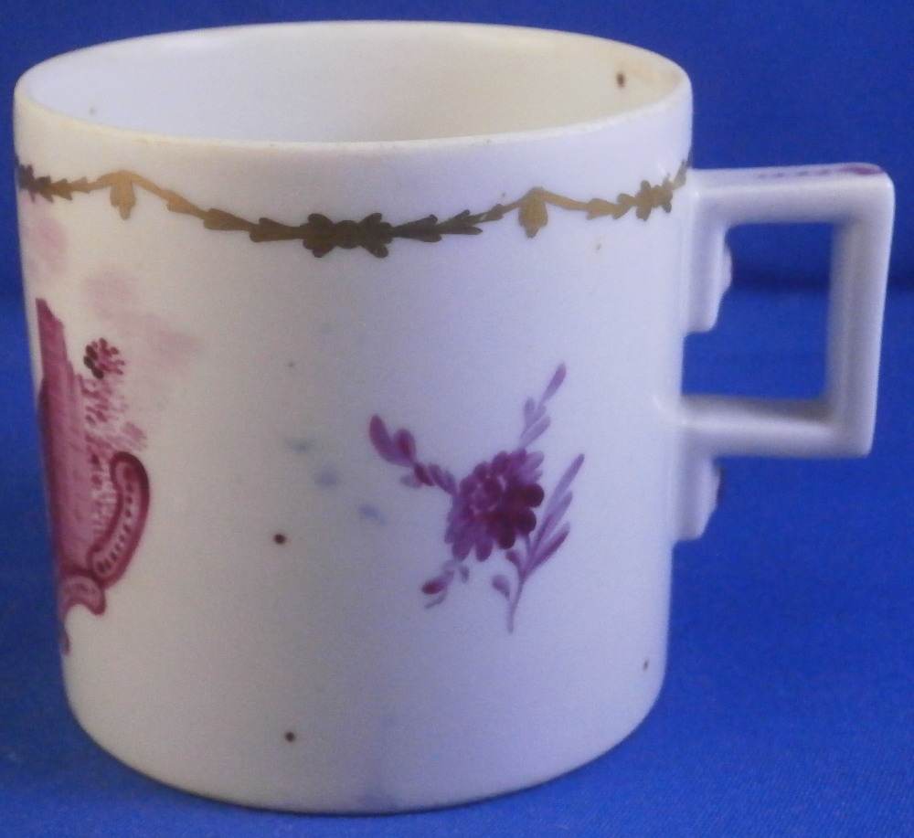 This is a rare lidded cup and saucer set made by Wallendorf in the 18th century. Both the cup and the saucer are hand painted with a nice scene in shades of puce including buildings, ruins and a person in a landscape surrounding. Each scene has a puce scroll design below it. The rest of the space is filled with two puce flowers and a gold garland trim. The lid also has two puce flowers to it as well as the gold garlands. The handle on the cup and lid are typical for the classical period and one of my favorite shapes. They have some puce trim to them. The set is in superb condition with just some of the usual minor firing flaws to them but no chips, restorations, etc. As good as they come! The saucer is 1.125 inches tall and 5.125 inches in diameter. The cup is 2.375 inches tall and the same in diameter. The lid is 2.5 inches in diameter and 0.625 inches in height. Both the cup and the saucer are marked with the underglaze blue W mark as shown. Lidded cups are hard to find since the lids are almost always lost! Please email me for more information or photos.