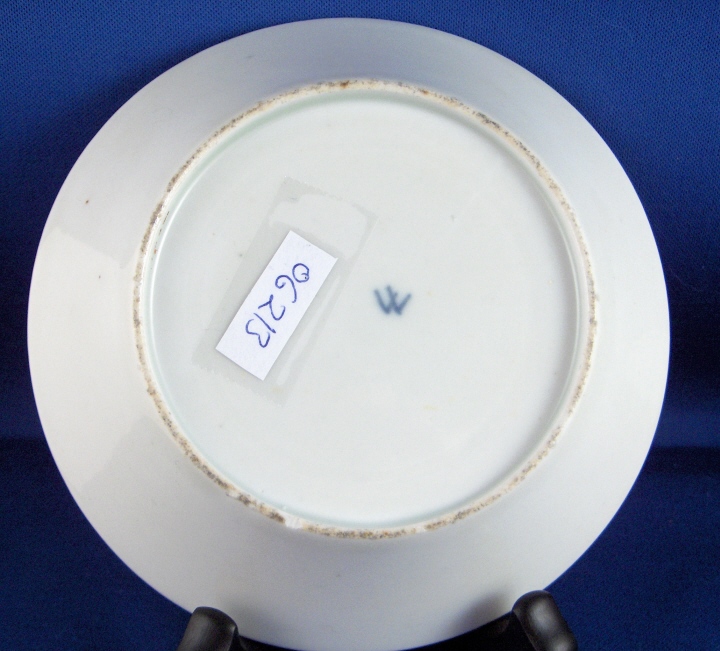 This is a saucer made by Wallendorf around 1790. Wallendorf was founded in 1763 and is one of the few makers of the Thuringia region that are still around today. This saucer is handpainted with a scene in puce in the center with a gold, black and puce trim around it. The rim also has a gold and puce trim around it. It is in good condition with some wear to the gold around the center scene. The saucer is marked underneath with the underglaze blue W mark. It is 1 inch tall and 5.25 inches in diameter. Please e-mail me for more information or photos.