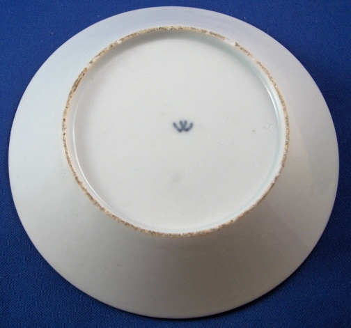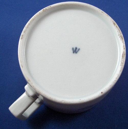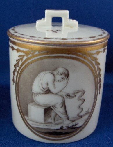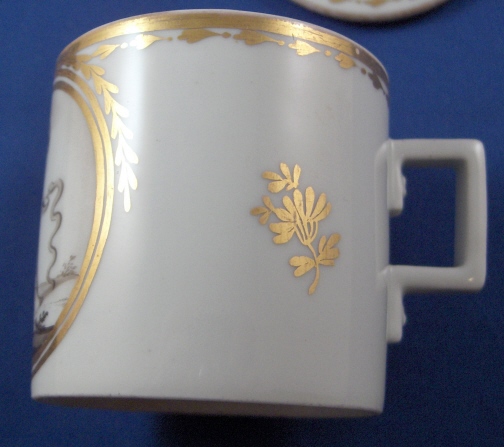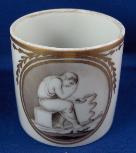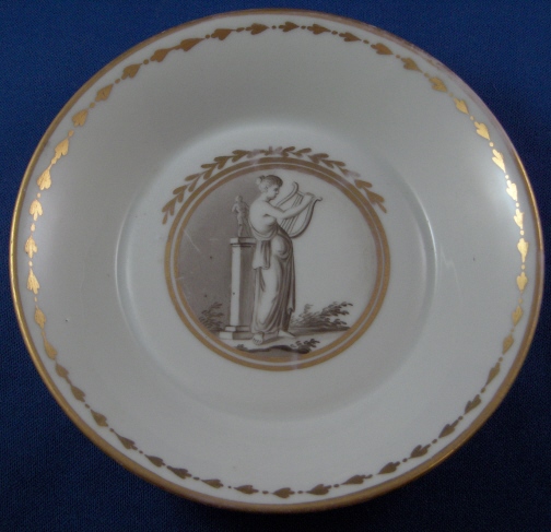 This is a rare lidded cup and saucer made by Wallendorf around 1790. Both pieces are handpainted with a nice scenic medallion in the center in shades of grey. The saucer has a lady playing the lyre with a statue on a column behind her. The cup has a gentleman holding a bowl in his left hand a snake is eating from. Nice gold trim to both pieces as well. The handles on the cup and lid are typical for the classical period and one of my favorite shapes. The set is in perfect condition with a tiny bit of wear to the gilding and three unimportant scratches to the scene in the saucer. The saucer is 1 inch tall and 5.25 inches in diameter. The cup is 2.375 inches tall and the same in diameter. The lid is 2.5 inches in diameter and 0.625 inches in height. Both the cup and the saucer are marked with the underglaze blue W mark and the saucer has an H incised near the footring. This is one of the nicest Wallendorf cups I have ever seen! Please email me for more information or photos.