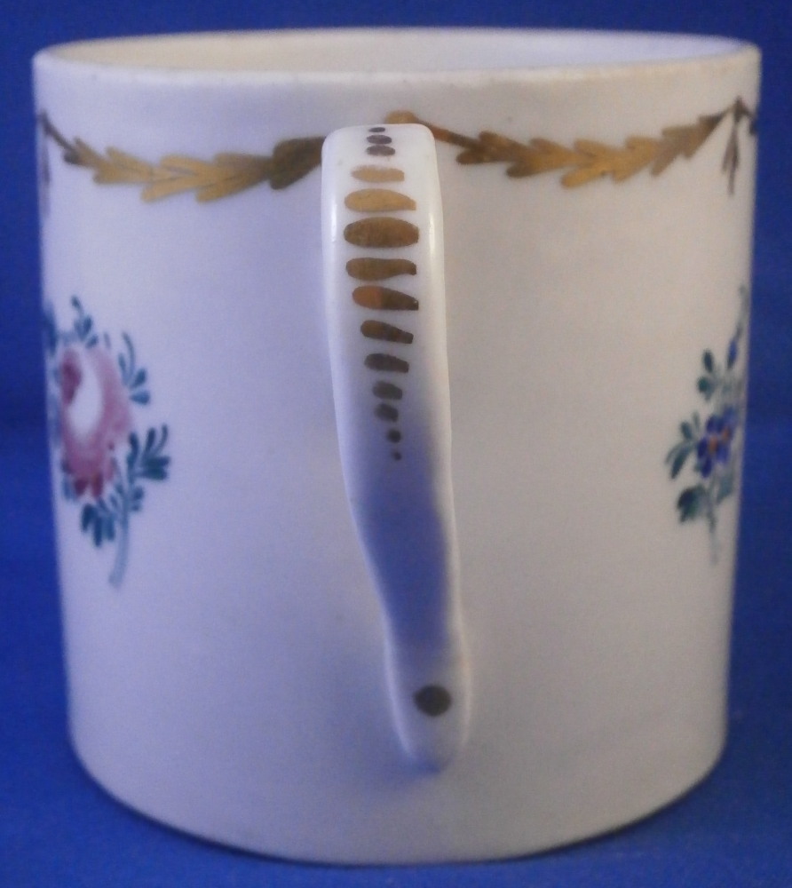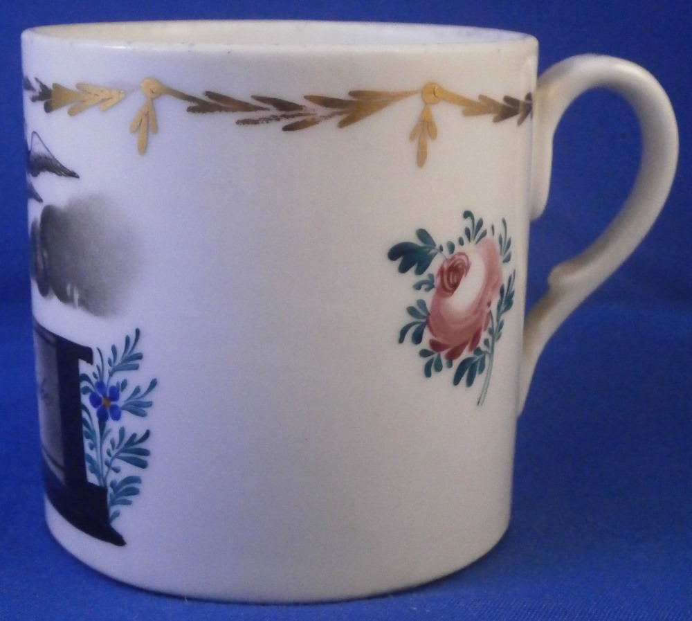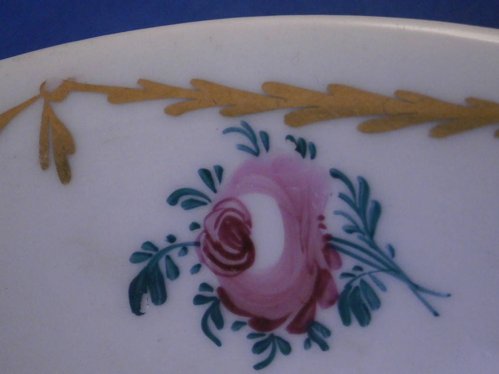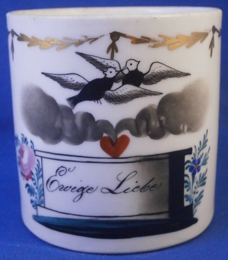 This is a nice cup and saucer made by Wallendorf in the earlier 19th century probably around 1820. Not quite as nice as the original 18th century design but still very nice and with a nice message. The set is hand painted with a nice design of two doves on top of two smoking hearts on a pedestal. The cup has "Eternal love (Ewige Liebe) " written on in and the saucer "and friendship (und Freundschaft)". Nice gold trim as well. Flowers to both sides of the altar as well as scattered around the rest of the white area to fill in the areas nicely. Gold trim to the handle. The set is in nice condition with an underside rim chip to the saucer that is just barely visible from the top. The saucer is just over 1 inch tall and 5.25 inches in diameter. The cup is just under 2.5 inches tall and 2.375 inches in diameter. Both pieces are unmarked but definitely from this maker and period. Please email me for more information or photos.