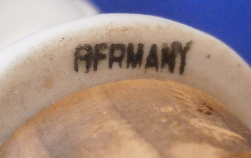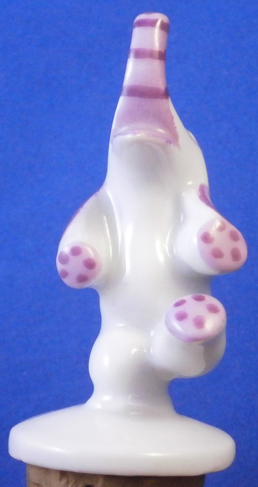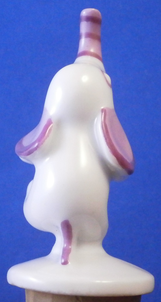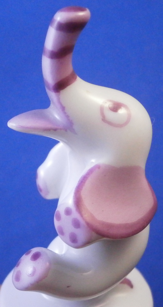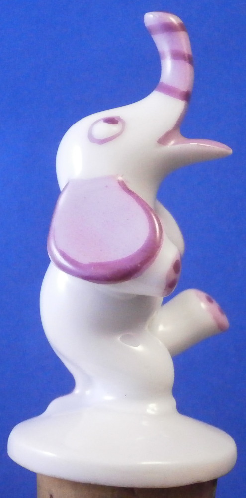This is a very rare porcelain figural bottle stopper made by Metzler & Ortloff in the late 1920's. Metzler & Ortloff was founded originally around 1873 and finally closed its doors in 1976. This figure was designed during their best period by the famous Walter Bosse who worked for them from 1926 until 1930. He made about 200 different figures though most are dogs or such things and there is a series of bottle stopper but they seems to be very very rare. I only found a picture of it in black and white from a book on his wares. The stopper is in the form of a figurine of an elephant modeled in his typical fun way and painted with two different shades of purple. The figure is standing on a flat base which has a screw type design to the udnerside to hold the cork in place. The cork is also glued on and damaged but that would be an easy fix since the porcelain is in perfect condition. The piece is quite typical of Walter Bosse's work which makes him so collectable. I love these small pieces of his! And there is a reasons his work is still so popular today! It just makes you smile. The piece is marked underneath with Germany as shown. Not sure if there is more but this would be model number 5493 if I am correct from the book. The porcelain part of the stopper is about 2.25 inches tall and 1.125 inches in diameter with the cork part here being about 0.75 inches long. Normally the cork would be longer but it works fine as is and could easily be replaced with a new one. Please email me for more information or photos.