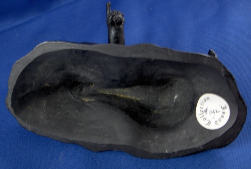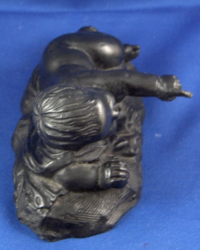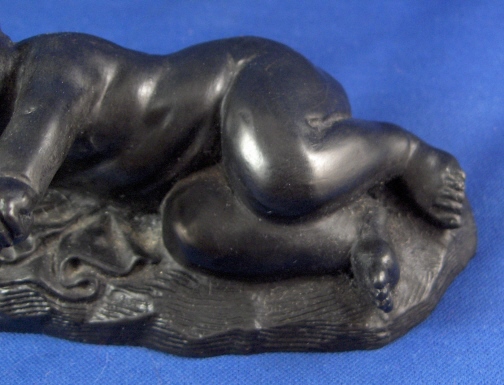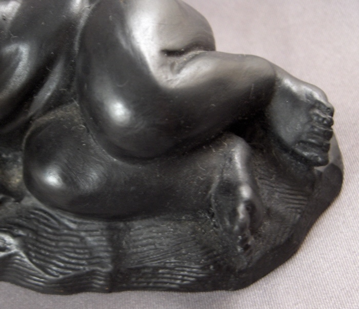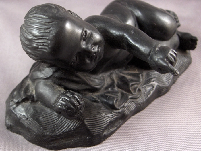 This is a rare baby figurine made from basalt by Wedgwood around 1773. These were reproduced from casts, probably by Mrs. Landre after the originals by Duquesnoy ( Il Fiammingo ). There is some confusion because these have been referred to as figures of Somnus (the sleeper), but that name refers to a different figure. This little guy isn't really sleeping either but rather lying down and pointing at something with his left hand while holding a ball in his right hand. There is a cloth underneath him and the base has a nice design to it. Really a superbly made figurine! It is in perfect condition. The piece is marked underneath with the impressed WEDGWOOD mark and it has a sticker from a prominent collection on it as well. Issod is their name and they deal in Wedgwood and have a large collection. I met them recently and couldn't live without this piece :) They in turn bought this piece from a dealer in England 40 years ago. The piece is 2.25 inches tall, 5.125 inches wide and 3.25 inches deep (including the pointing hand). Please email me for more information or other pictures.