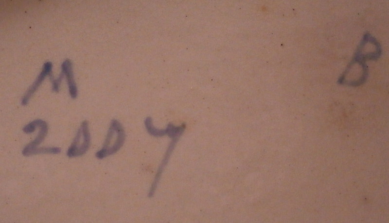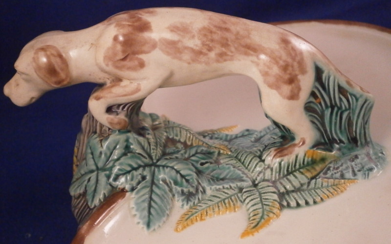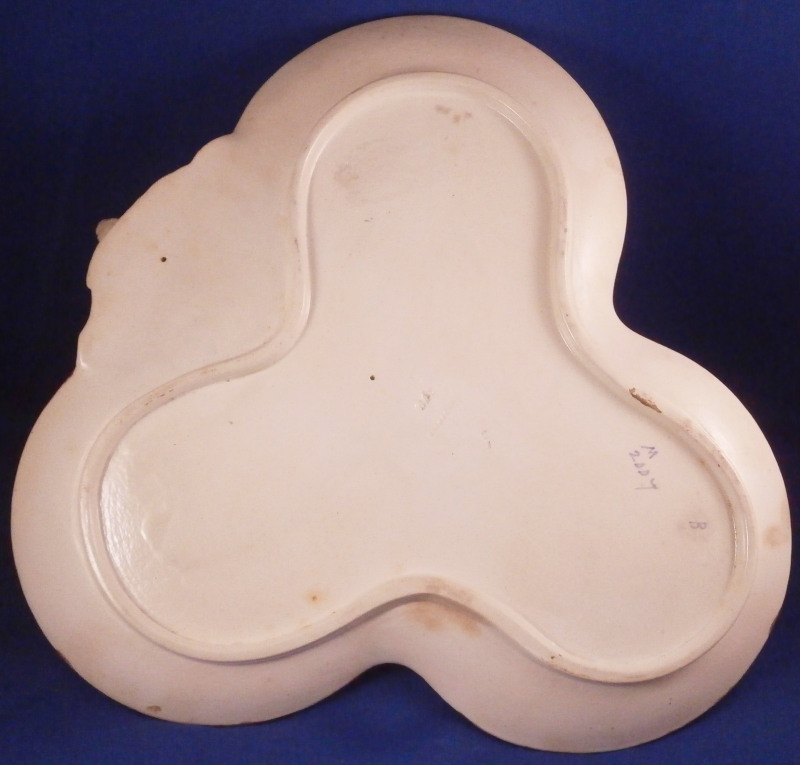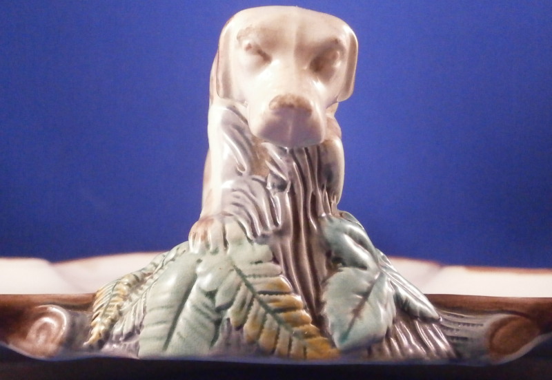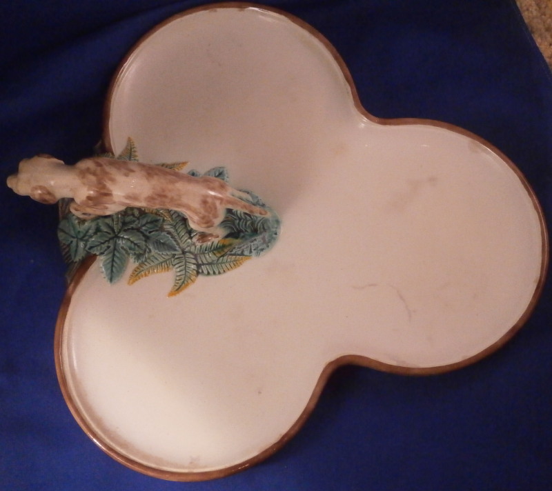 This is an interesting serving dish / tray made by Wedgwood in the 19th century. Made of some sort or pottery / ceramic in a trefoil or clover shape and a superb handle in the form of a dog in some greenery. I cannot find another example so it's not likely to be a common piece at all. The edge of the tray has brown trim to it. The piece is in good condition with some fine crazing throughout that has stained in some areas as shown. A small rough spot to the nose and eyebrow of the dog where the glaze is missing a tiny bit. The entire dish is 3.125 inches tall, 10.75 inches wide and 10.5 inches deep. It is marked underneath with the impressed WEDGWOOD mark, an impressed letter C their impressed three letter date code which I cannot make out as well as M over 2007 and a B in blue as shown. Maybe someone out there has more information on this piece! Please email me for more information or other pictures.