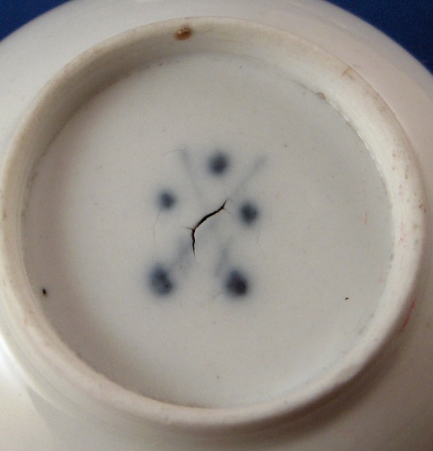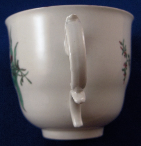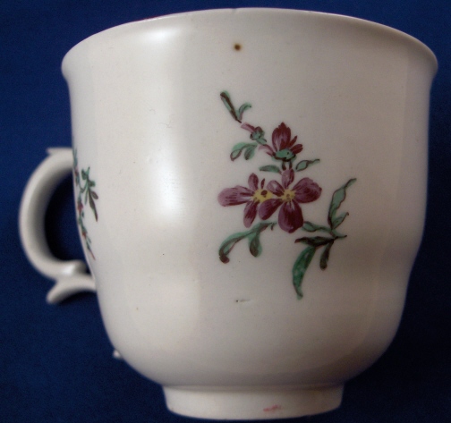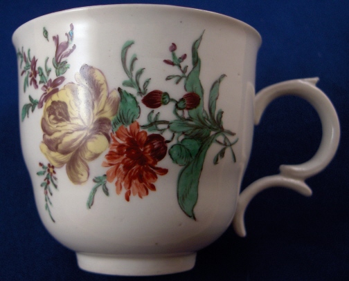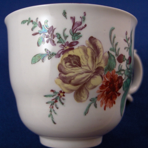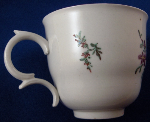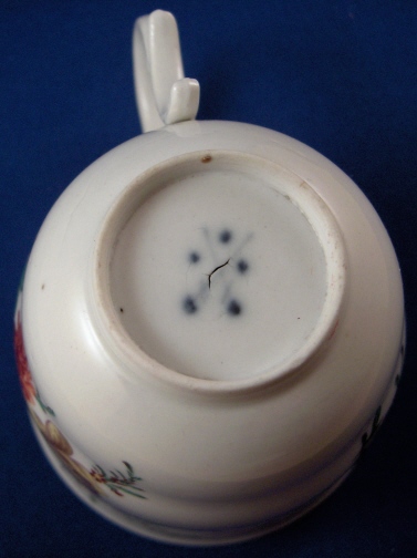 I am happy to report I found another piece by this rare maker - a cup made by Weesp around 1765. It is handpainted with a large flower arrangement on the front with two smaller flwoers on the other side and a dark trim to the top rim. Superb handle shape and the body also has a nice shape to it very typical of Weesp. The cup is in about as perfect a condition as one could hope for! It is marked with the underglaze blue crossed swords Meissen type mark with the three extra dots all around. The cup is just under 2.5 inches tall and 2.75 inches in diameter. Please email me for more information or other pictures.