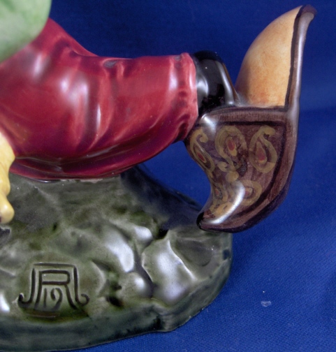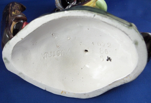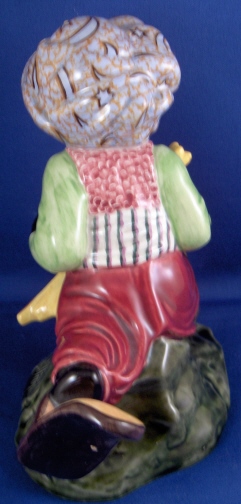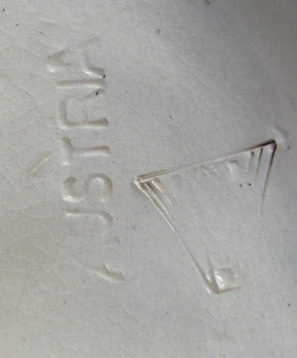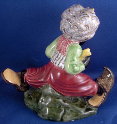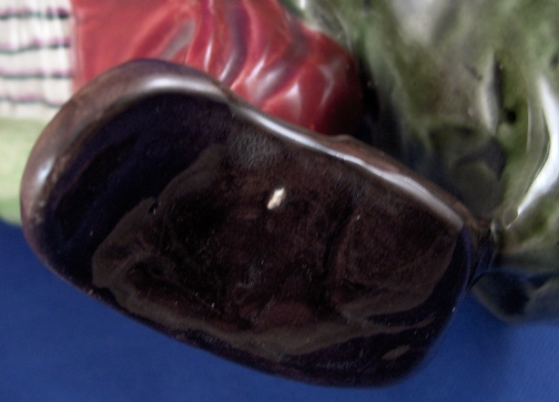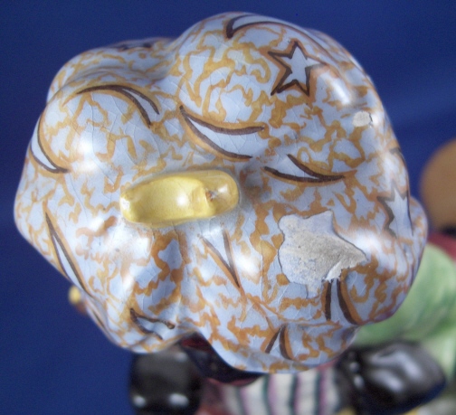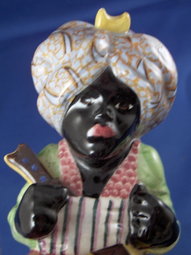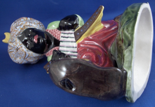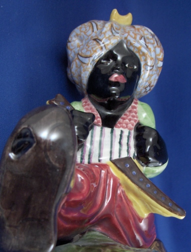 This is a rare figurine of a blackmoor made by the Wiener Kunstkeramische Werkstätte around 1919. This would predate the famous one made by Hugo Meisel at the Schwarzburger Werkstaetten which I find interesting since they are so much more well known! I could only find one other reference to this piece anywhere and it did not include much useful information :( Either way it is a very well modeled figurine of a blackamoor wearing a turban and huge slippers with a sword in his belt. A really colorful piece with lots of detail. I am unsure who designed this piece though his itnitials are impressed into the side of the base as is the number 19 for the year. The figurine is marked on the bottom with the impressed Wiener Werkstaette mark, impressed AUSTRIA as well as the model number 1632 over 86 over 5 and painter's intitials JR. He is 6.25 inches tall, 3.25 inches wide and 6.75 inches long. The figurine is in great condition with a little bit of crazing to the glaze, one tiny chip to the bottom base rim and a little glaze has flaked off the top of the turban which would be a very simple fix. Please email me for more information or photos.