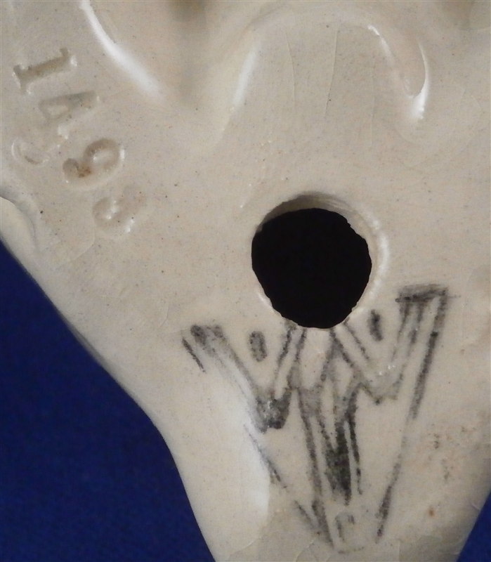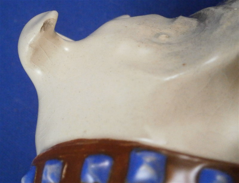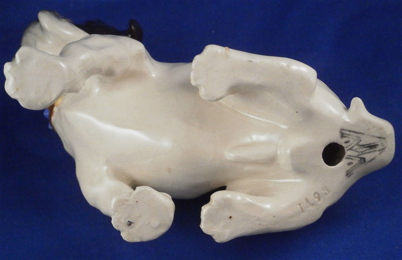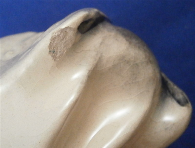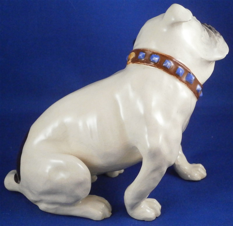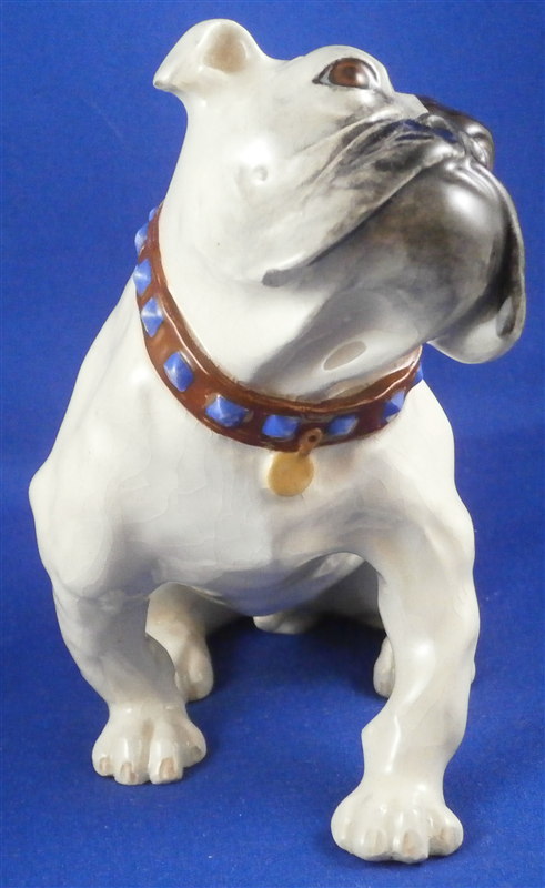 This is a ceramic figurine made by the Wiener Kunstkeramische Werkstätten in the early 20th century. It is of an English bulldog I believe and is superbly modeled and hand painted just enough to make it a fun figure of a dog. The collar is nice and colorful with the rest of the piece being mostly off white and black tones except for the brown eyes. The figure is marked on the bottom inside with their black stamped mark as well as the model number 1493 as shown. The dog is 4.75 inches tall, 2.75 inches wide and 5.25 inches long. The bulldog is in great condition with a small chip which is mostly glaze under his right cheek and the very tip of his right ear neither of which takes away from the piece. A bit of crazing to the glaze which is normal to these pieces. Please email me for more information or photos.
