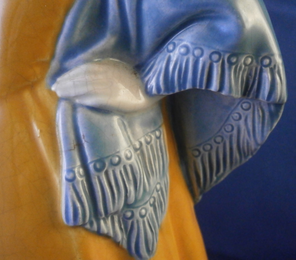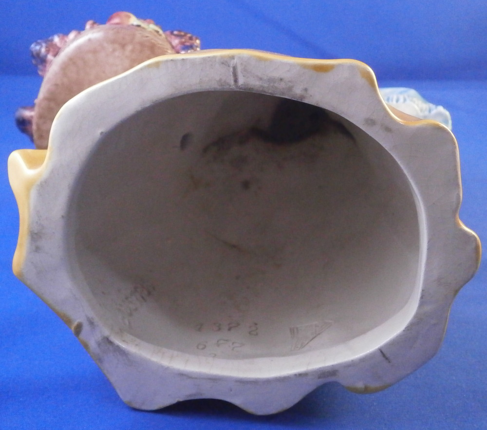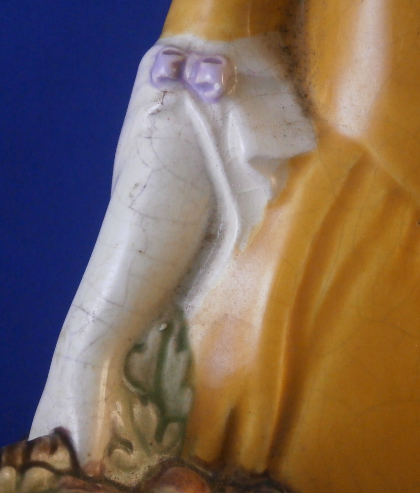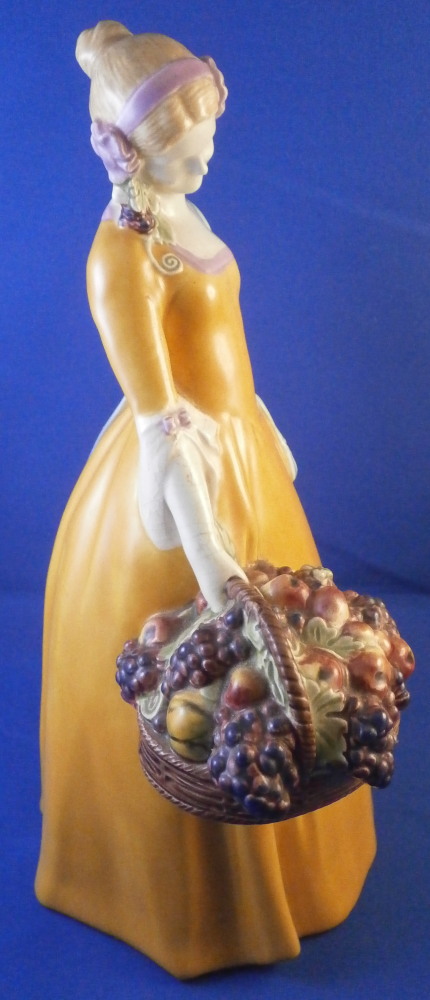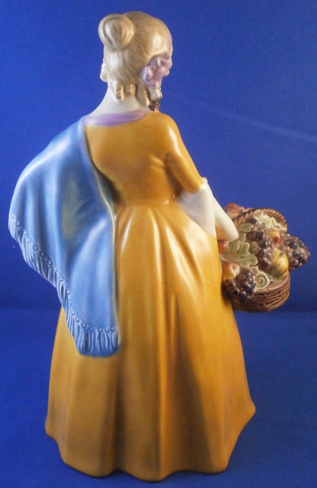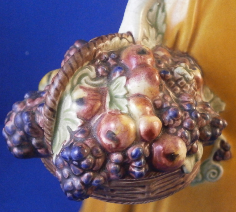 This is a figurine made by the Wiener Kunstkeramische Werkstätte around the 1920's. The figurine is of a nicely modeled lady holding a large basket filled with fruit in her right hand and a nice scarf over her left shoulder. She is nicely hand painted and quite typical for this maker and period. The figure is marked underneath with their impressed mark, impressed Austria as well as the model number 1372 and numbers 677 and 3. She is 9.5 inches tall, 6.25 inches wide and 4.25 inches deep. She is in great condition with some crazing to the glaze which is fairly normal to these old ceramic pieces. She displays nicely! Please email me for more information or photos.