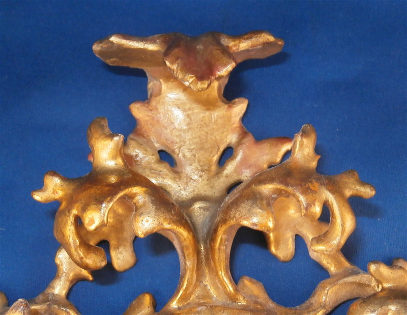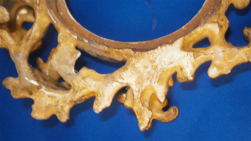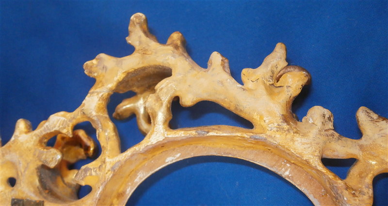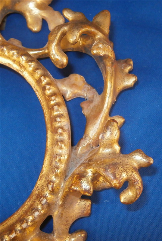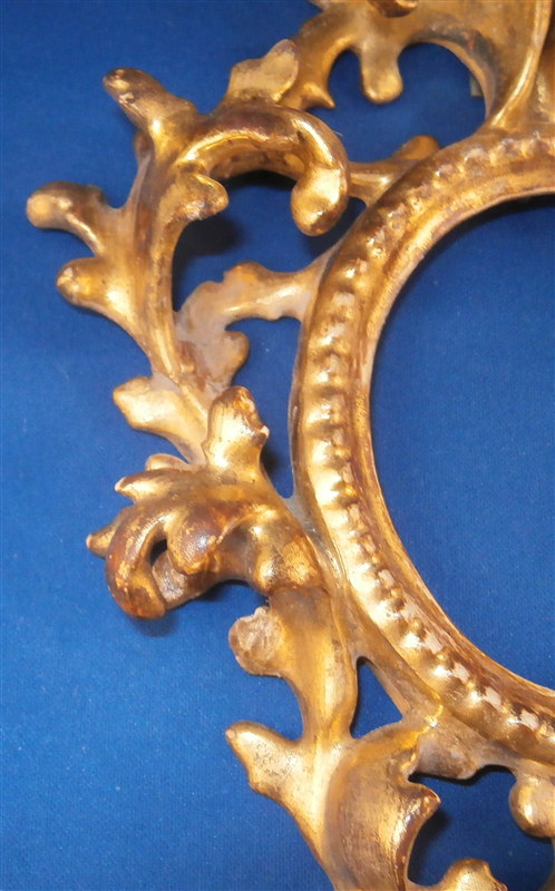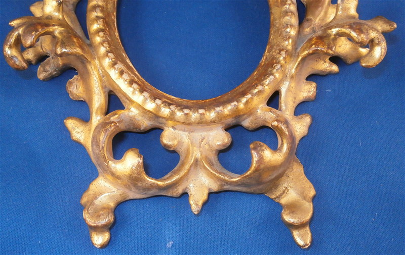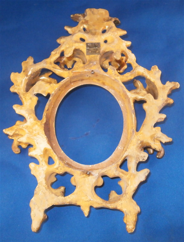 This is a superb gesso or plaster and wood carved frame for a porcelain plaque or such made in the 19th century. It is gilded nicely as shown. The frame displays beautifully but has some repaired damages and minor wear but about as good as one could hope for with these. The frame measures 9 inches tall and 6.5 inches wide. The plaque would be 3.5 inches tall and 2.75 inches wide with a bit less showing from the other side. Please email me for more information or photos.