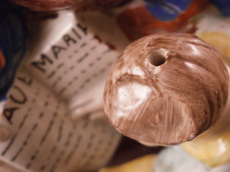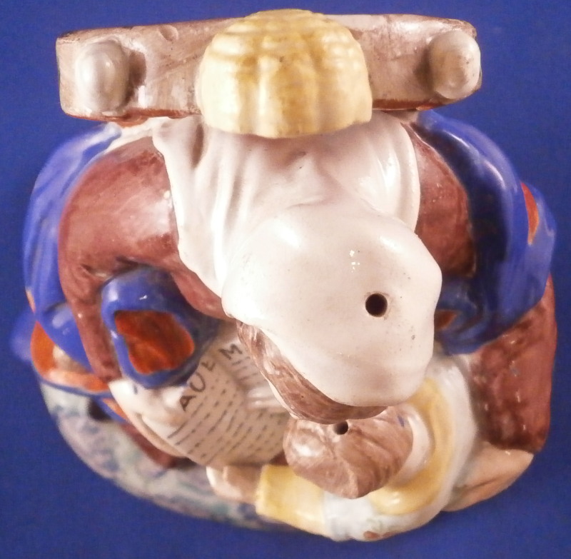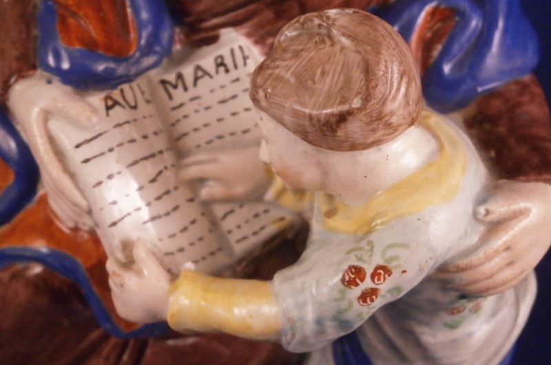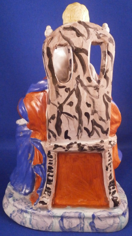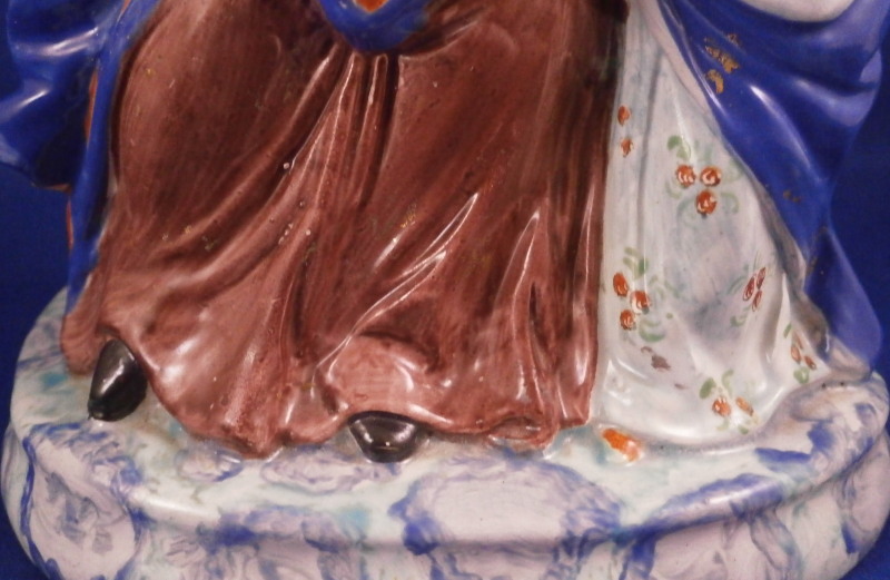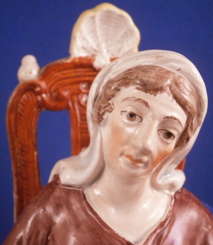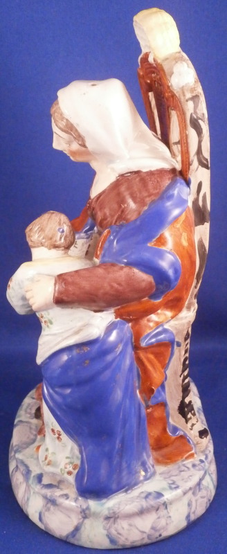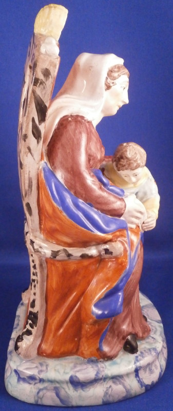 This is a superb figurine made by Enoch Wood (or possibly Ralph ) made in the Staffordshire region in the early 19th century. Made of creamware I believe. A very unusual piece and really very nice. I guess there is a discussion on whether this depicts St. Anne reading to the Virgin Mary or The Prudent Mother ? I always say it shows whatever you want it to show. Either way it is a very unusual piece and quite nice. It shows a lady sitting in a high back chair with the child standing next to her reading the book which states Ave Maria on the top. A very well modeled piece that is hand painted perfectly. I especially like the way the base is painted. An odd thing is that both the lady and the child have a hole poked into the top of their heads even though the figurine is hollow underneath. They must have had issues with the ehads getting damaged during the firing or there might be another reason for it I cannot figure out. The figurine is about 7.25 inches tall, 4.75 inches wide and 3.375 inches deep. The figure is in amazing condition with no issues at all! Unmarked as far as I can tell but there is a shallow line along the foot of the base underneath and a red line underneath as well. Not sure if they mean anything at all. Please email me for more information or other pictures.