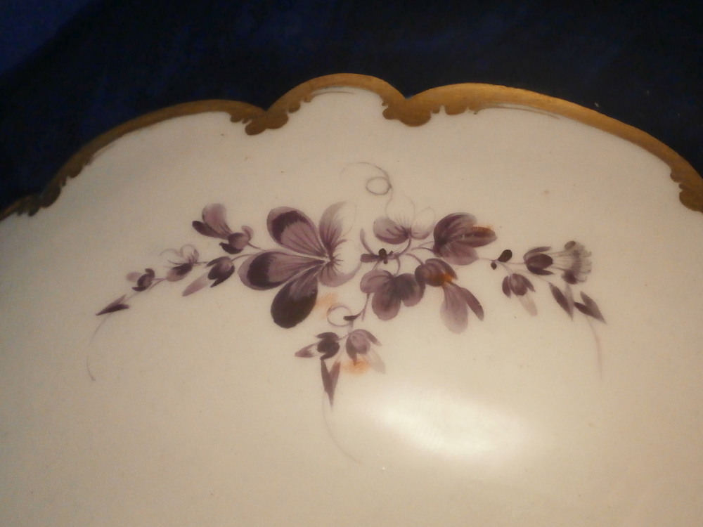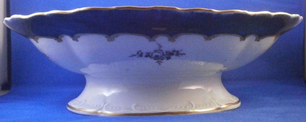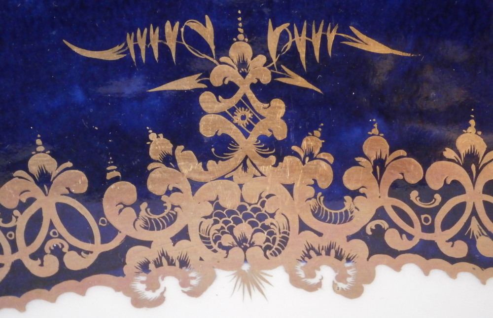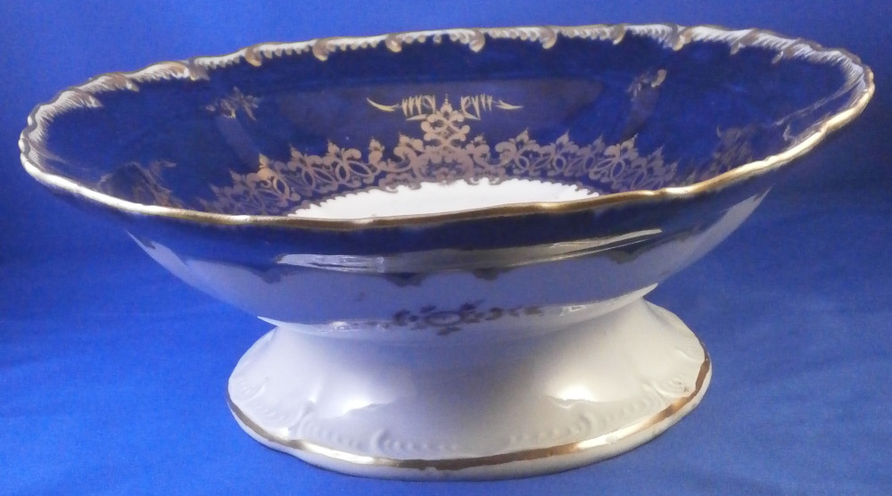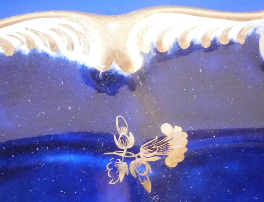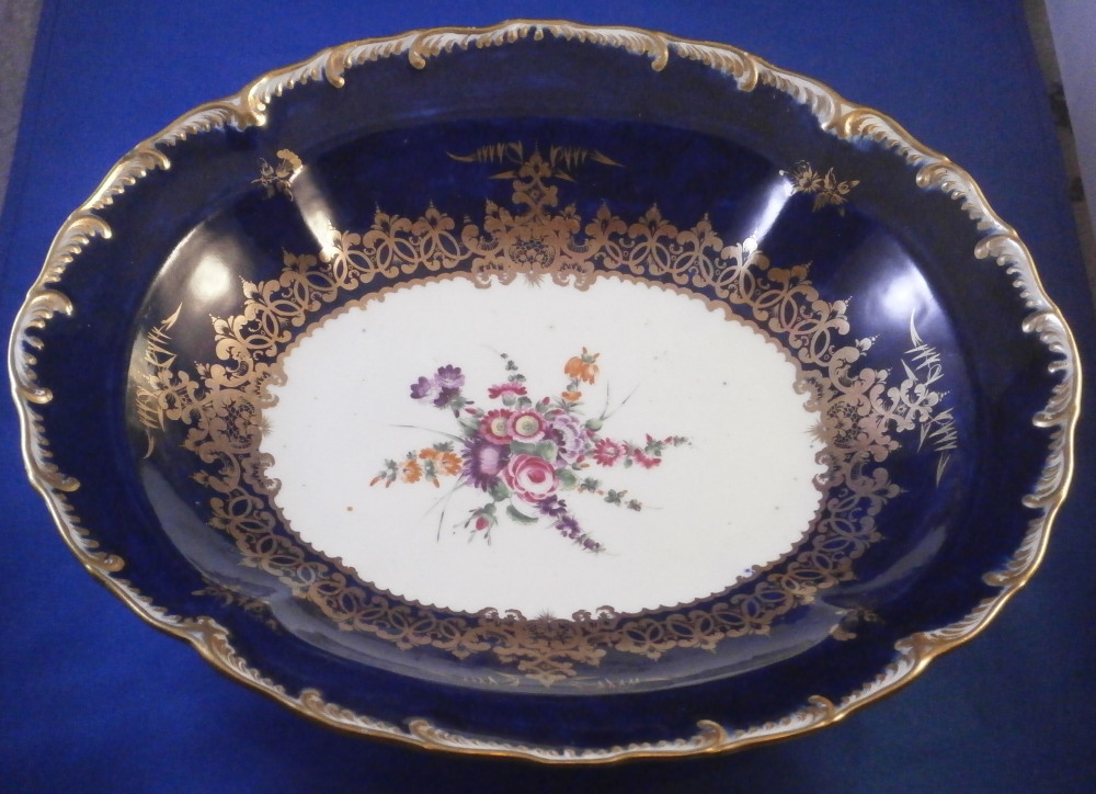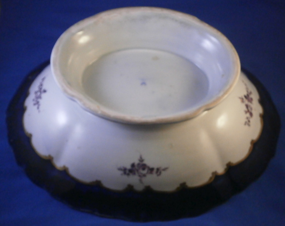 This is a very rare serving dish / compote made by Worcester in the 18th century around 1770. I have never come across a large piece like this in this sort of design. A rare survivor for sure! It is handpainted on the top inside with a nice polychrome floral arrangement in the center, a cobalt blue ground colored rim with and amazing gold trim around the center well plus four gold flowers. The top edge has a relief design to it highlighted with gilding. The outside rim has the same blue ground color to it with a simplet gold trim to the bottom edge of the blue colored area. Four purple flower designs and a relief design to the bottom edge of the foot plus gold trim around the bottom edge. A really nice looking piece and a superb example of Worcester porcelain of the 18th century. Amazingly the piece is in superb condition with one small chip to the top inside edge colored in with gold to hide it perfectly plus what looks like a popped glaze bubble to the clear glaze of the underside near where the foot starts as shown. A stray gold line and some of the usual flaws of a piece this old but virtually no wear to the gilding or any other obvious flaw so it looks amazing and displays perfectly! The dish is marked with the under glaze blue crescent mark underneath as shown. The piece is 3.75 inches tall, 11.875 inches wide and 9.75 inches deep. Please email me for more information or other pictures.
