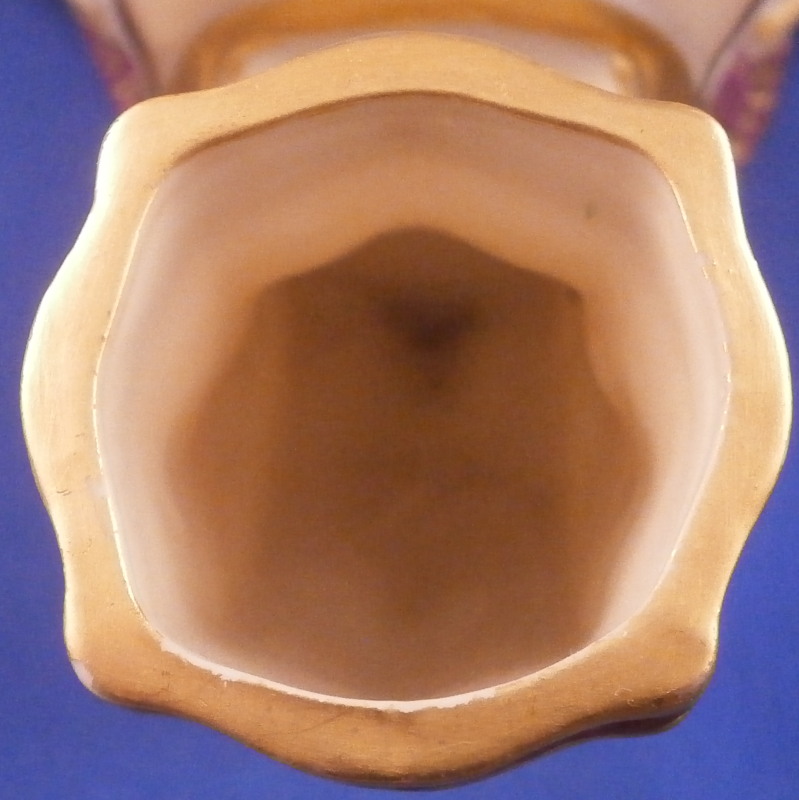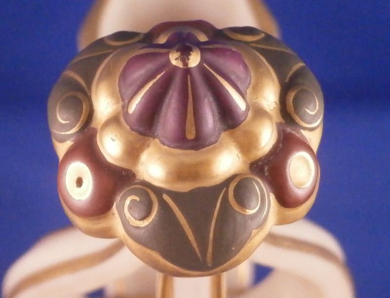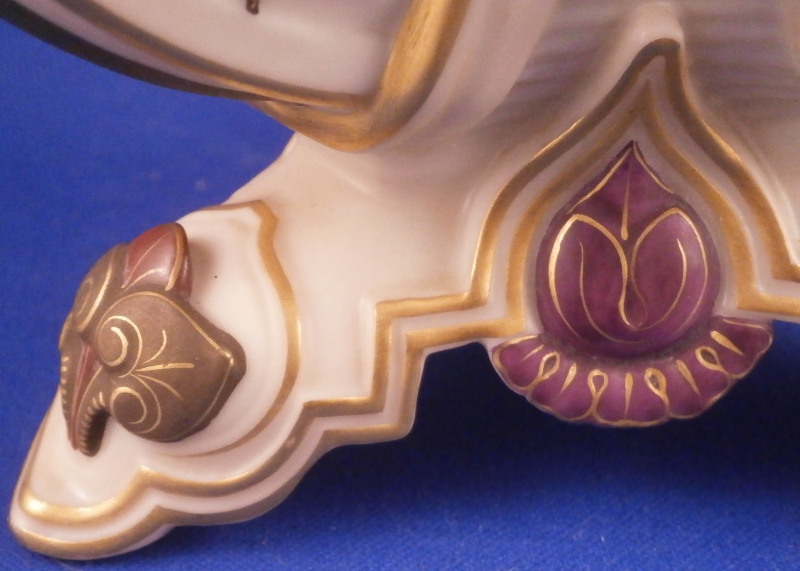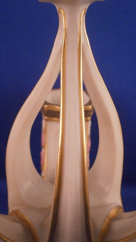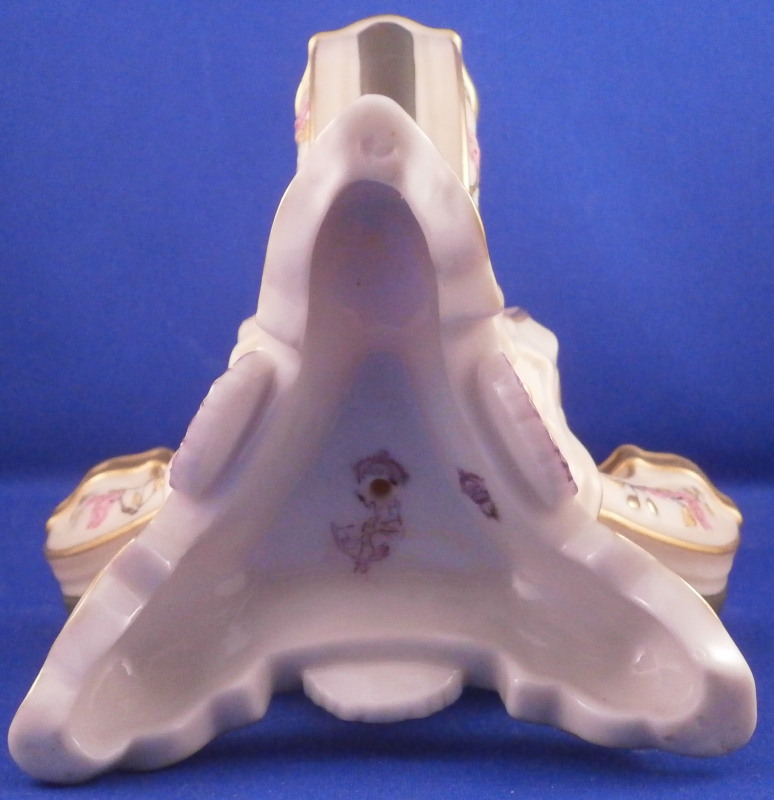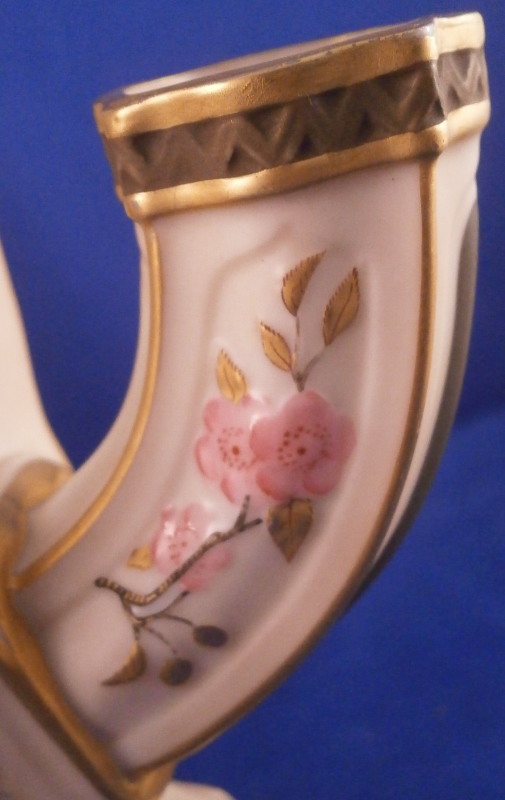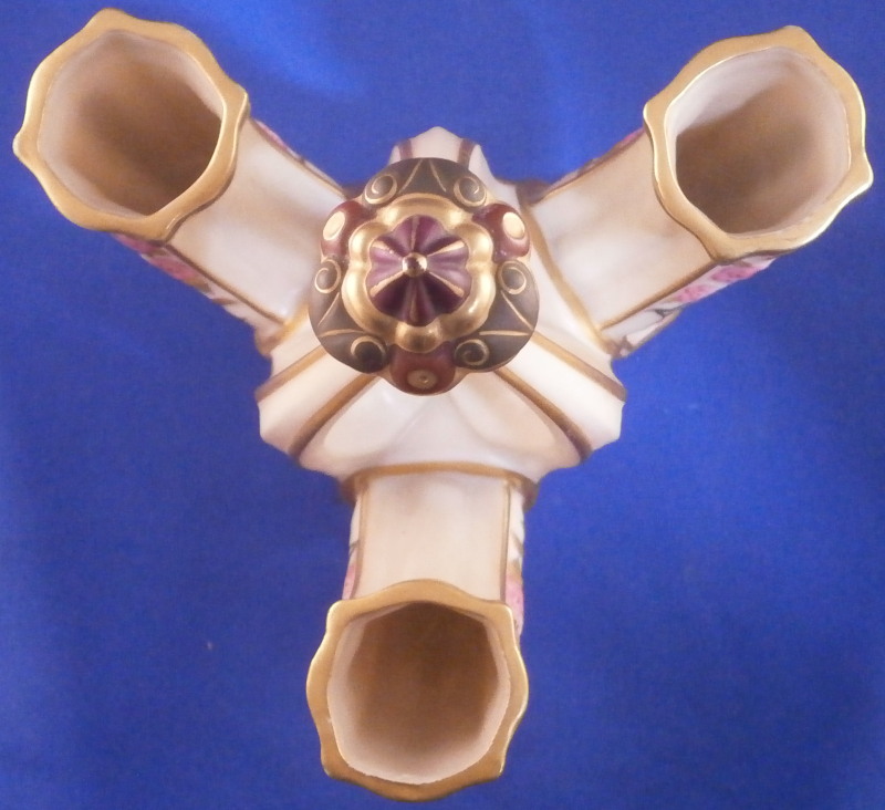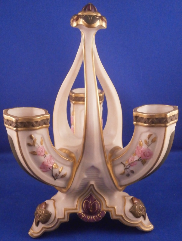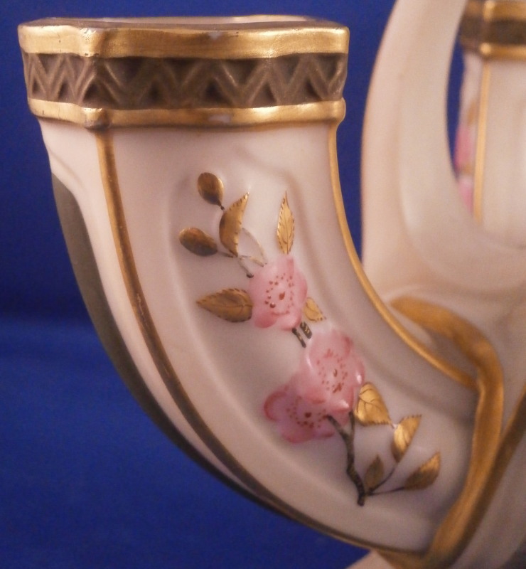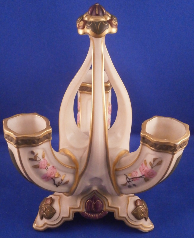 This is a fun and rare Chinoiserie triple spill vase made by Worcester in the 19th century - 1873 to be more exact. It is typical for the aesthetic period it was made in. The piece has a superb shape with three openings and a handle in the center made of three pieces coming together at the top. The porcelain has that nice warm ivory color, there is lots of molded detail and gold trim. Each vase has a pink floral design to the sides - possibly cherry blossoms and the top of the handle as well as the corners and centers of the base have a leaf design to it in olive green, maroon and purple. A stunning looking piece that amazingly is in perfect condition bar for a tiny touch of gold wear to the very tip of the handle. The piece is about 7.5 inches tall, 5.625 inches at the widest point and 5.25 inches deep. The piece is marked underneath with the puce Worcester mark (twice - one jsut a partial one), an impressed Worcester mark and incised W as shown. The year mark is a 73. Really a fun specimen for this period! Please email me for more information or other pictures.