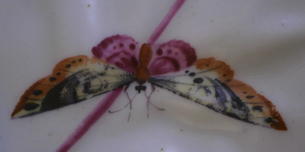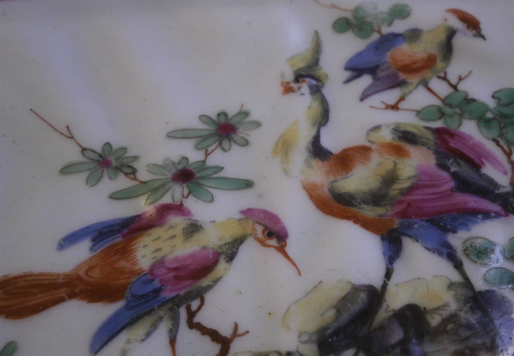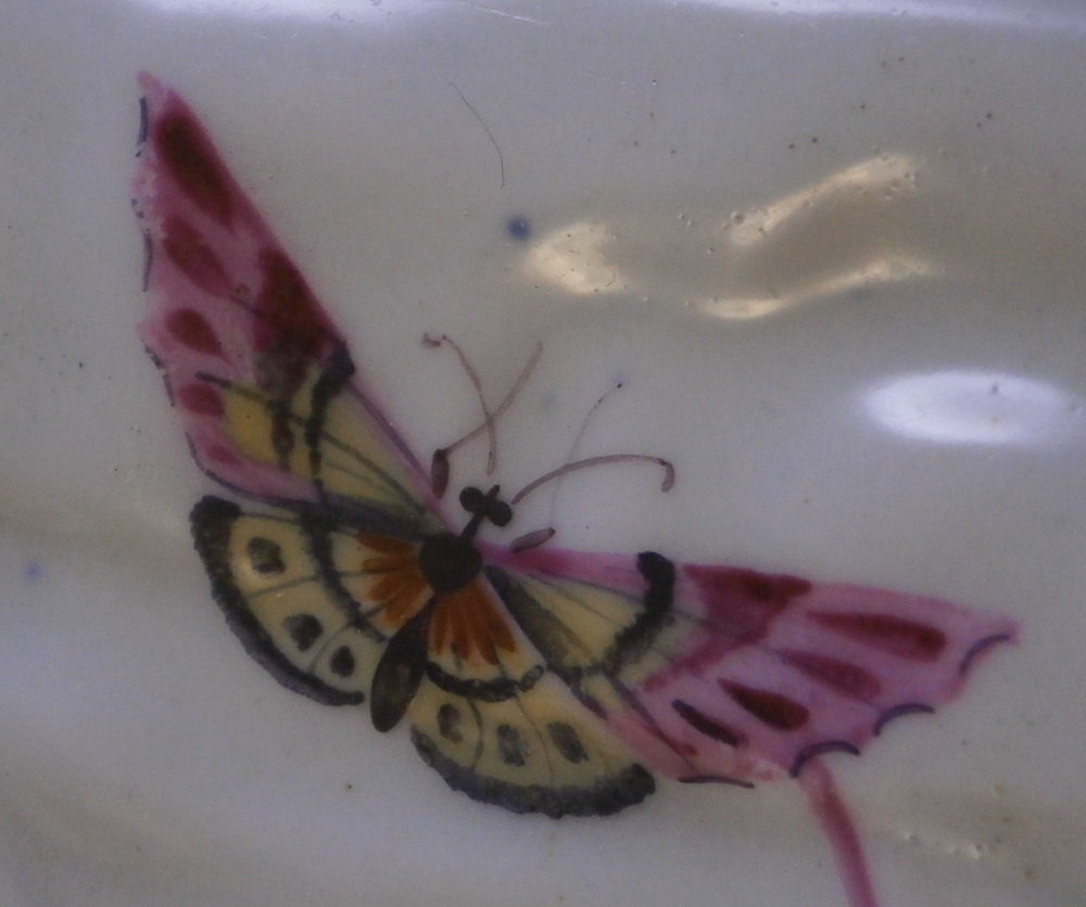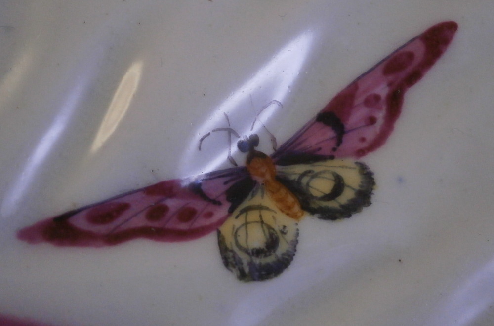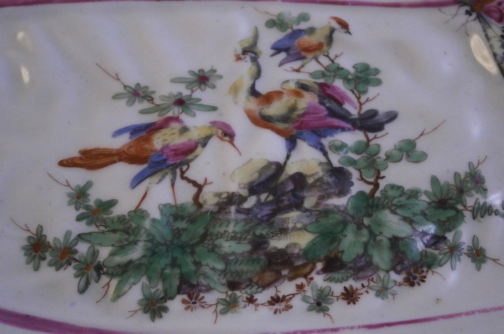 This is a rare leaf dish in the form of two overlapping cabbage leaves made by Worcester in around 1765. It has a really nicel shape to it with the veins of the cabbage leaves showing in releif and the main center stem having been painted in pink. Gold trim to the edge. The center has a superb bird scene to it including three birds of paradise in a nice surrounding of plants and rocks. The rest of the dish has six butterfly / moths / bugs scattered all around. A truly superb piece! The plate is in superb condition with some minor wear to one spot of gilding and the largest bird in the scene with some scratches to the medium one though that all this is hard to spot when on display. Visible in the pictures since they are rather magnified. Some minor firing imperfections in the form of tiny black spots, etc. normal to these early wares. This example is unmarked which is not unusual for these early pieces but definitely made by them during this period! The piece is 2 inches tall at the handle/ stems with the dish being about 1.25 inches tall, 7.5 inches wide and 10.125 inches long. Please email me for more information or other pictures.