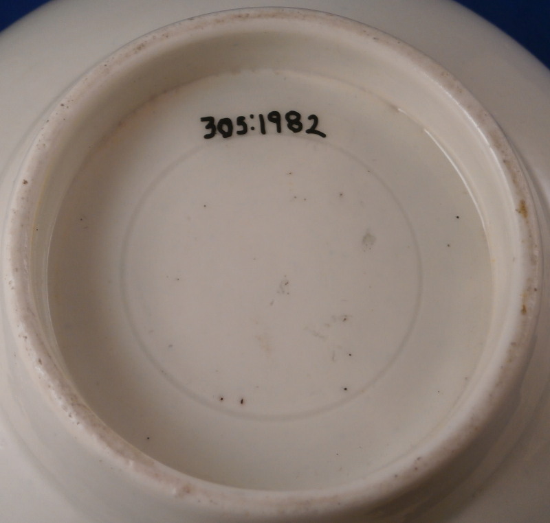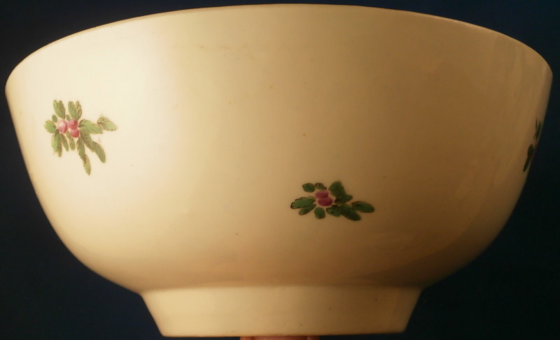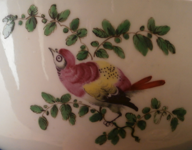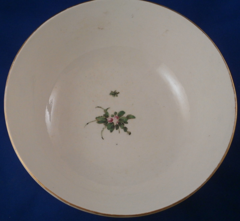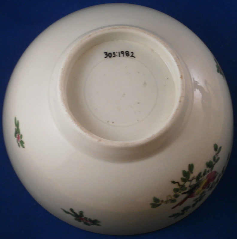 This is a nice waste / slop bowl made by Worcester in the 18th century. It is hand painted with a nice polychrome bird scene to the front as well as some flowers to the rest of the putside and another one to the bottom inside. Gold trim to the top edge. The piece is in superb condition with some use marks to the inside but otherwise perfect. The bowl is 2.75 inches tall and has a diameter of 6.125 inches. The piece is not marked which is not unsusual for their early wares. It has an old museum or collector's ID underneath as shown. . Please email me for more information or other pictures.