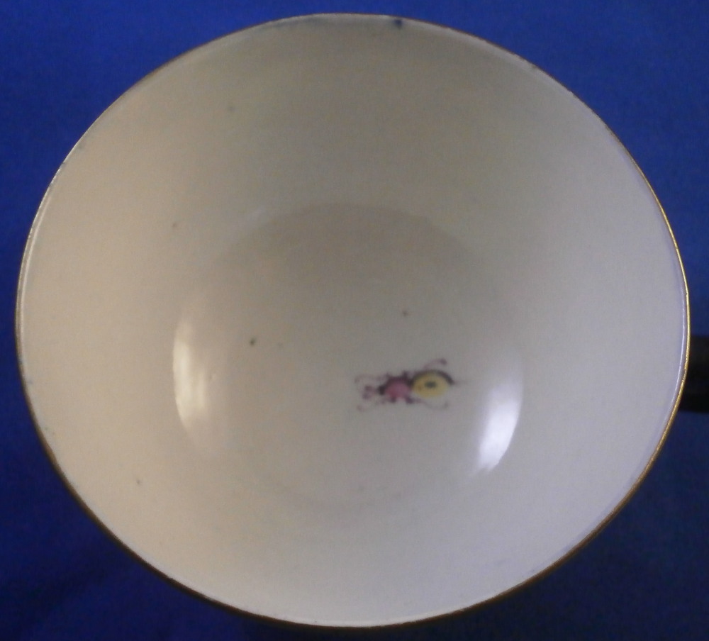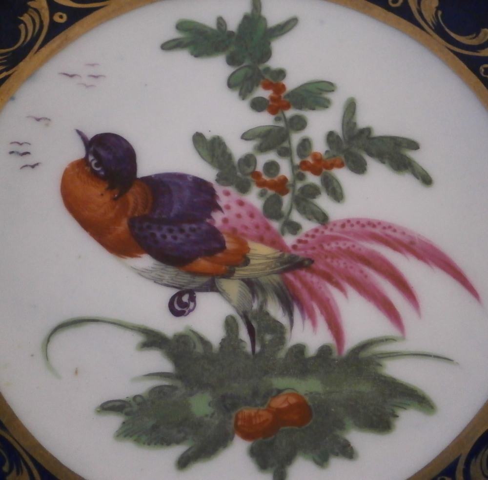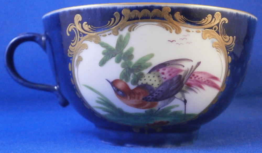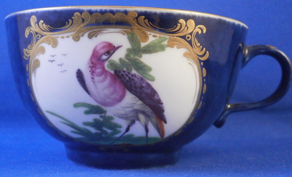This is a superb early cup and saucer made by Worcester in the 18th century. A truly great looking combination of the blue ground color, some nice gilding as well as a hand painted scene of an exotic bird sitting on a branch in the center of the saucer and a same style scene on each side of the cup. Each scene is surrounded by a nice gold trim with gilding along the edges of the set and some gold highlights to the handle of the cup. The cup and saucer are both in superb condition with the saucer having a small rough area to the very edge. it is gilded over and probably from when it was made. Invisible when on display or even from closeup but I am showing it in the pictures. The blue ground is a bit uneven in circular spots mainly on the opposite side of the handle on the cup as shown. It was made this way. All very minor and it displays superbly. The cup is 1.875 inches tall and has a diameter of 3.25 inches. The saucer is about 1.125 inches tall and has a diameter of 5.125 inches. Both are marked with the under glaze blue crescent mark as shown. Please email me for more information or other pictures.