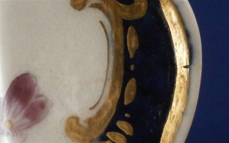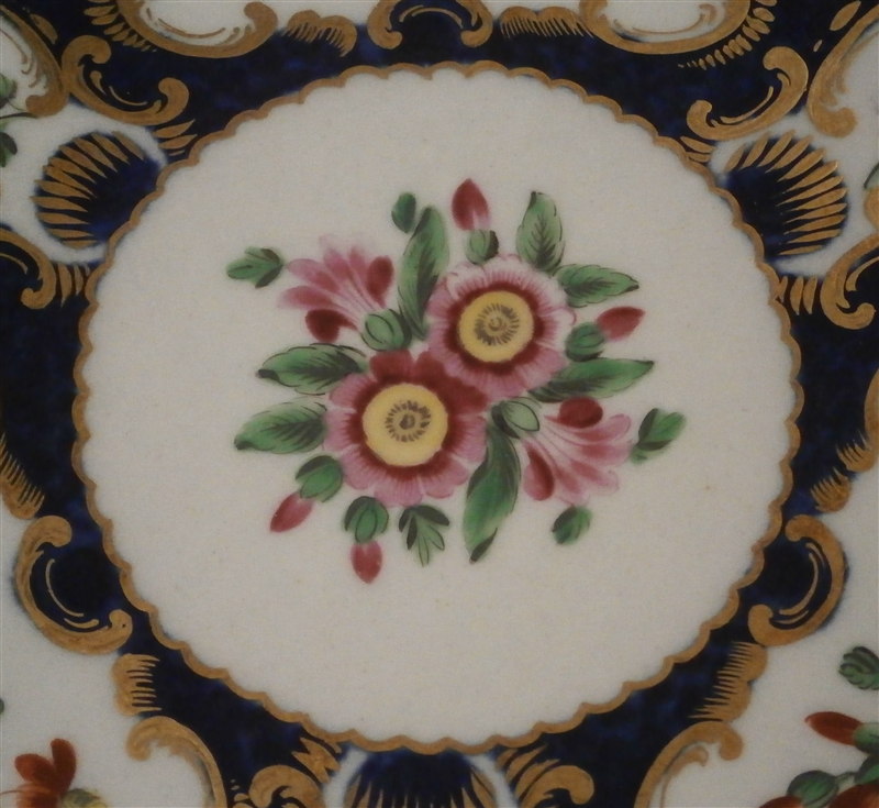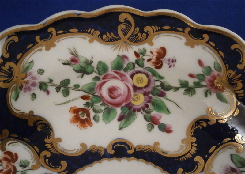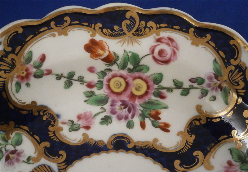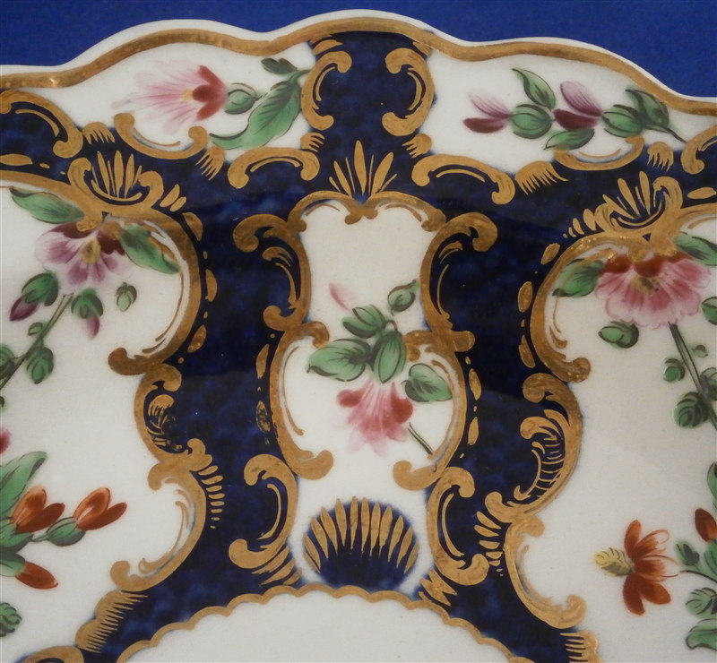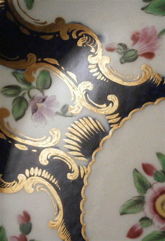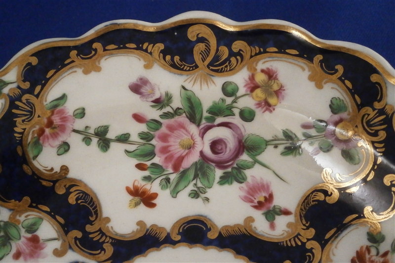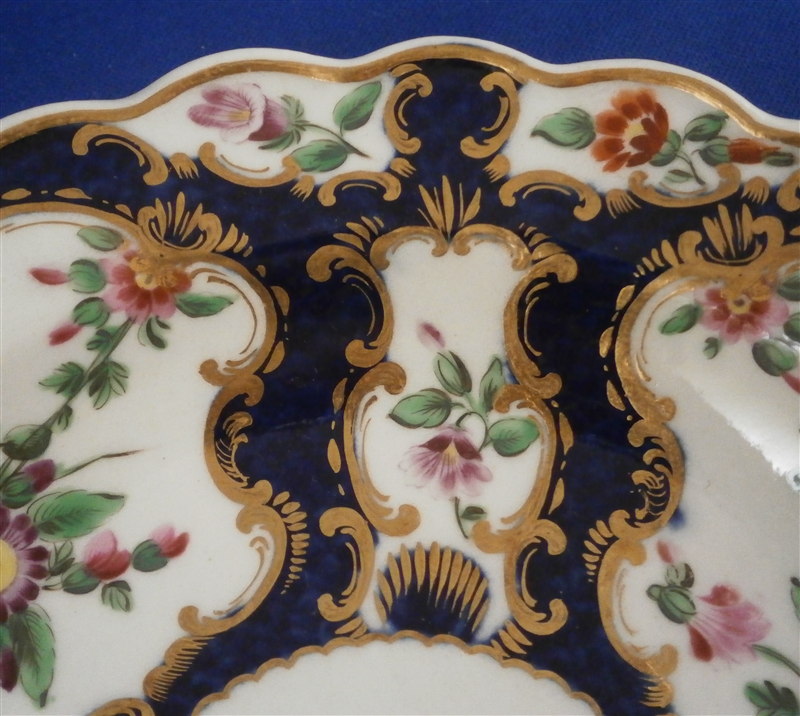 This is a really fun plate made by Worcester in the 18th century. It is hand painted with lots of floral arrangements on white ground panels surrounded by some nice gilding with the rest of the piece having a blue scale ground which makes this one elegant plate! The quality of the painting is very nice as is the gilding. The plate is in great condition with one short hairline almost invisible from the front and two tiny spots of gold flaked off the edge trim so it displays perfectly! The dish is 1.25 inches tall and has a diameter of 7.5 inches. It is marked with their blue crescent mark as shown in underglaze blue. Please email me for more information or other pictures.