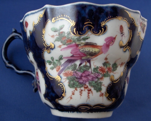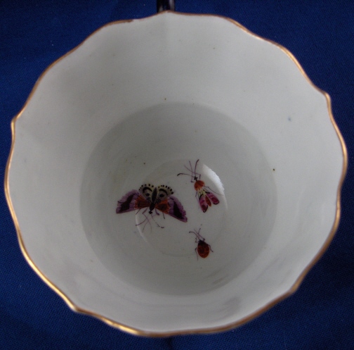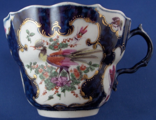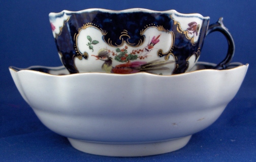 This is an early cup and saucer made by Worcester around 1760. Both pieces are handpainted with two or three superb polychrome bird scenes as well as lots and lots of bugs. There are even three on the bottom inside of the cup. The quality of the painting is top notch and the cartouches are surrounded with some nice gilding and the spaces in between are filled with their famous blue scale design. An amazing set that is as good as it gets for them. The set is rather large, too probably a breakfast cup and saucer and the saucer is so deep you could use it for cereal these days. The deepest saucer I have ever seen and I have seen a few :) The cup and saucer are both in perfect condition. The cup is 2.625 inches tall and has a diameter of 3.75 inches. The saucer is 1.875 inches tall and has a diameter of 5.75 inches. Each piece is marked with their square fret mark underneath in underglaze blue. Please email me for more information or other pictures.