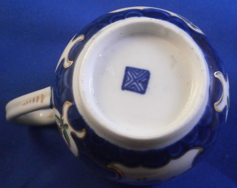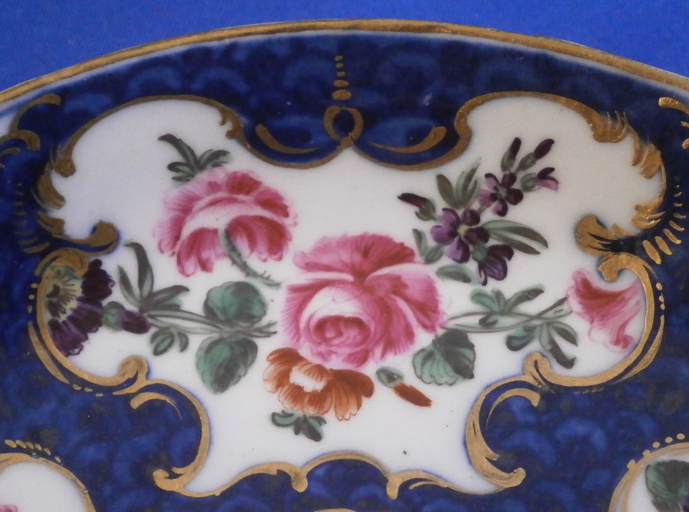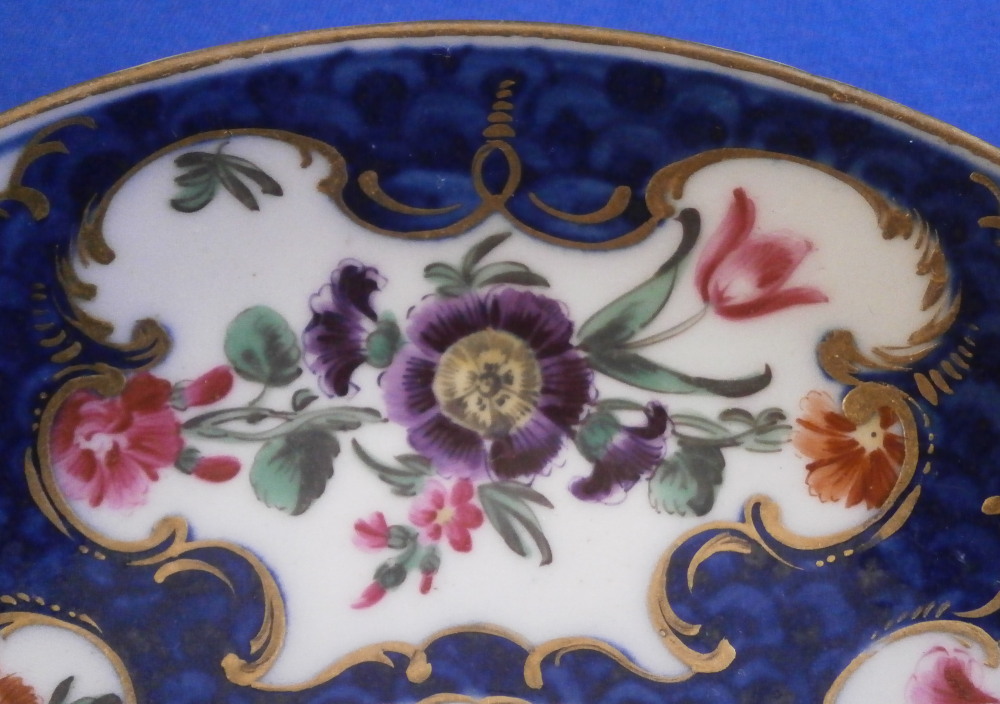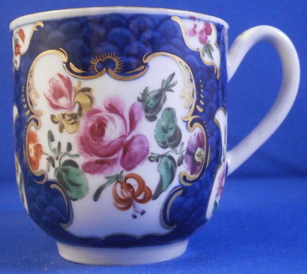This is a superb cup and saucer made by Worcester in the 18th century. The set is hand painted with lots of floral arrangements on white ground panels surrounded by some nice gilding with the rest of the pieces having a blue scale ground which makes this one elegant plate! Three larger floral panels each separated by three smaller panels of single flowers with a flower in the center of the saucer. A handle to the cup with a bit of gold trim to it and golding to the edges of both pieces. The quality of the painting and the colors are extra nice on this example. The cup & saucer are in superb condition with the tiniest bit of wear to the gilding but as good as they come and they display perfectly! The saucer is 0.875 inches tall and has a diameter of 4.625 inches. The cup is 2.375 inches tall with a diameter of 2.25 inches. Both are marked with their fret mark in under glaze blue as shown which is nice as many of these sets are unmarked. Please email me for more information or other pictures.
