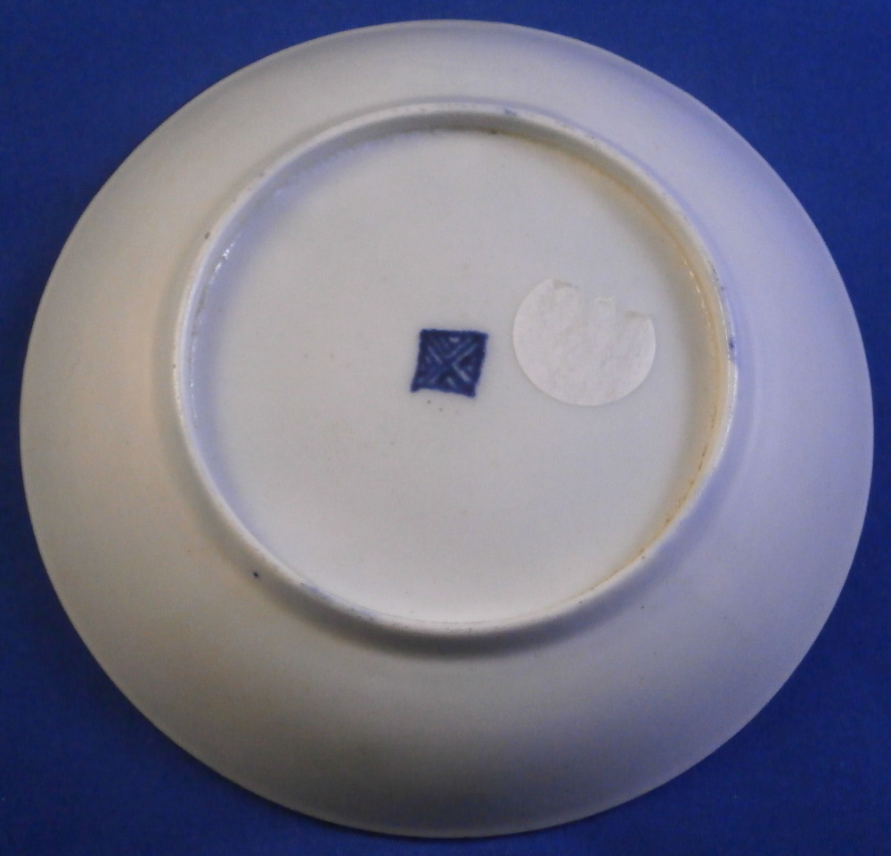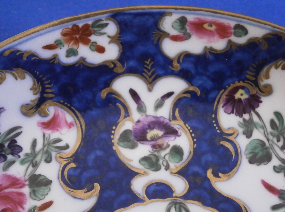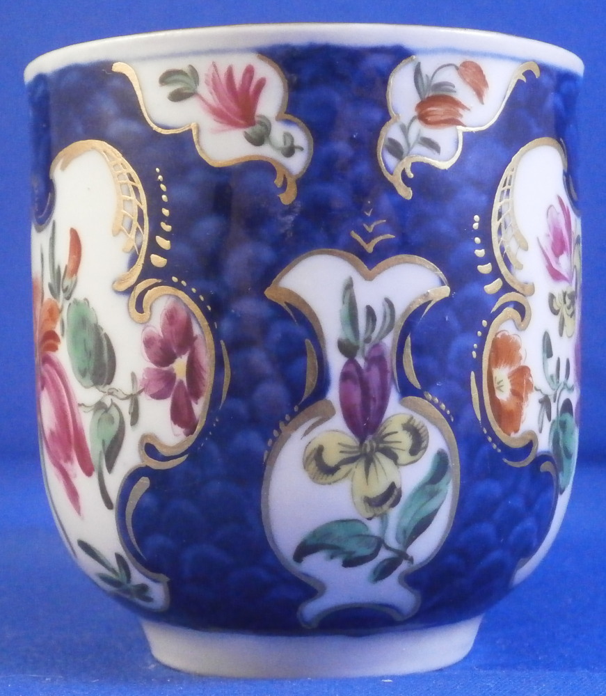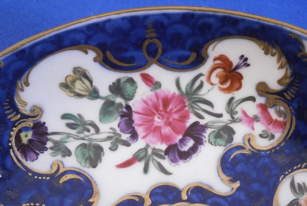 This is a superb cup and saucer made by Worcester in the 18th century. The set is hand painted with lots of floral arrangements on white ground panels surrounded by some nice gilding with the rest of the pieces having a blue scale ground which makes this one elegant plate! Three larger floral panels each separated by three smaller panels of single flowers with a flower in the center of the saucer. A handle to the cup with a bit of gold trim to it and golding to the edges of both pieces. The quality of the painting and the colors are extra nice on this example. The cup & saucer are in superb condition with the tiniest bit of wear to the gilding but as good as they come and they display perfectly! The saucer is 0.875 inches tall and has a diameter of 4.625 inches. The cup is 2.375 inches tall with a diameter of 2.25 inches. Both are marked with their fret mark in under glaze blue as shown which is nice as many of these sets are unmarked. Please email me for more information or other pictures.