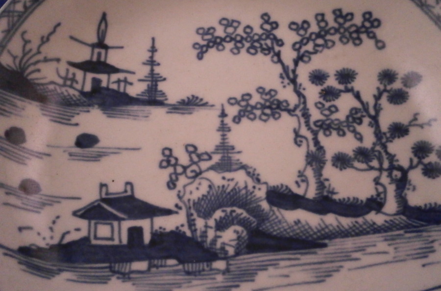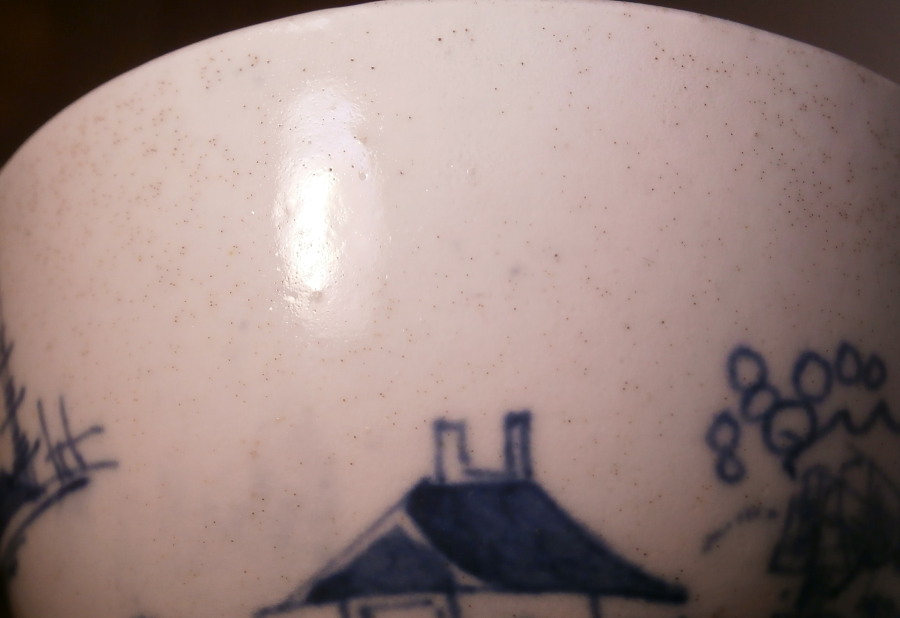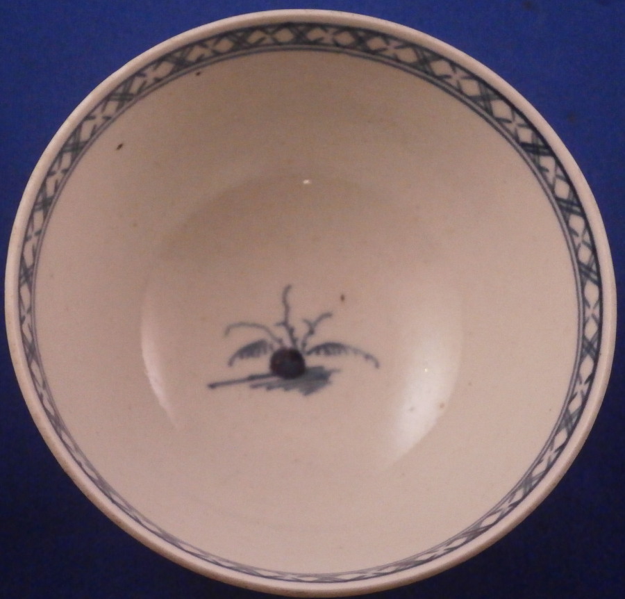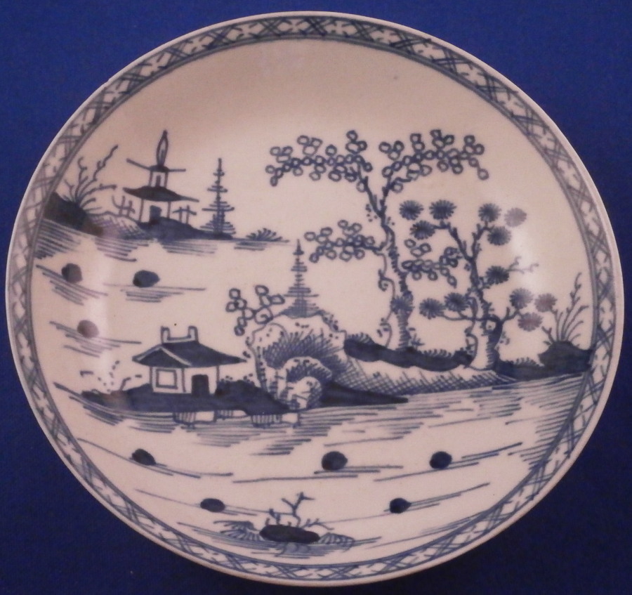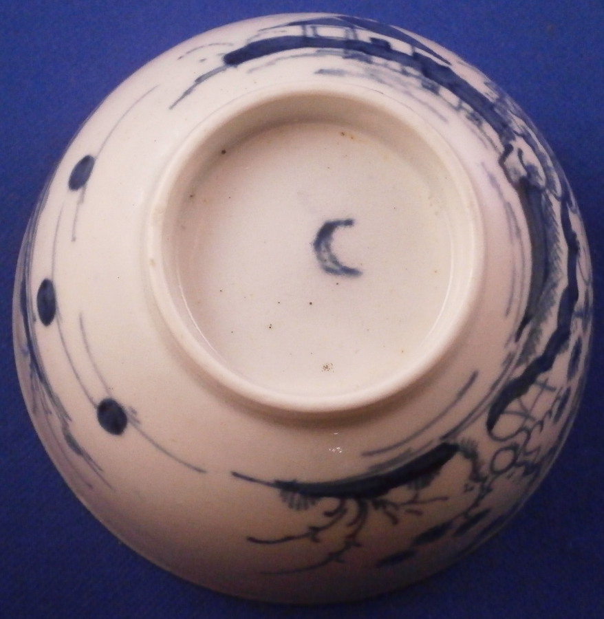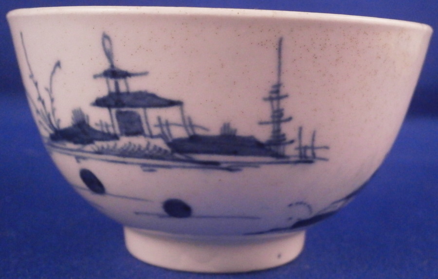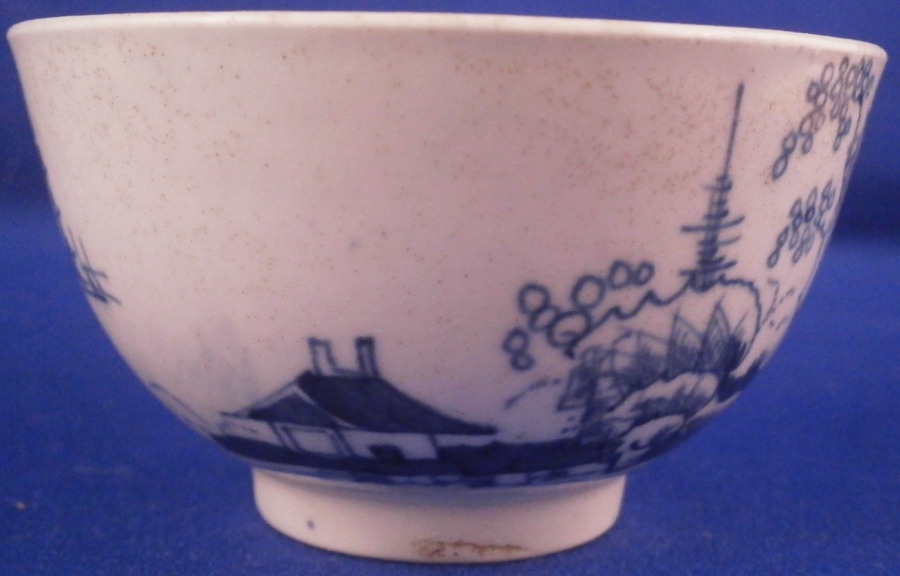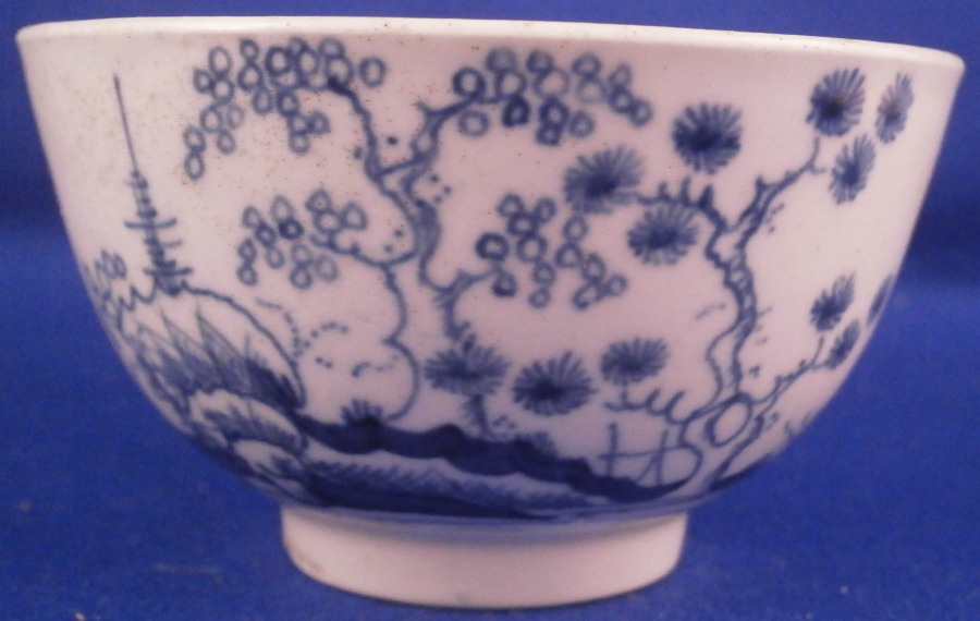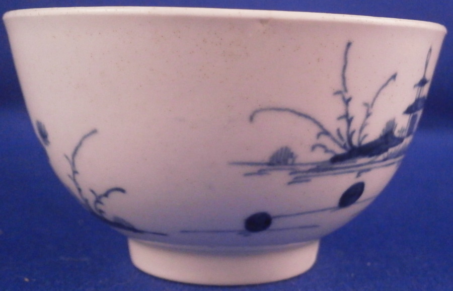 This is a great cup and saucer made by Worcester in the 18th century. The set is decorated in under glaze blue with the so called cannonball pattern because of those solid round blobs all over the scene. Not a common pattern at all expecially on a teabowl shaped cup and saucer. The pattern is rather nice with two buildings in the scene, a coupe of fancy trees and off course the "cannonballs". Nice trim to the inside edge. Both the cup and the saucer are in great condition with the cup having a manufacturing flaw to the outside of the footring and lots of light tiny black spots from the firing process. Not unsual and not obvious when on display so they look great! Both are marked with the open blue crescent mark underneath. The cup is 1.75 inches tall and 3.125 inches in diameter. The saucer is 1 inch tall and 4.875 inches in diameter. Please email me for more information or other pictures.