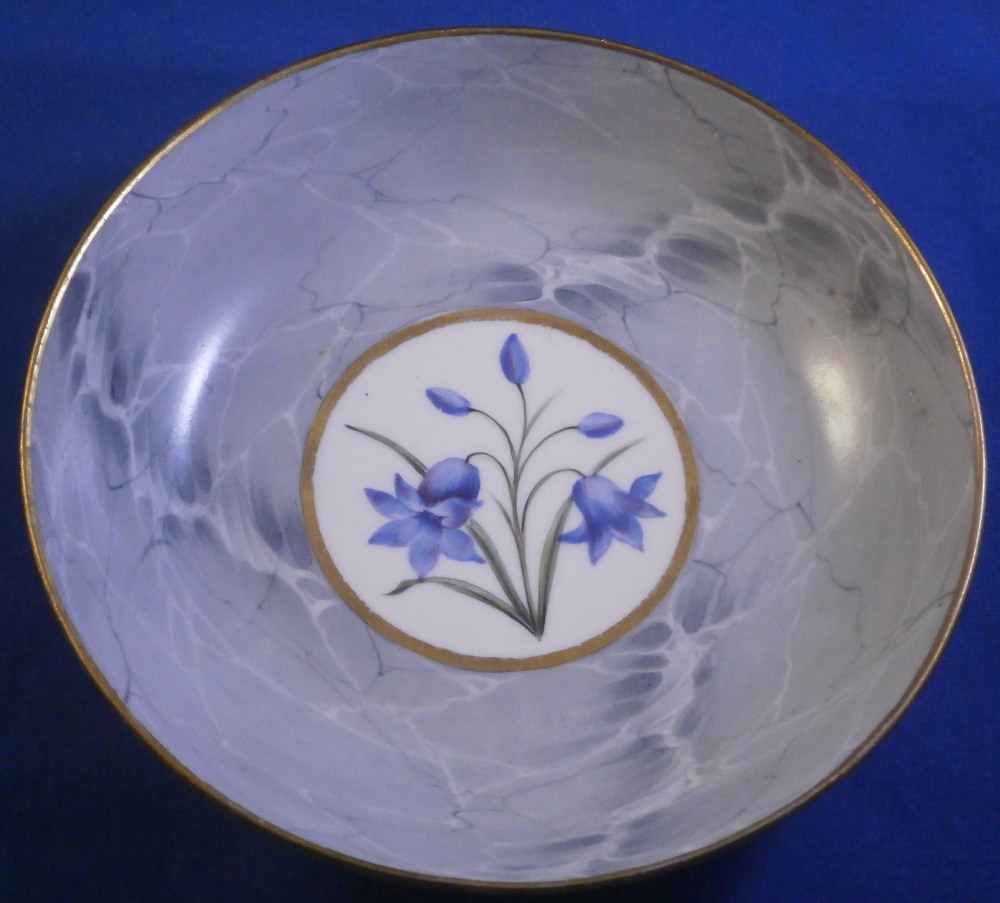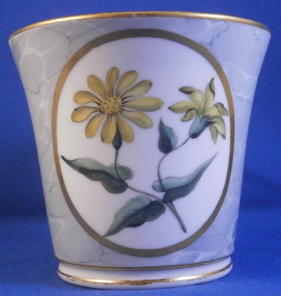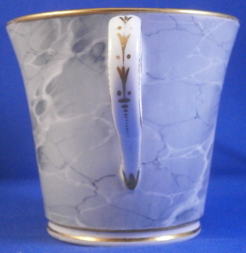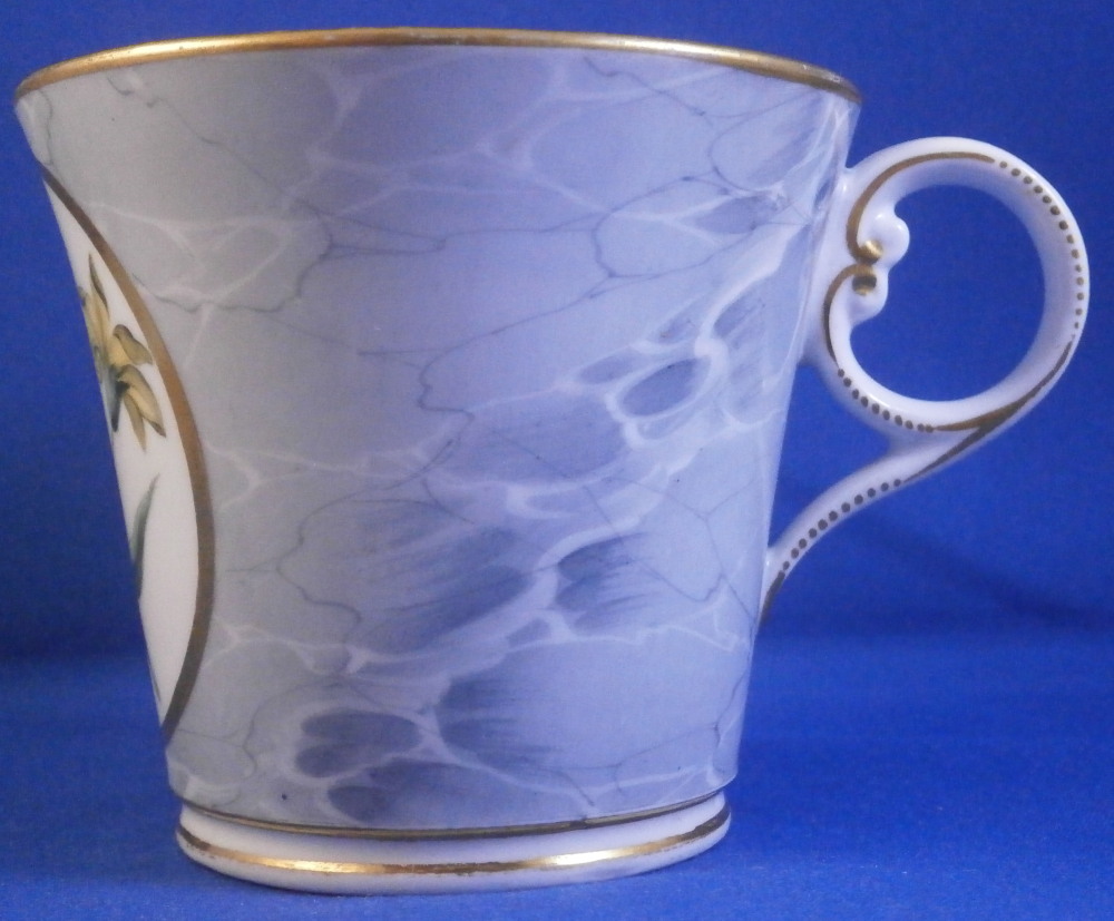 This is a superb cup and saucer made by Chamberlains Worcester in the early 19th century, around 1820. The set is decorated with a truly great looking combination. Each piece has a hand painted botanical specimen of a flower - one yellow and one blue. These cartouches are surrounded by a gold frame with the rest of the set having a superb marble type ground to them. Gold ring to the inside of the cup and a simple gold trim to the edges. Kidney shaped ring handle to the cup with some gilt highlights to it. The saucer is in great condition with the most minor wear to the gold trim on the edge and a black firing spot to the outside edge. The cup displays perfectly but has a tight hairline to the front as shown. The marbled ground easily makes up for this flaw as the set looks amazing! The cup is 2.625 inches tall and has a diameter of 3 inches. The saucer is 1.25 inches tall and has a diameter of 5.5 inches. Neither piece is marked which is not unusual at all. Please email me for more information or other pictures.