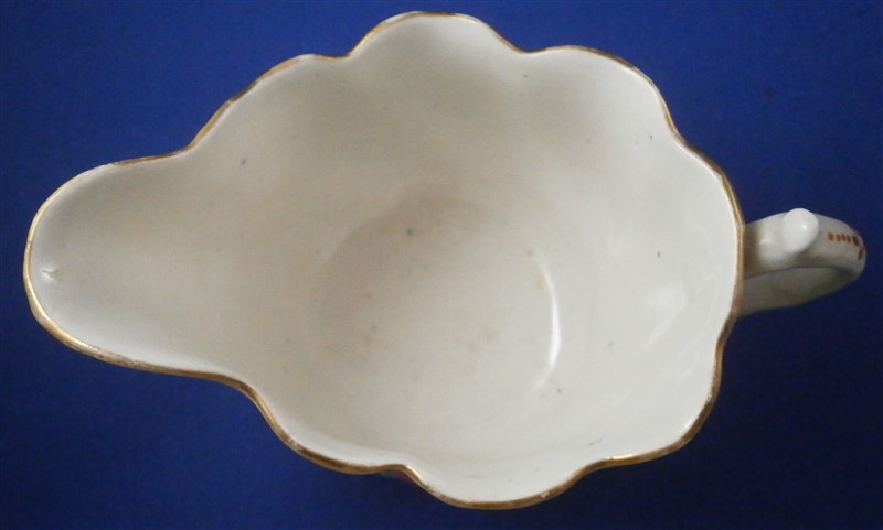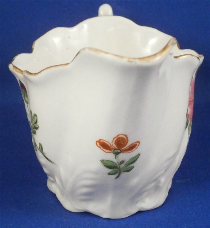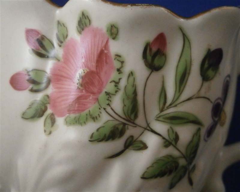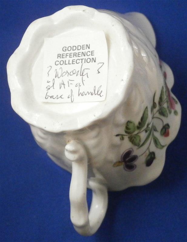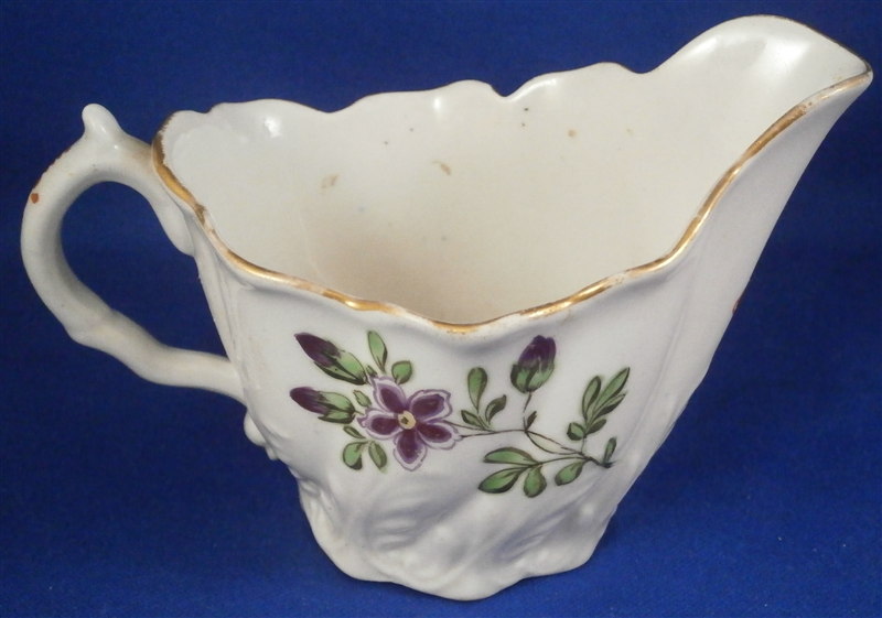 This is a cream boat made by Worcester in the 18th century. This shape is called the low Chelsea ewer and it is decorated with some nice hand painted polycrhome flowers and some red trim to the handle. An unsual and bit naive painting but quite nice nontheless! The paste itself has some nice relief design to it and the handle ends in a bird's head which is fun. The creamer has a nice shape to it as well. The piece is in good condition with a hairline under the handle parallel to the bottom and about an inch long. Hard to spot and stable so it is no issue really and it displays perfectly! Some wear to the gold trim on the edge. The creamboat is 2.625 inches tall, 4.25 inches long and 2.75 inches wide. It is not marked but that is pretty normal. It does have an old sticker from the Godden reference collection underneath as shown. Please email me for more information or other pictures.