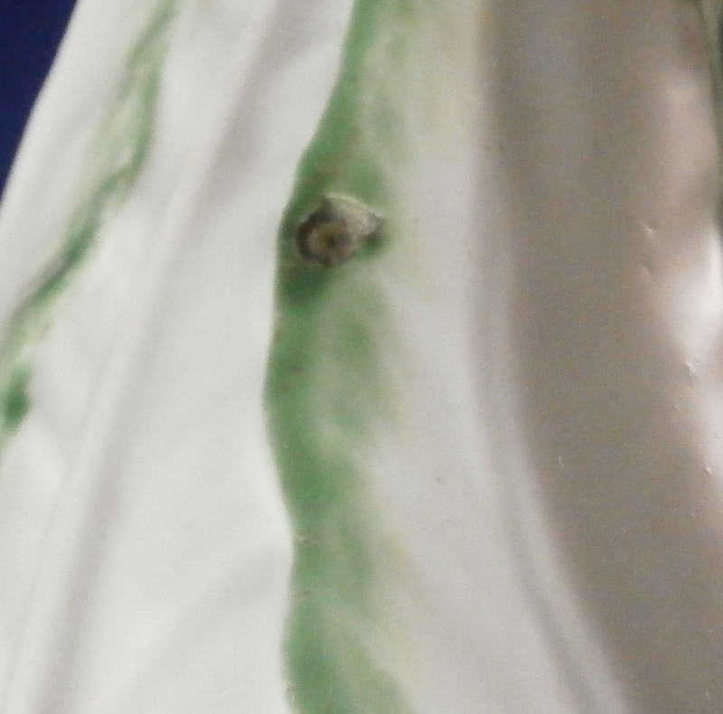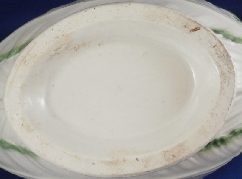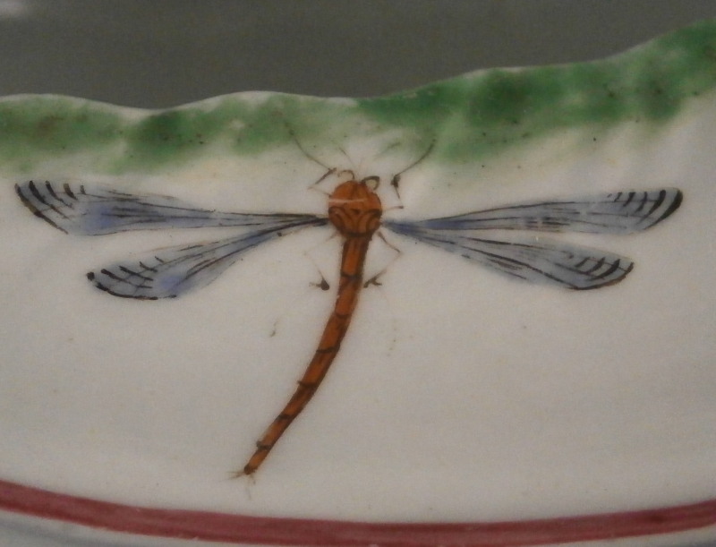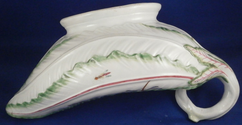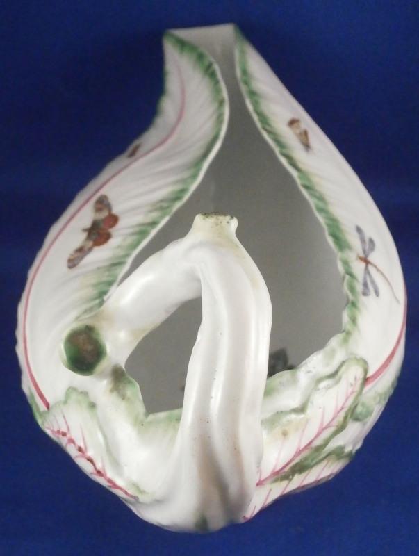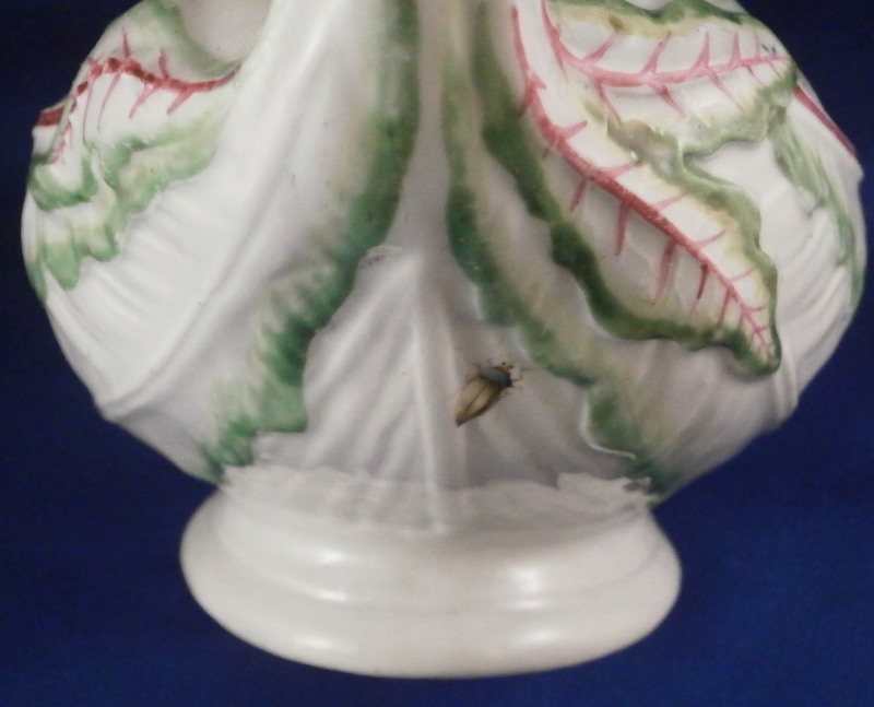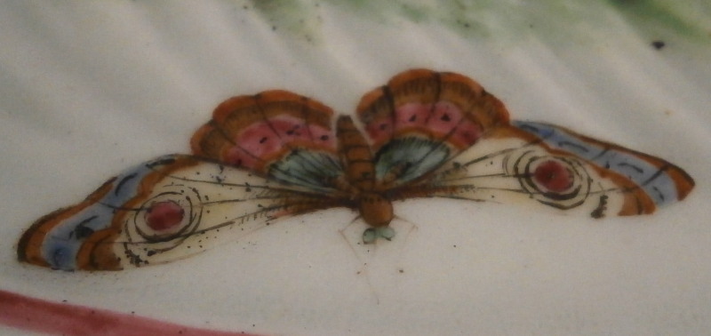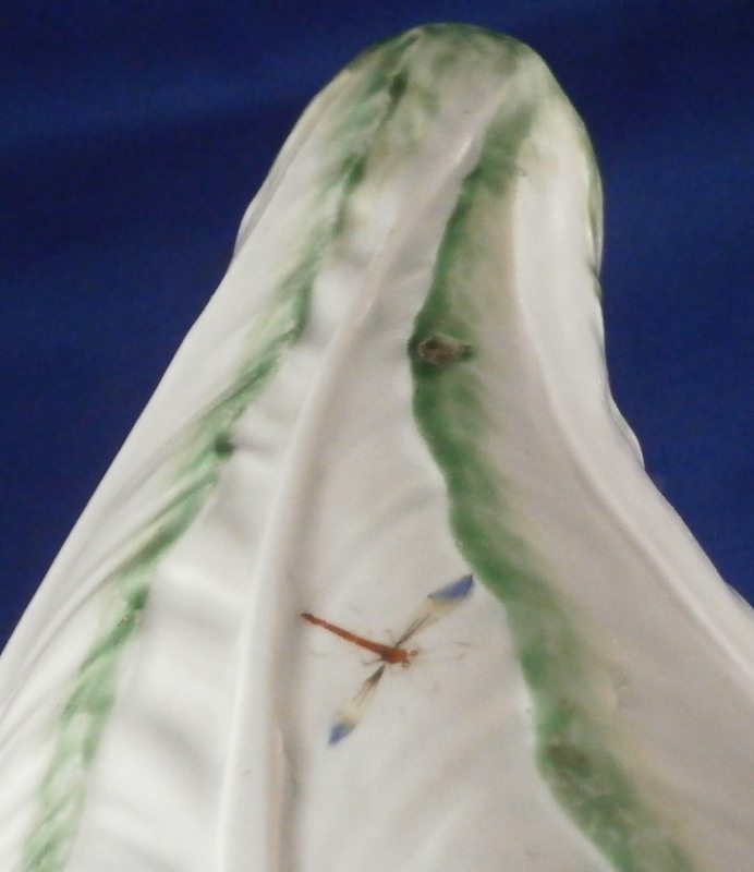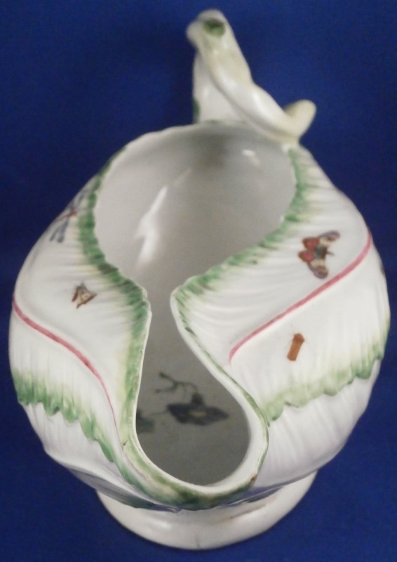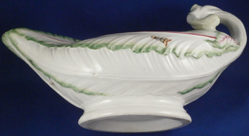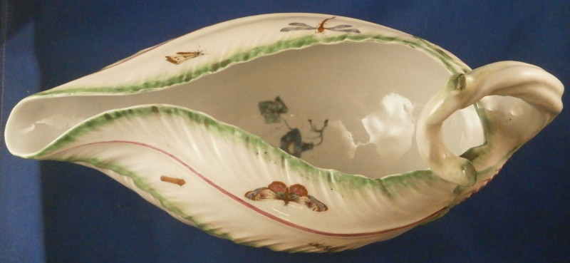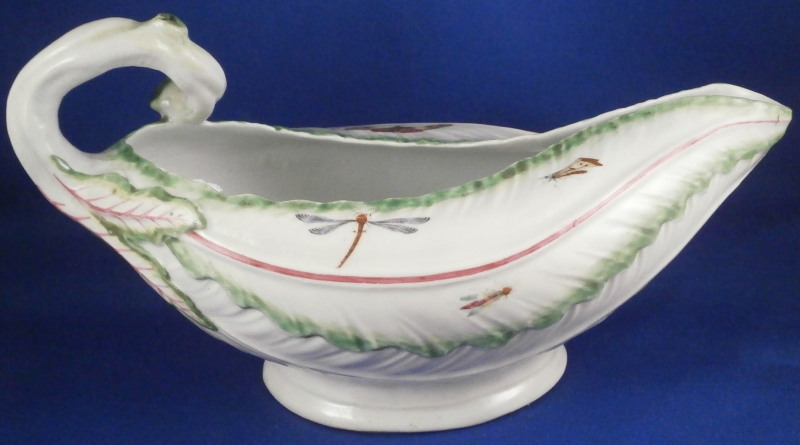 This is a really nice sauce boat made by Worcester in the mid 18th century. It is modeled after a cos lettuce head with the leaves showing the individual veines and the edges painted green, a looped handle at the end with some smaller leaves coming off it. The dish is hand painted very nicely with the green and a bit of puce trim but the best part is that there are little bugs painted all over the piece as shown. Love them! The inside bottom has a small flower with a leaf painted in it. The sauce dish is in superb condition with a tiny bit of wear, a little bit of kiln dust and a few firing flaws. The only one worth mentioning is the on to the front under the spout which has a large spot missing where an impurity burned through or a porcelain bubble burst and left no glaze or color and the top layer of porcelain is gone there as well as shown. It is from the making and not a big deal but needs to be mentioned. The piece is not marked underneath which is normal during this period on these pieces! It is 5.25 inches tall, 9.75 inches long and 4.625 inches wide so a larger version than most. Please email me for more information or other pictures.
