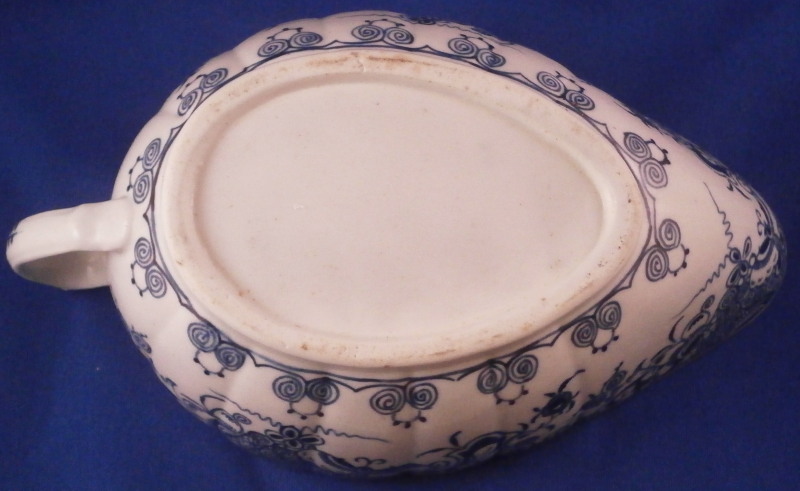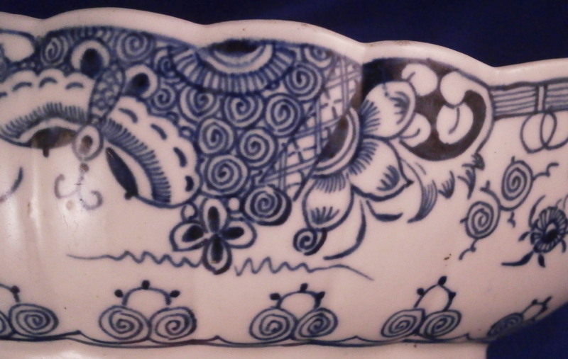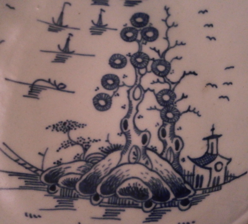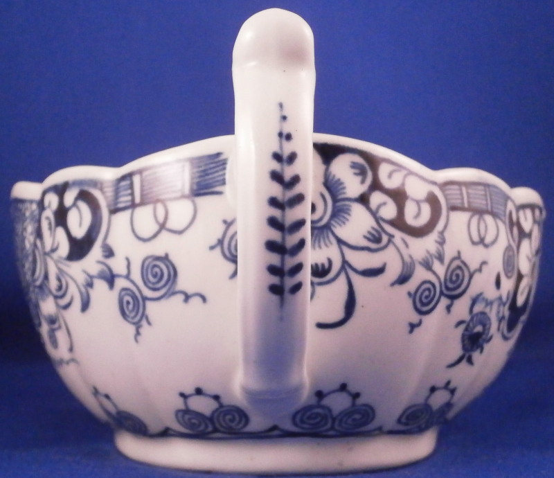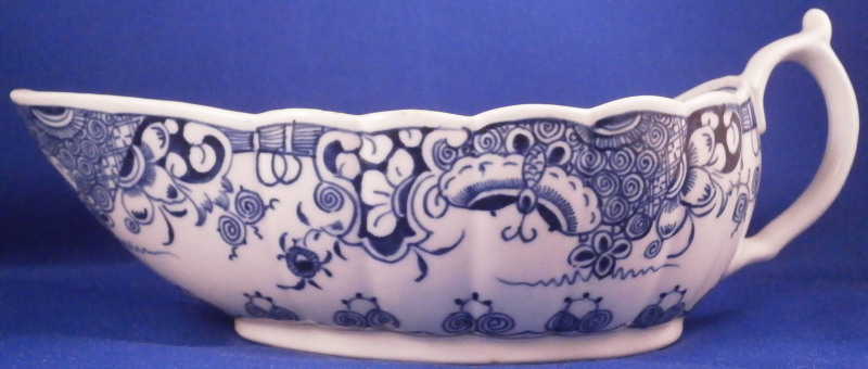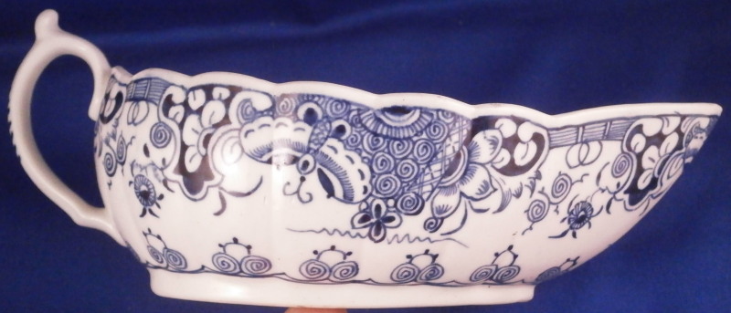 This is a really nice sauceboat made by Worcester in about 1770. It was decorated with the " Donut tree pattern " a design made for us here in America if there ever was one :) in under glaze blue. A stunning design that covers most of the outside, a nice rim design to the inside and the name giving doughnut tree to the bottom inside growing on an island with a buidling next to it. Some birds and little boats to the side and another island above it with two more houses on it. Typical handle shape with a bit of blue trim to it. The sauce boat has a nice shape to it and is amazingly in the same condition as when it left the factory. Perfect! The sauce dish is unmarked underneath which is not unusual but has all the characteristics of early Worcester porcelain including the greenish translucency and the glaze gap near the inside foot ring. The piece is 2.875 inches tall including the handle, 7.125 inches long and 4.25 inches wide. Please email me for more information or other pictures.