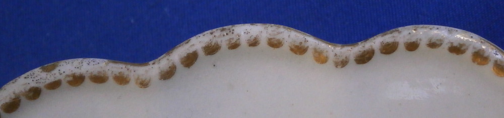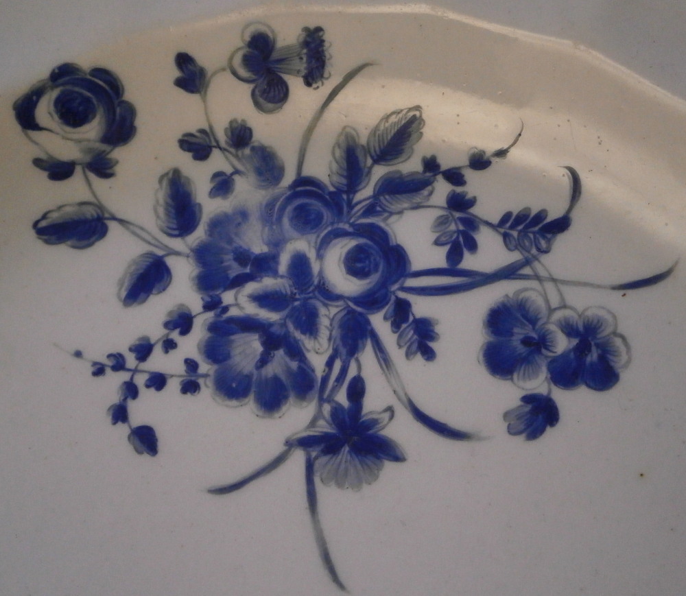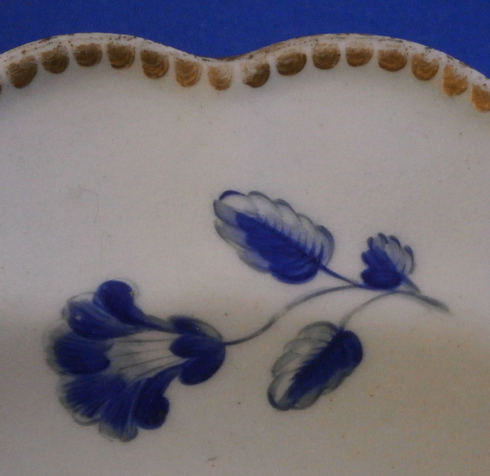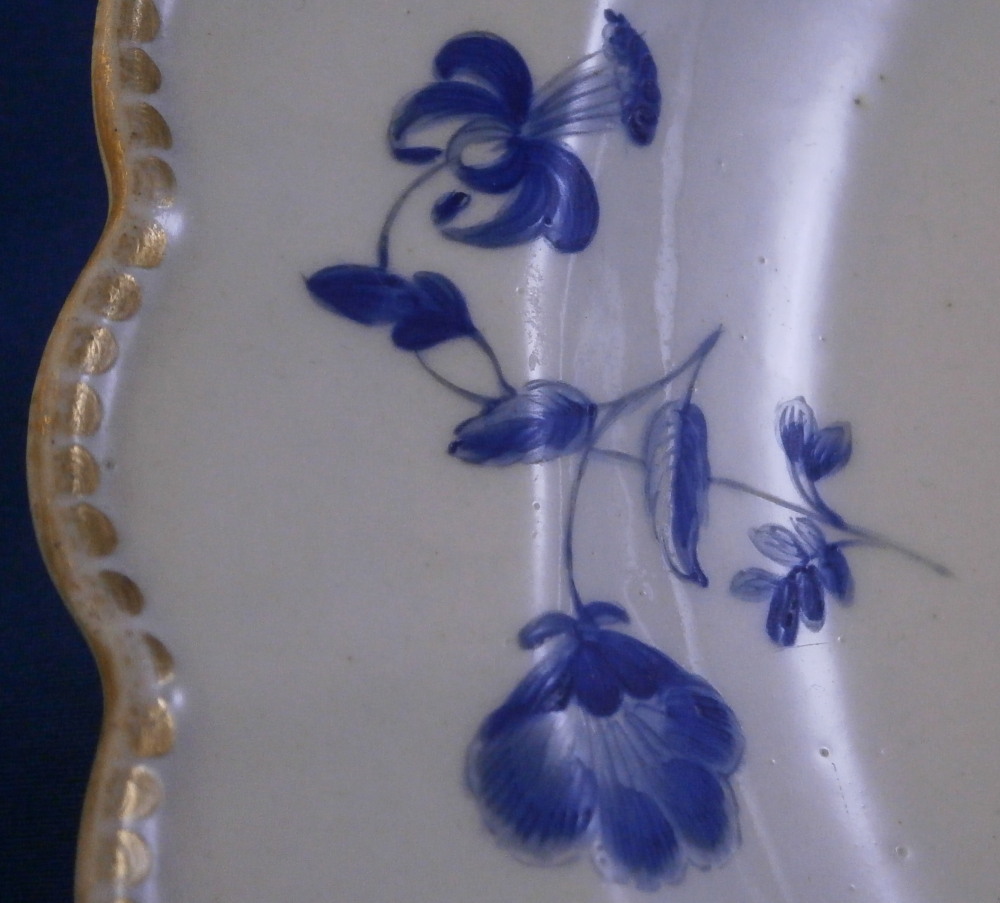 This is a rare plate made by Worcester around 1760-65. The piece is hand painted with their famous dry blue flowers and a nice dentil gold trim. Not something you see often in plates. The plate has a large floral arrangement to one side of the well with three larger flowers along the rim and a few tiny flowers/buds/leaves scattered about. Nicely shaped edge. The piece is in great condition with some wear to the gilding which was painted over kiln dust along the edge so that shows more now. A touch of wear to the flowers from stacking but all in all a really nice and rare example! The blue color is amazing and it being hand painted is a nice bonus. The plate is unmarked but quite obviously made by them. It is 1.375 inches tall and has a diameter of 7.625 inches. Please email me for more information or other pictures.