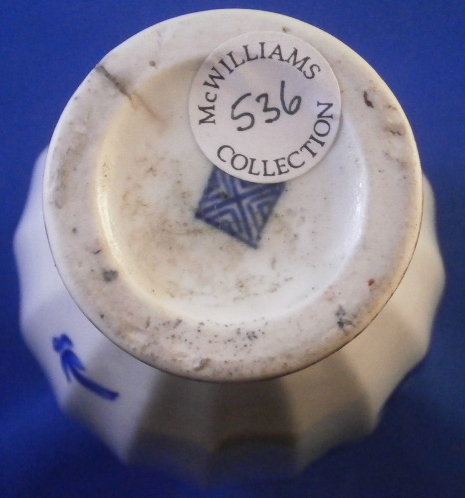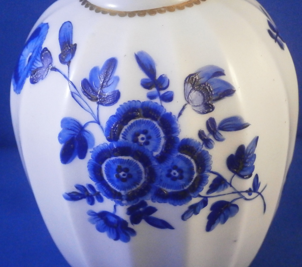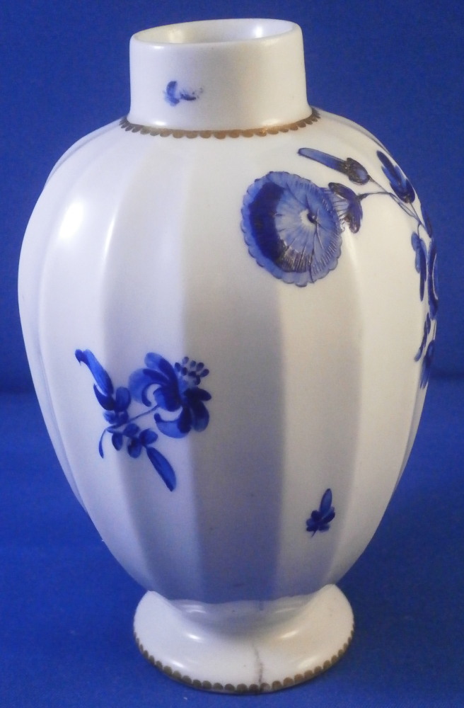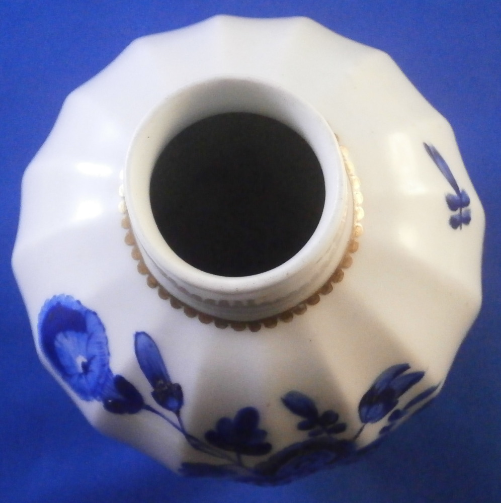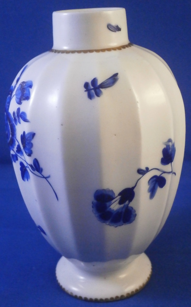 This is a superb tea caddy / jar made by Worcester in the 18th century. The piece is hand painted with their famous dry blue flowers and a nice dentil gold trim. A great combination especially with the faceted body of the caddy! The lid has the same design to it plus a great floral finial with two leaves. The dry blue is a very different paint and you can feel the flowers coming off the body. Really very nice! There is a large floral arrangement to one side of the well two larger and a few small single flowers filling the rest of the space. The piece is in great condition with a firing crack to the foot from when it was made and a little damage to the floral finial but it displays superbly! The blue color is amazing and it being hand painted is a nice bonus. The caddy is marked with their under glaze blue fret mark as shown. It is 5.75 inches tall and has a diameter of 3 inches. Has an old sticker from the McWilliams collection which I beleive was sold around the early 1990s. Please email me for more information or other pictures.