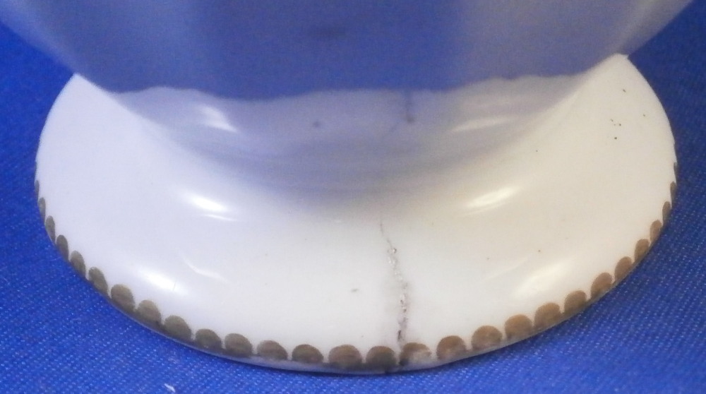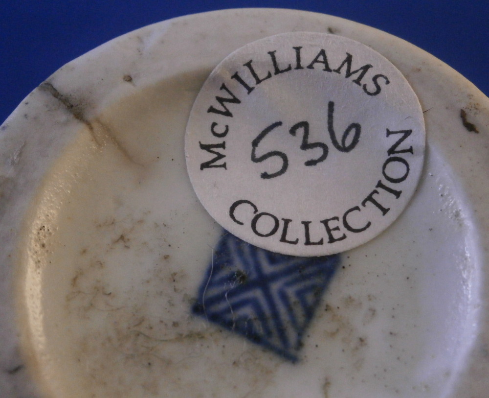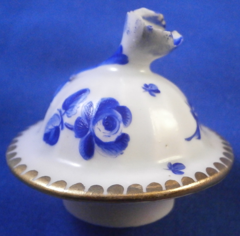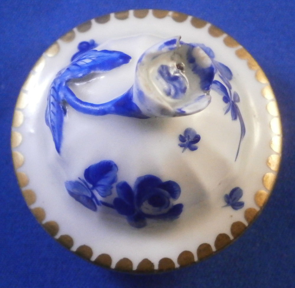 This is a superb tea caddy / jar made by Worcester in the 18th century. The piece is hand painted with their famous dry blue flowers and a nice dentil gold trim. A great combination especially with the faceted body of the caddy! The lid has the same design to it plus a great floral finial with two leaves. The dry blue is a very different paint and you can feel the flowers coming off the body. Really very nice! There is a large floral arrangement to one side of the well two larger and a few small single flowers filling the rest of the space. The piece is in great condition with a firing crack to the foot from when it was made and a little damage to the floral finial but it displays superbly! The blue color is amazing and it being hand painted is a nice bonus. The caddy is marked with their under glaze blue fret mark as shown. It is 5.75 inches tall and has a diameter of 3 inches. Has an old sticker from the McWilliams collection which I beleive was sold around the early 1990s. Please email me for more information or other pictures.