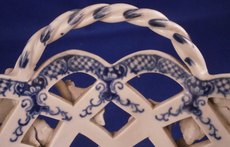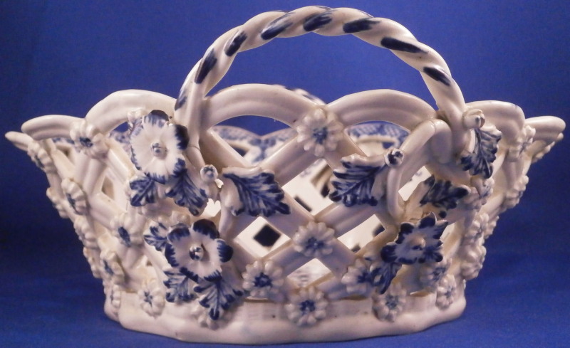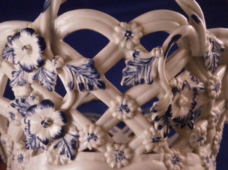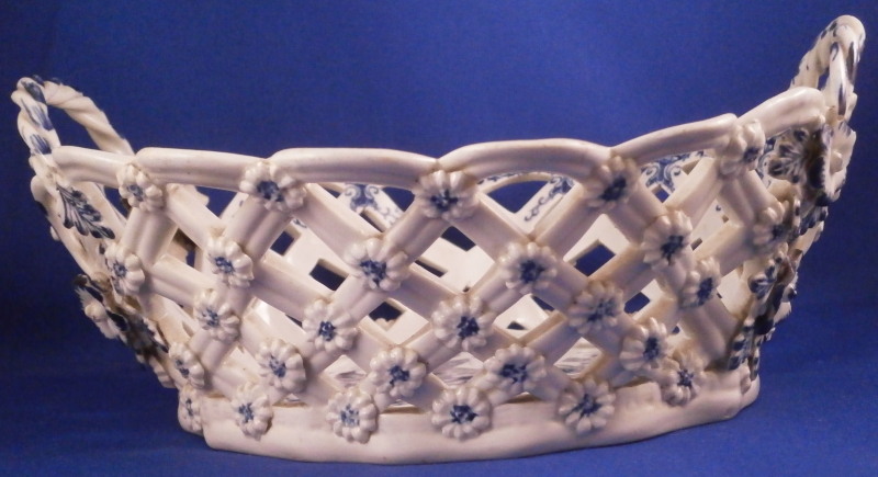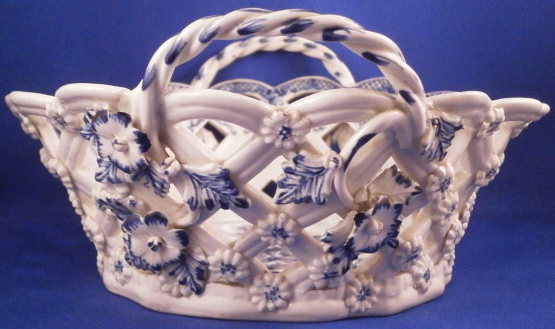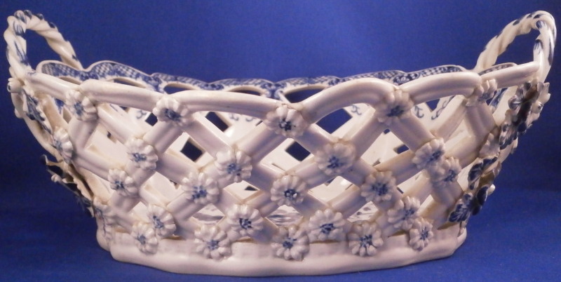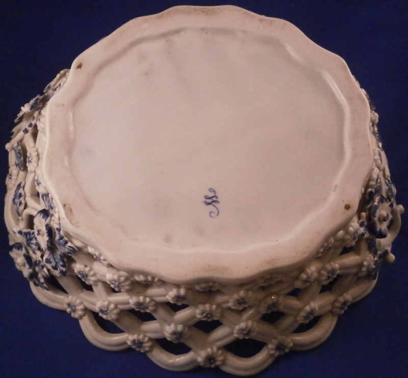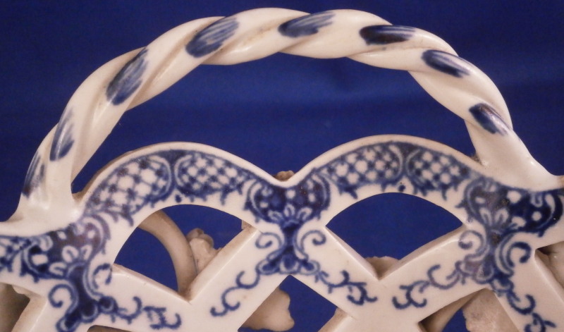 This is a superb blue and white chestnut basket made by Worcester around 1760. A nice version that is earlier than most one comes across! The piece is decorated with the pine cone pattern in under glaze blue and has reticulated sides in a lattice pattern with applied flowers on the intersections outside. A rope twist handle to either side with the terminals having molded flowers and leaves to them down the entire side not like later version just around the ends. Blue design to the inside of the sides as well. A really nice example and in great condition! One berry or flower bud is missing and a small chip or two to the petals but nothing that takes away from the piece at all. Couple of minor hairlines to the inside near the bottom and a firing crack or two but all original to the making. The basket is marked with the early script W mark as shown which is always a nice touch! The piece is about 3.625 inches tall, 8.25 inches wide and 7.75 inches deep. Please email me for more information or other pictures.