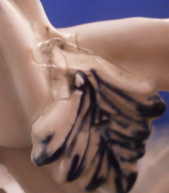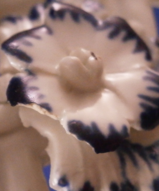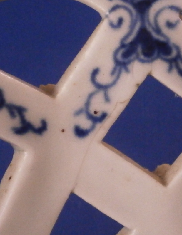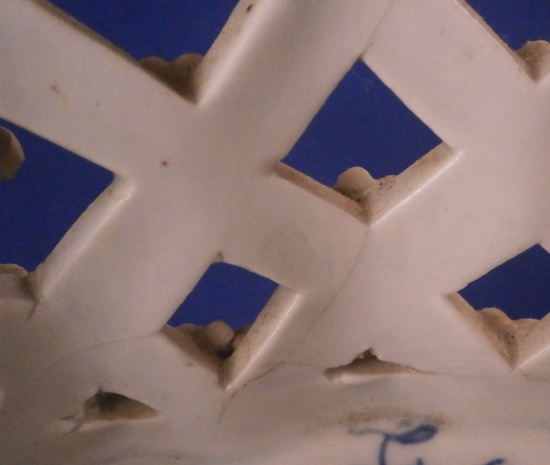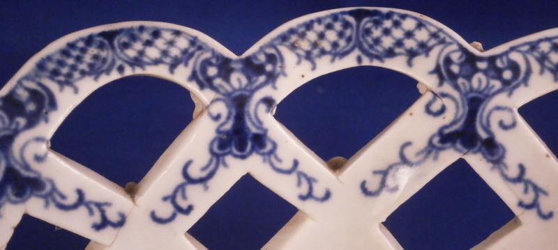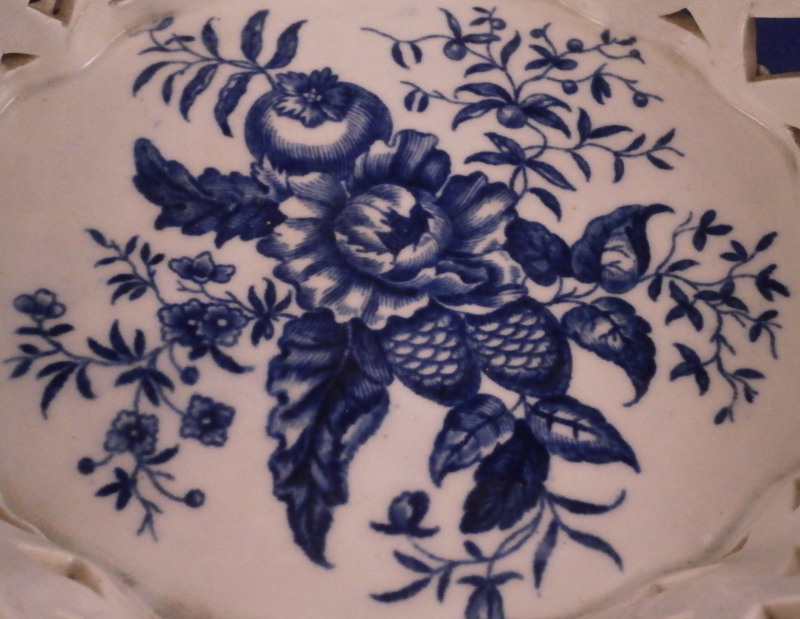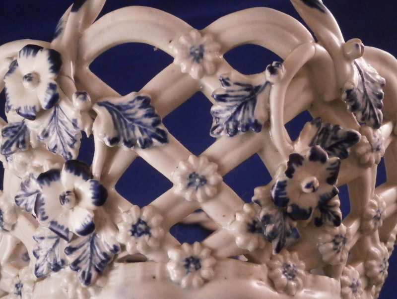 This is a superb blue and white chestnut basket made by Worcester around 1760. A nice version that is earlier than most one comes across! The piece is decorated with the pine cone pattern in under glaze blue and has reticulated sides in a lattice pattern with applied flowers on the intersections outside. A rope twist handle to either side with the terminals having molded flowers and leaves to them down the entire side not like later version just around the ends. Blue design to the inside of the sides as well. A really nice example and in great condition! One berry or flower bud is missing and a small chip or two to the petals but nothing that takes away from the piece at all. Couple of minor hairlines to the inside near the bottom and a firing crack or two but all original to the making. The basket is marked with the early script W mark as shown which is always a nice touch! The piece is about 3.625 inches tall, 8.25 inches wide and 7.75 inches deep. Please email me for more information or other pictures.