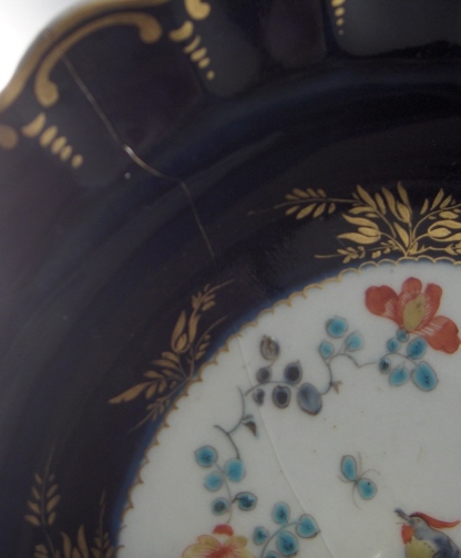 This is a plate made by Worcester around 1760. It is handpainted with the Ho Ho bird aka Sir Joshua Reynolds design which is very elegant and one of the best they produced. The center has the Kakiemon style design of the bird surrounded by flowers in blue, red, yellow and turquoise and the rim is a dark cobalt blue with a nice gold trim. The porcelain is very thin and translucent and a superb example of Worcester porcelain of the 18th century. The plate is in OK condition. It displays beautifully as there is almost zero wear but sadly it has a very long hairline that is not stable and goes most of the way. I will have it restored when I send my next batch to the restorer. The plate is marked with the square fret mark underneath in underglaze blue. It is is 1.125 inches tall and 7.5 inches in diameter. Please email me for more information or other pictures.
