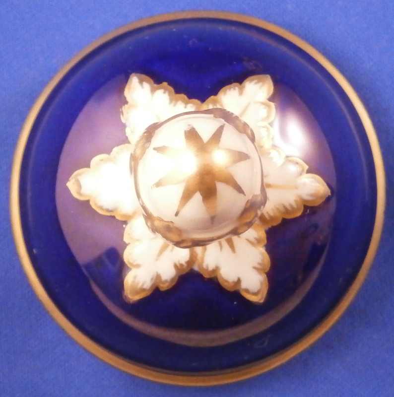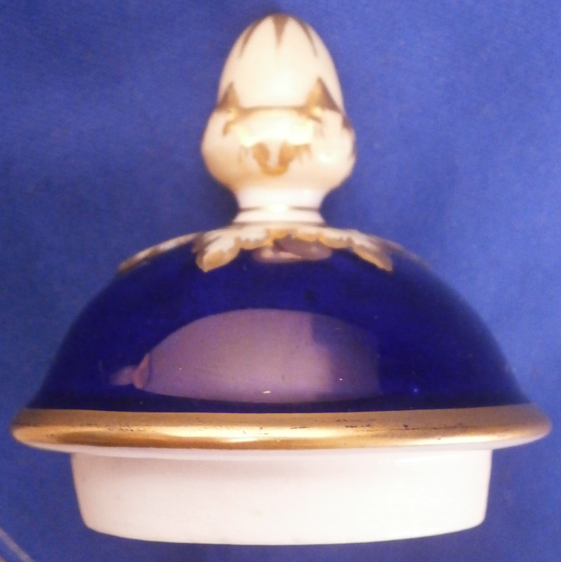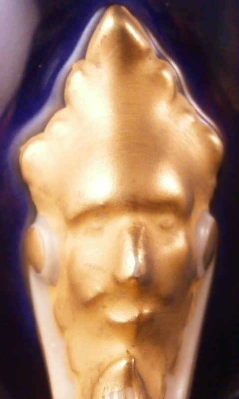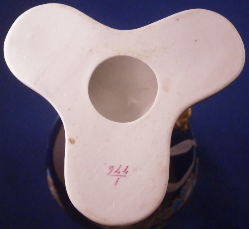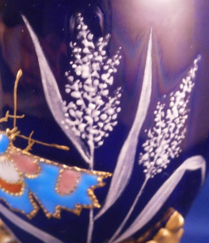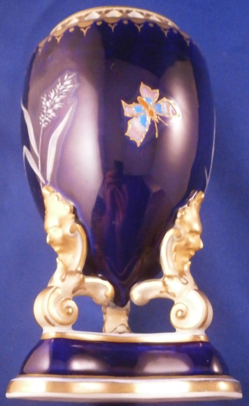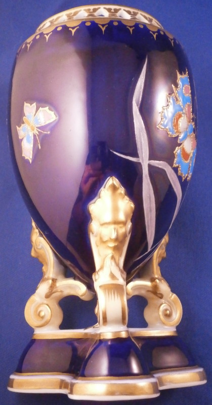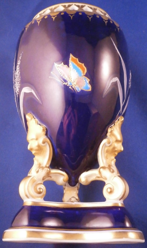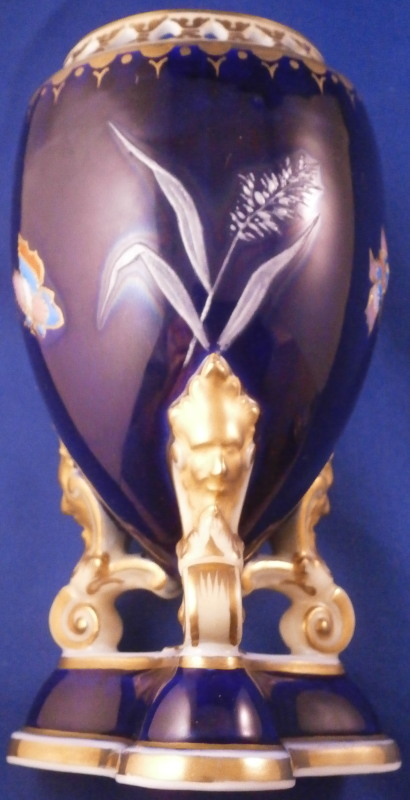 This is an amazing potpourri vase with tis lid made by Worcester during the Grainger period of the late 19th century. The egg shaped main body of the vase sits on three feet that sit on a clover shaped base. The top of the vase has small oval openings all around surrounded by some nice gold trim. The main body as well as the lid and base have a superb cobalt blue ground color to it, the feet each have a mask / face design to the top and a scroll to the bottom with lots of gilding to it. The lid finial is in the shape of an acorn and both the feet and the finial ahve an off white ground color to it. The best part however is the decoration around the main body which consists of raised enameles kind of like pate sur pate or Limoges enamel jsut thicker. There are grasses in white and three colorful butterflies in light blue, pink, white and orange with raised gold highlights. A stunning look and not something one sees too often. Someone really nailed it with the modelling and design on this piece - just stunning! The vase is in perfect condition with just a touch of very minor wear. The underside of the base is marked as shown with the number 1 / 776 in pruple. The entire vase is 7.875 inches tall with a diameter of about 3 inches around the center. I also have a second vase with some minor issues listed on the site if anyone would be interested in a pair. Please email me for more information or other pictures.