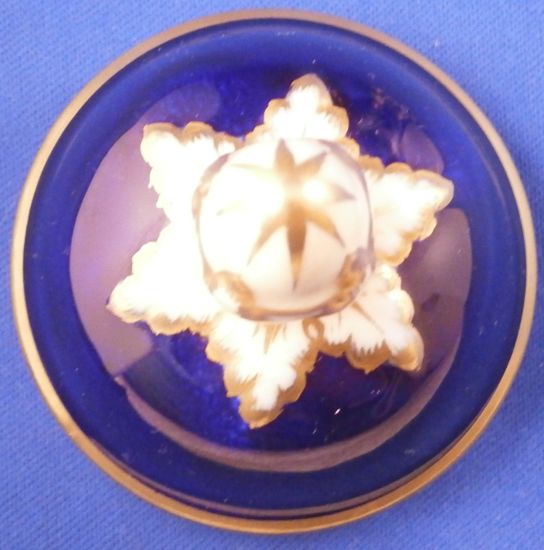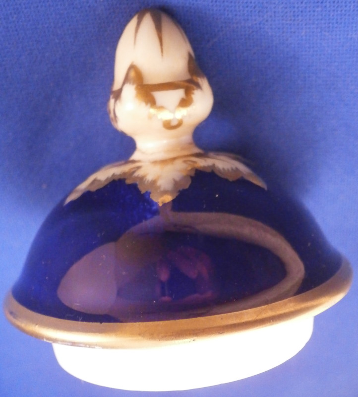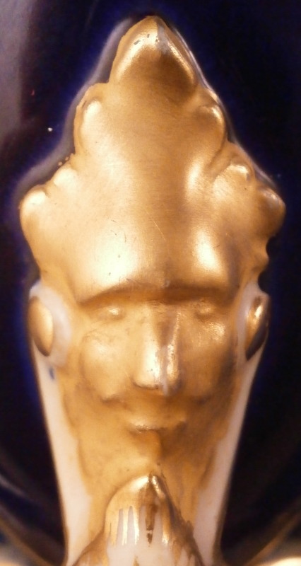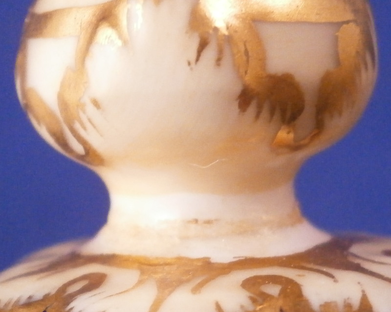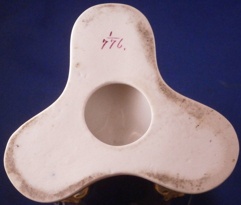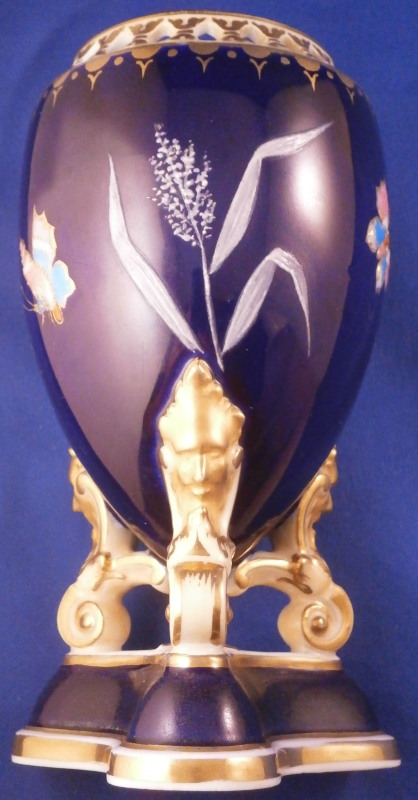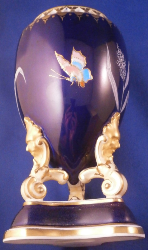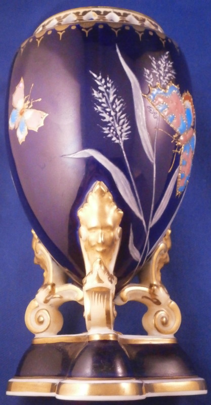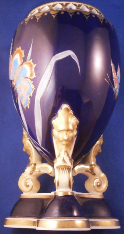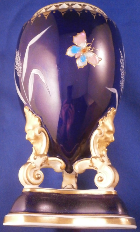 This is an amazing potpourri vase with tis lid made by Worcester during the Grainger period of the late 19th century. The egg shaped main body of the vase sits on three feet that sit on a clover shaped base. The top of the vase has small oval openings all around surrounded by some nice gold trim. The main body as well as the lid and base have a superb cobalt blue ground color to it, the feet each have a mask / face design to the top and a scroll to the bottom with lots of gilding to it. The lid finial is in the shape of an acorn and both the feet and the finial ahve an off white ground color to it. The best part however is the decoration around the main body which consists of raised enameles kind of like pate sur pate or Limoges enamel jsut thicker. There are grasses in white and three colorful butterflies in light blue, pink, white and orange with raised gold highlights. A stunning look and not something one sees too often. Someone really nailed it with the modelling and design on this piece - just stunning! The vase displays perfectly but the finial has been off and reglued, there is a very short and stable hairline to the top edge (between the edge and one of the holes in the rim) and one butterfly has a small chip to the pink enamel color that was colored in a bit to hide it better. Nothing major but it is sadly not entirely perfect anymore. The underside of the base is marked as shown with the number 1 / 776 in purple. The entire vase is 7.875 inches tall with a diameter of about 3 inches around the center. I also have a second vase that is perfect listed on the site if anyone would be interested in a pair. Please email me for more information or other pictures.