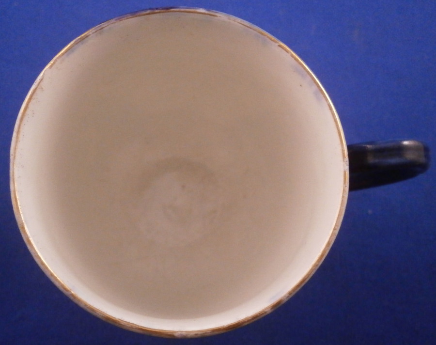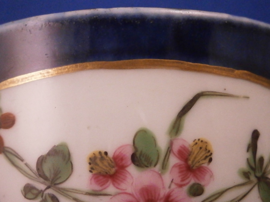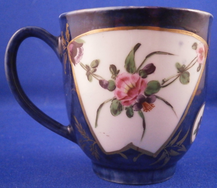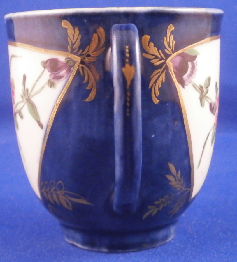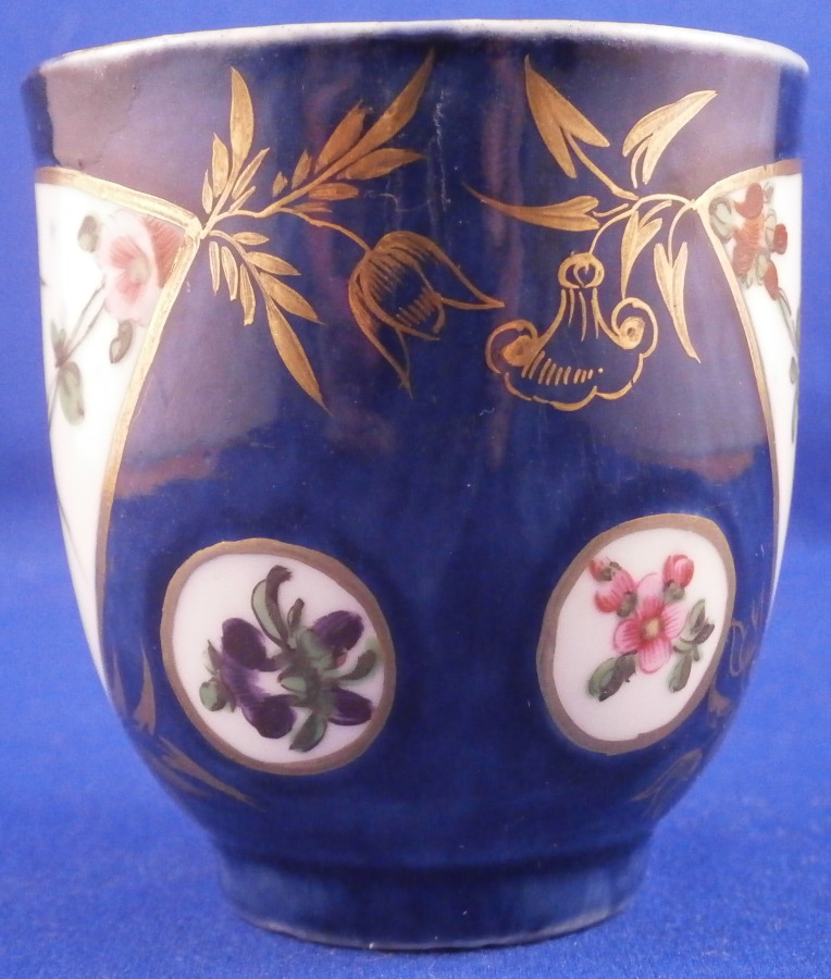 This is a superb early cup made by Worcester around 1770 during their first period. A superb design combination with the two fan shaped hand painted floral panels on white ground and two circular panelswith the rest having an amazing powder blue ground color and some very nice gilding. A stunning combination! The quality of the painting and gilding is superb. It matches almost perfectly with the tea cup and saucer I ahve in this design except for this cup here is missing the little decoration in the gilding in the top center of each fan shaped panel. Almost unoticeable but not a perfect match sadly. The coffee cupis in great condition with some wear to the gilding along the top edge and some nibbles to the foot. The cup is 2.5 inches tall and has a diameter of 2.35 inches. It is not marked but this design is often found with their rare red crescent mark which I have owned before. Definitely amde by Worcester during this period! Please email me for more information or other pictures.