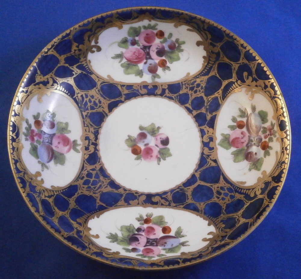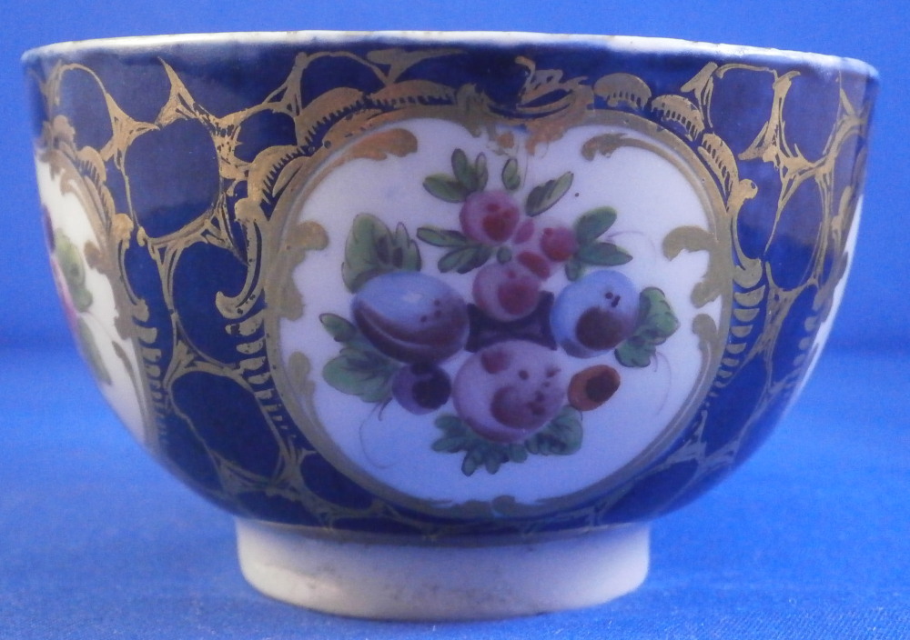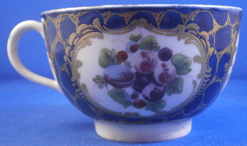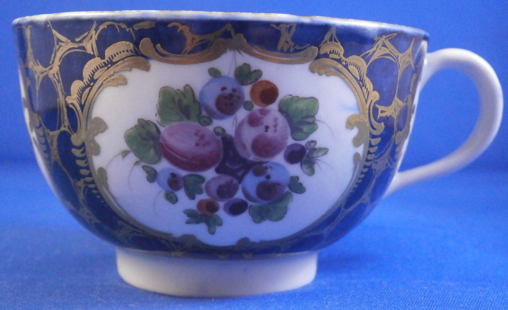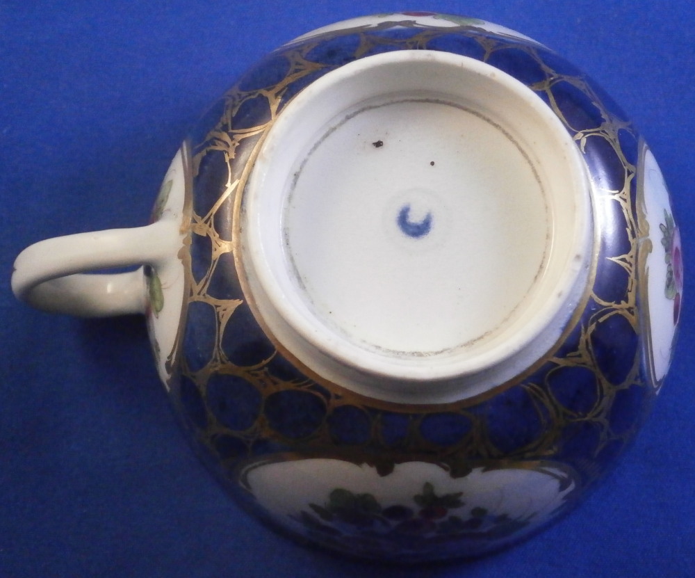 This is a superb cup and saucer made by Worcester in the 18th century. The set is hand painted with four panels of fruit arrangements on white ground with another panel in the center of th saucer and a fruit design to the bottom inside of the cup. The rest of the pieces having a nice blue ground to them that is a bit mottled and a fancy gold trim all over that which reminds me of spider webs. Fancy gilding around each fruit panel and dentil gold trim to the edges. Handle to the cup with a gold design to it as well. A very unusual and elegant set. The fruit remind of of James Giles painted pieces but could also be the spotted fruit painter. The cup & saucer are in superb condition with with some wear to the dentil gilding of the cup edge. A firing crack to the center of the saucer from when it was made and glazed over. The saucer is 1.125 inches tall and has a diameter of 5.25 inches. The cup is 2.125 inches tall with a diameter of 3.375 inches. Both are marked with their crescent moon mark in under glaze blue as shown which is nice as many of these sets are unmarked. Please email me for more information or other pictures.