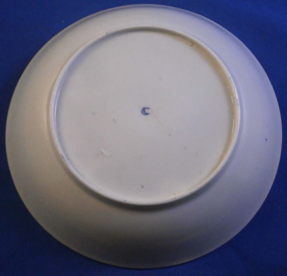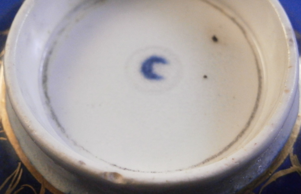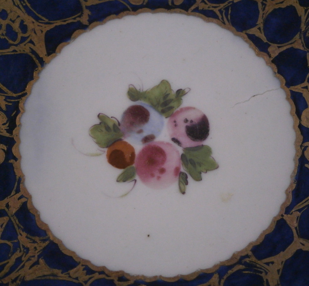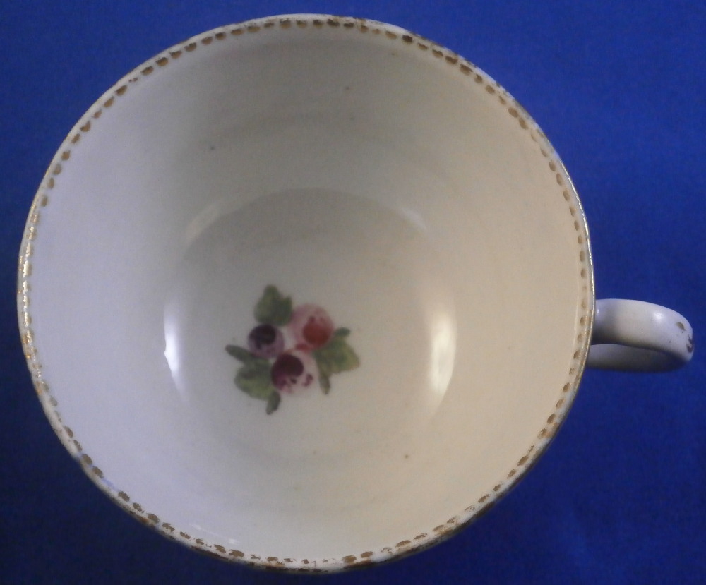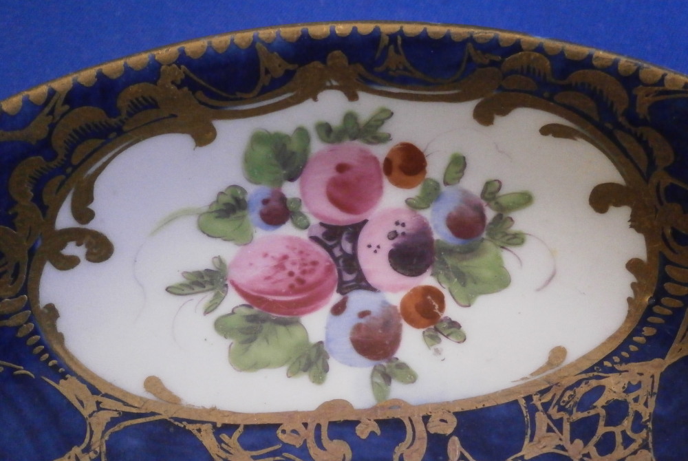 This is a superb cup and saucer made by Worcester in the 18th century. The set is hand painted with four panels of fruit arrangements on white ground with another panel in the center of th saucer and a fruit design to the bottom inside of the cup. The rest of the pieces having a nice blue ground to them that is a bit mottled and a fancy gold trim all over that which reminds me of spider webs. Fancy gilding around each fruit panel and dentil gold trim to the edges. Handle to the cup with a gold design to it as well. A very unusual and elegant set. The fruit remind of of James Giles painted pieces but could also be the spotted fruit painter. The cup & saucer are in superb condition with with some wear to the dentil gilding of the cup edge. A firing crack to the center of the saucer from when it was made and glazed over. The saucer is 1.125 inches tall and has a diameter of 5.25 inches. The cup is 2.125 inches tall with a diameter of 3.375 inches. Both are marked with their crescent moon mark in under glaze blue as shown which is nice as many of these sets are unmarked. Please email me for more information or other pictures.